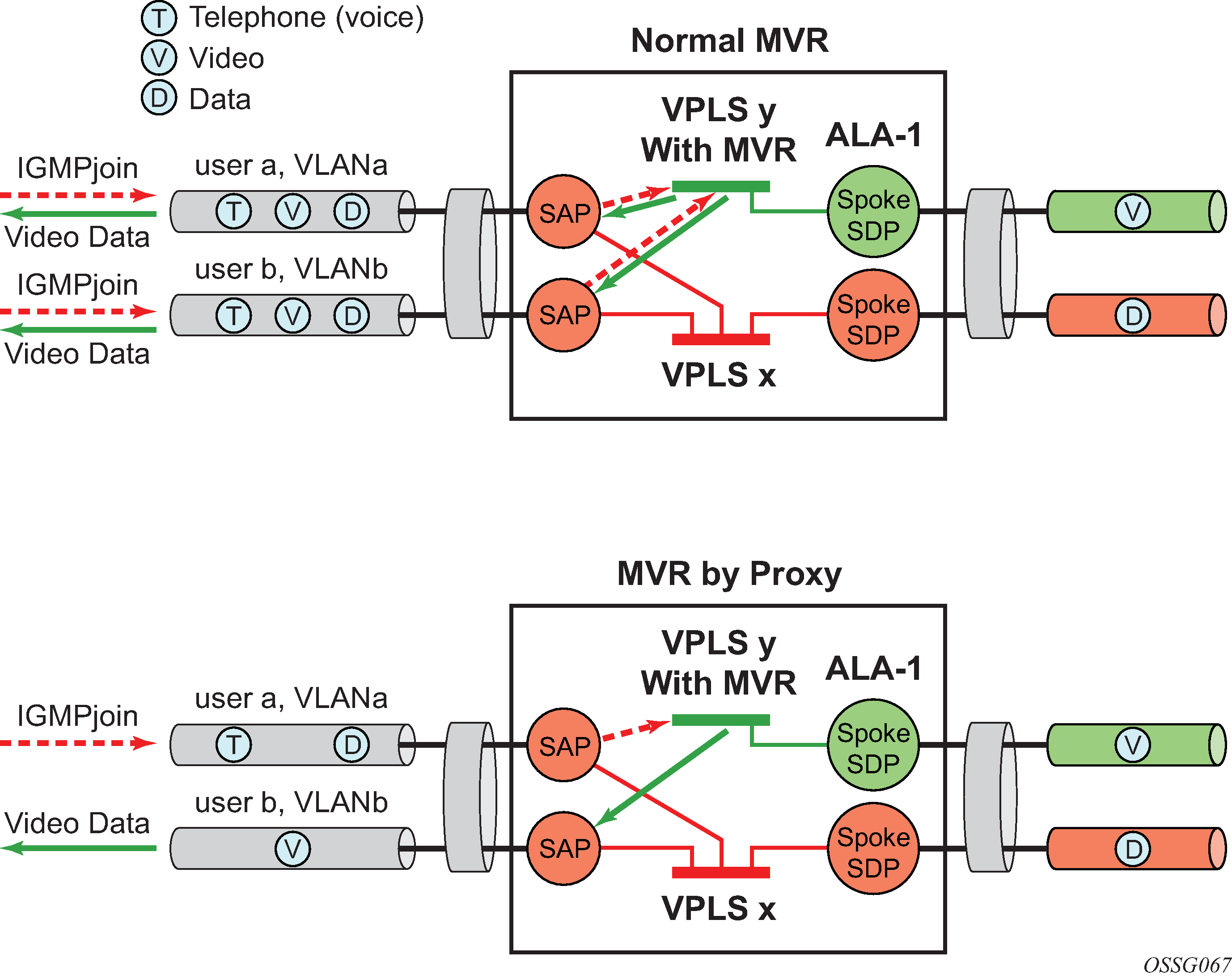 MVR by proxy — In some situations, the multicast traffic should not be copied from the MVR VPLS to the SAP on which the IGMP message was received (standard MVR behavior) but to another SAP. This is called MVR by proxy.
