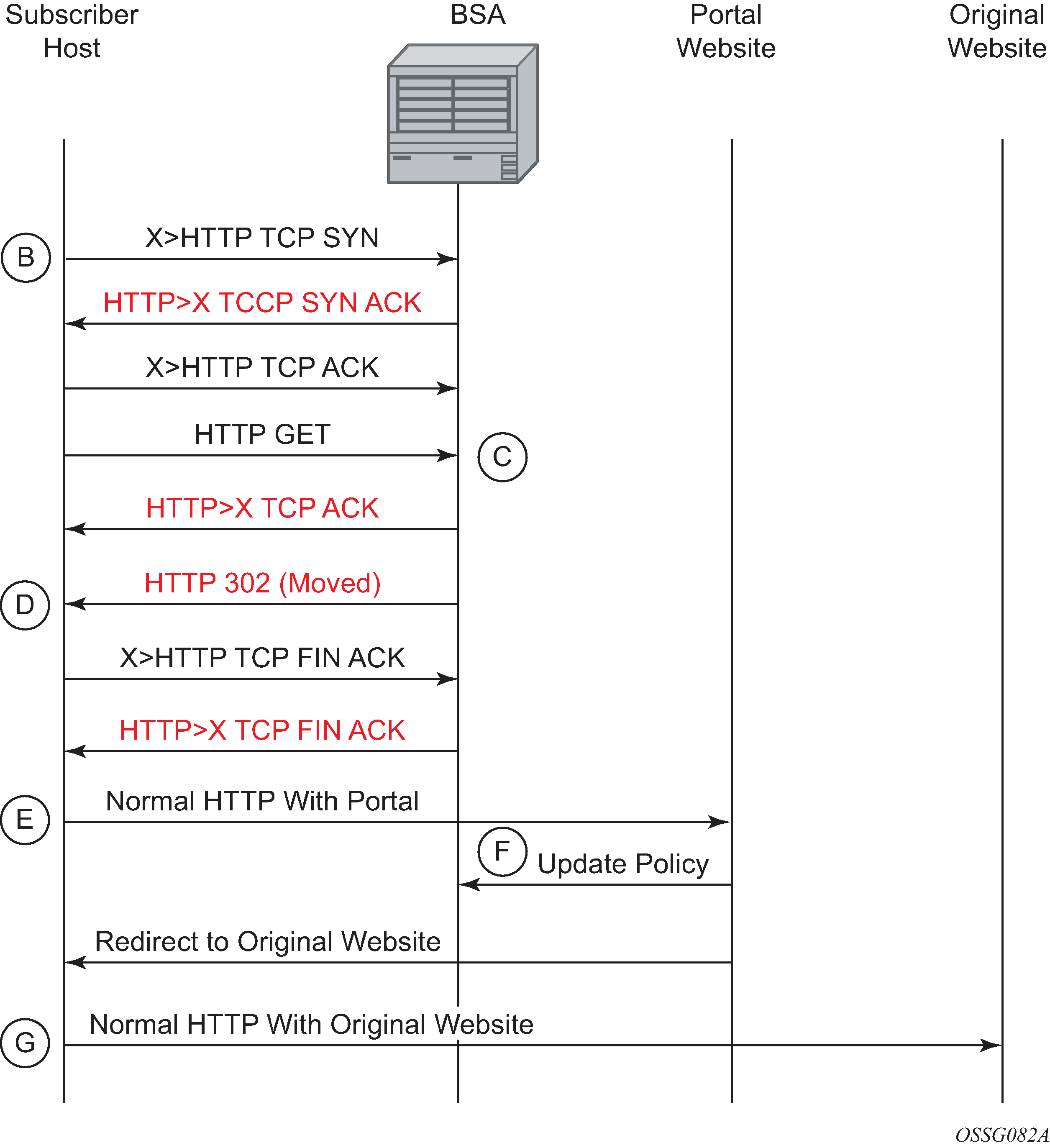 The 7450 ESS or 7750 SR intercepts the HTTP GET from the subscriber and respond with an HTTP 302 (temporarily moved) with the URL configured in the filter entry. This URL can contain some variables, notably the customer IP and MAC addresses to allow the portal to create an entry for the customer. The original requested URL is also included to redirect the client site back to the original requested site when the process is done.