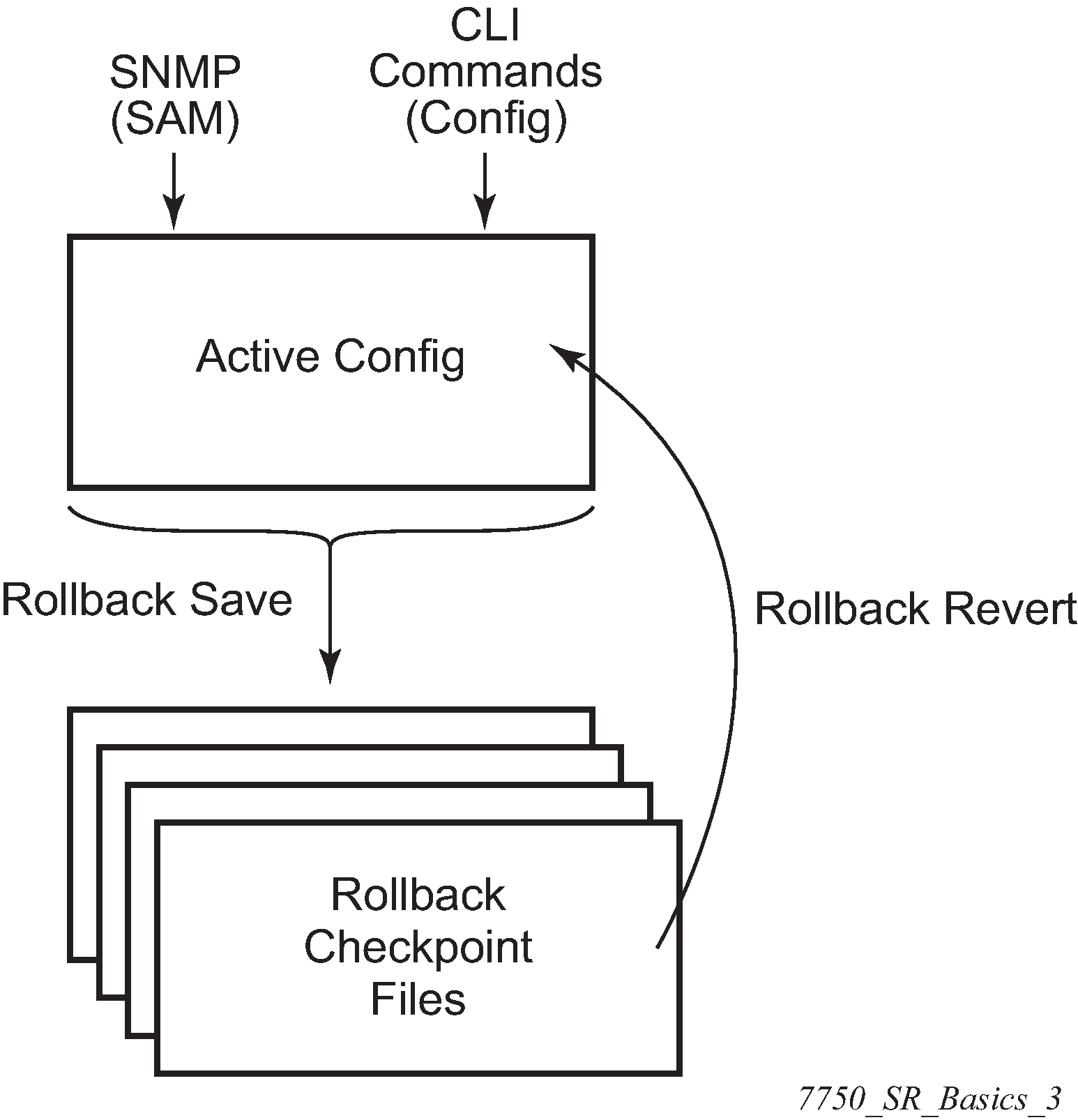 By default, the SR OS automatically creates a new rollback checkpoint after a commit operation. The rollback checkpoint includes the new configuration changes made by the commit. An optional no-checkpoint keyword can be used to prevent the auto-creation of a rollback checkpoint after a commit. If the commit fails, no new rollback checkpoint is created.