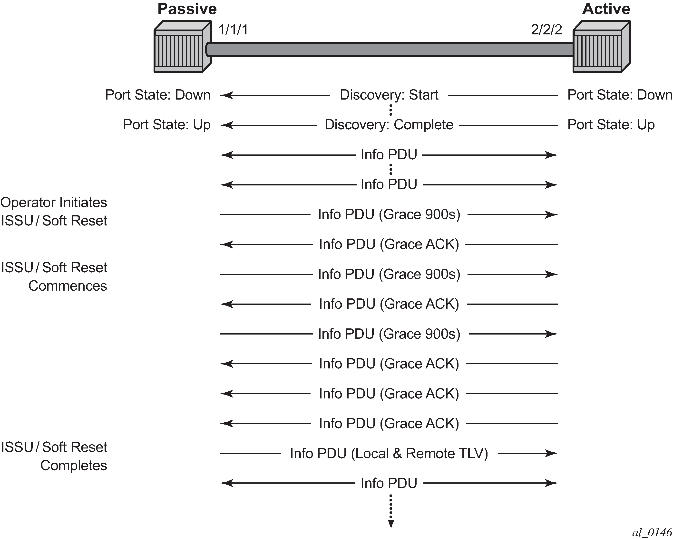 The following basic protocol flows demonstrate the interaction between passive/active and active/active peer combinations supporting the Grace TLV. In the following figure, the passive node is entering an ISSU on a node that supports soft reset capabilities.
