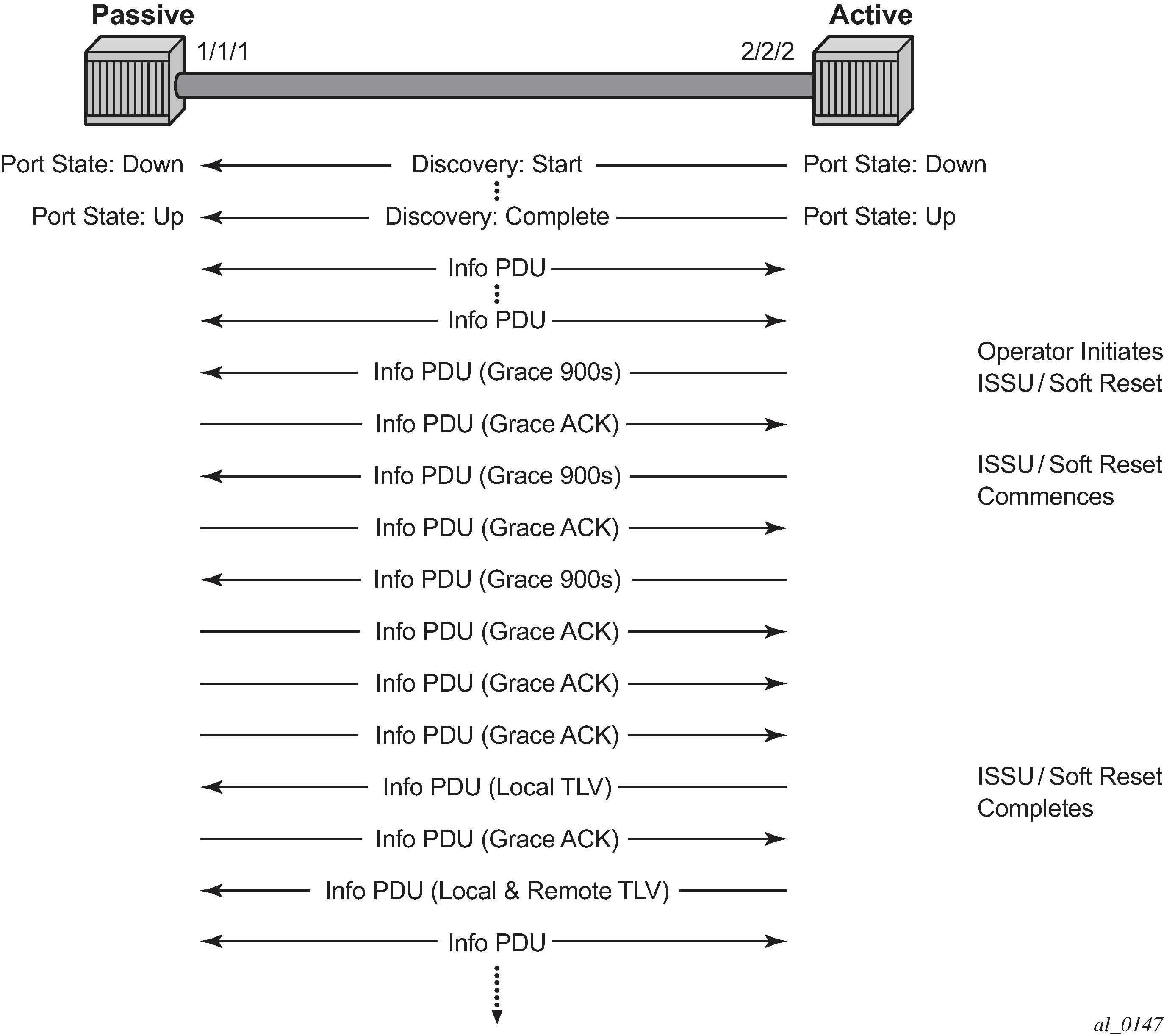 The difference between Grace TLV passive node with soft reset and Grace TLV active node with soft reset is subtle but important. When an active node performs this function, it generates an Informational TLV with the Local TLV following the successful soft reset. When the active node receives the Information PDU with the Grace Ack, it sends its own Information PDU with both Local and Remote TLV completed, which completes the protocol restart. When a passive node is reset, the passive port waits to receive the 802.3ah OAM protocol before sending its own Information PDU with both the Local and Remote TLV, completing the protocol restart.