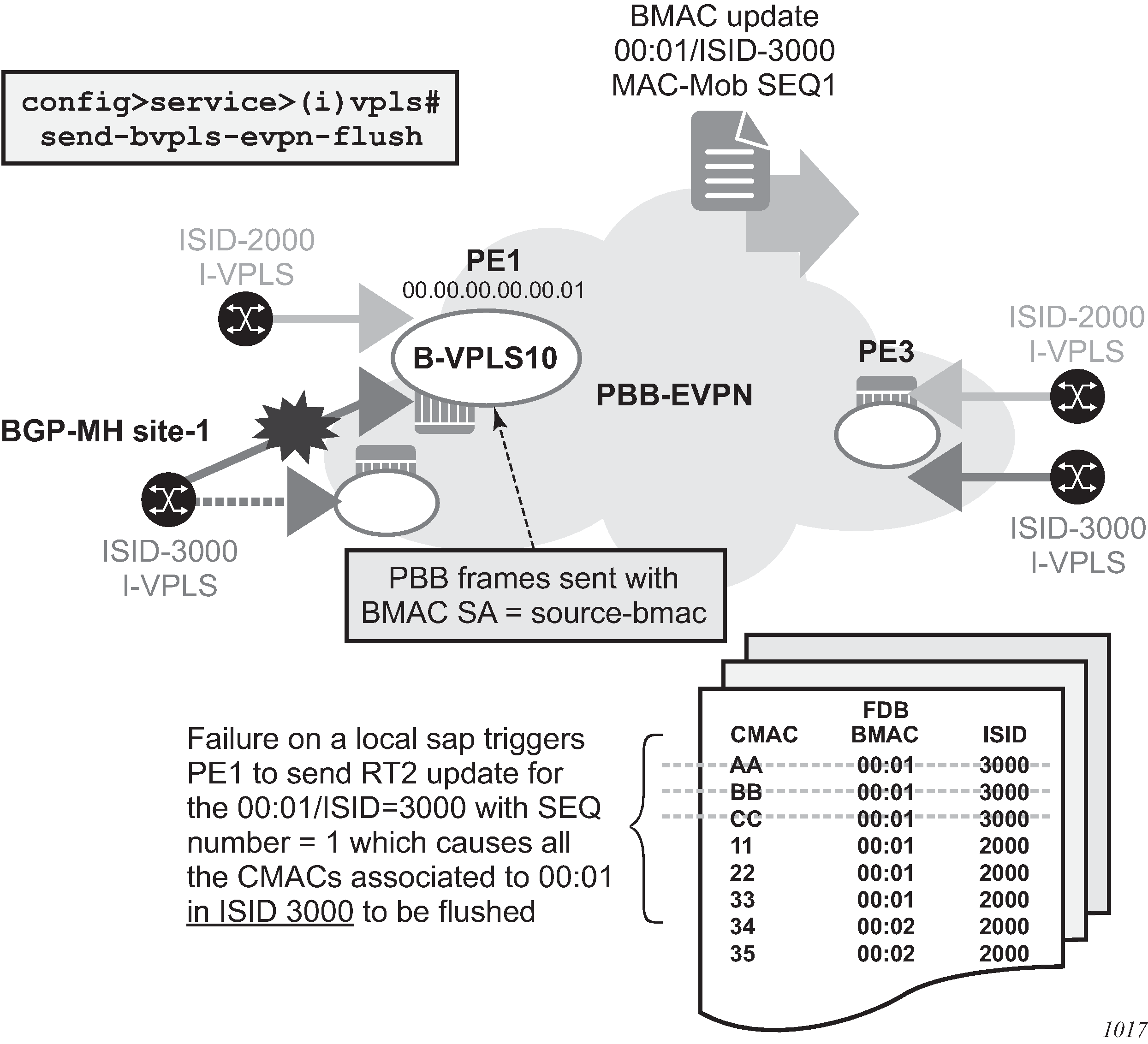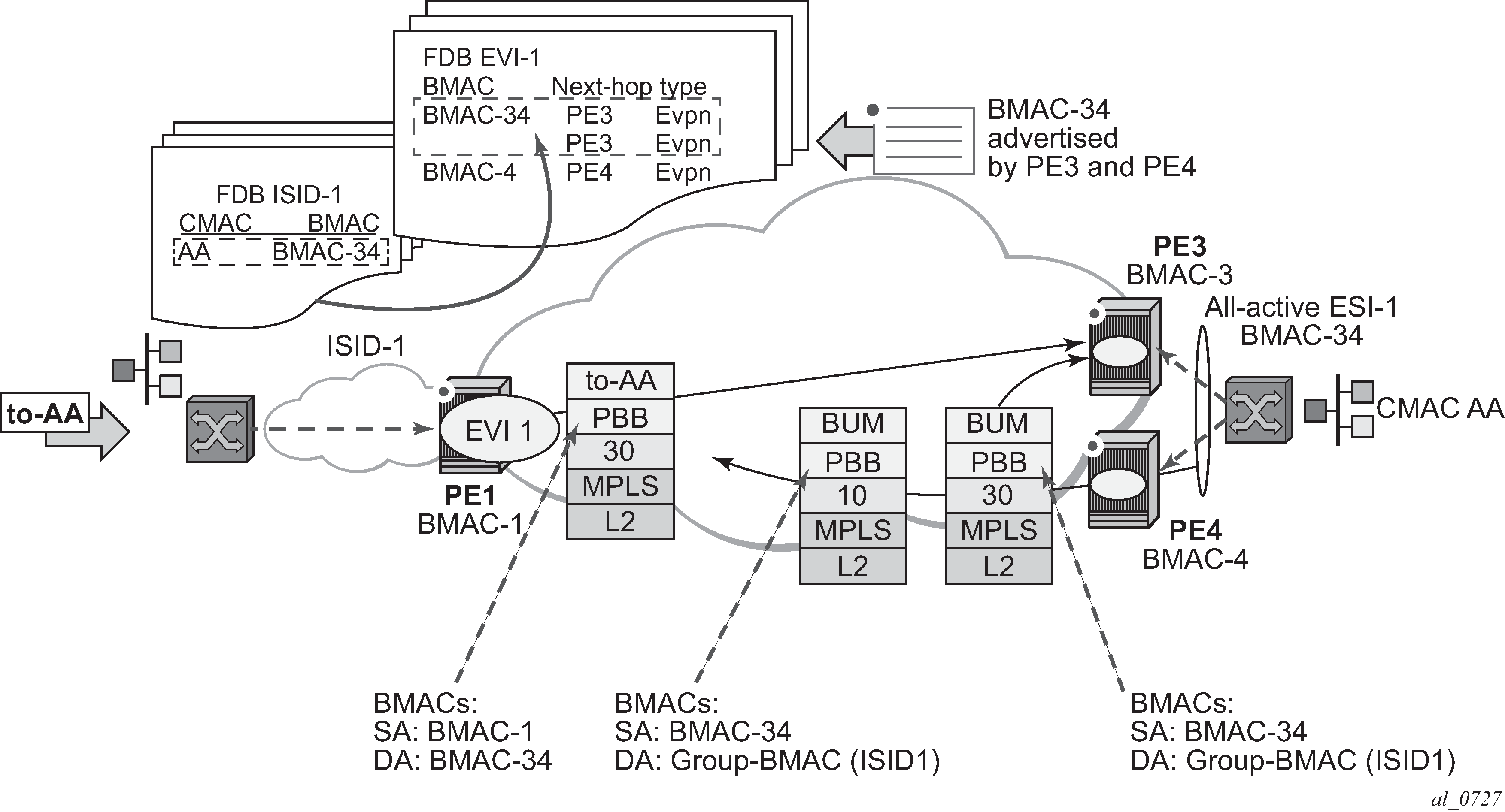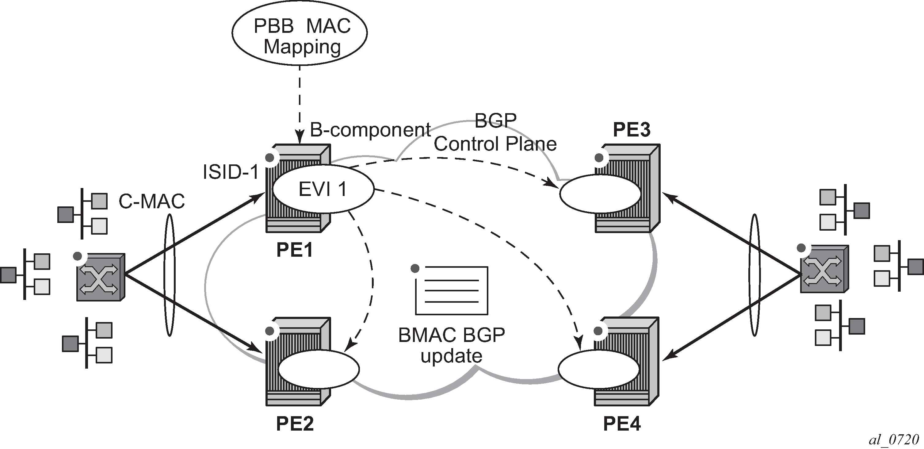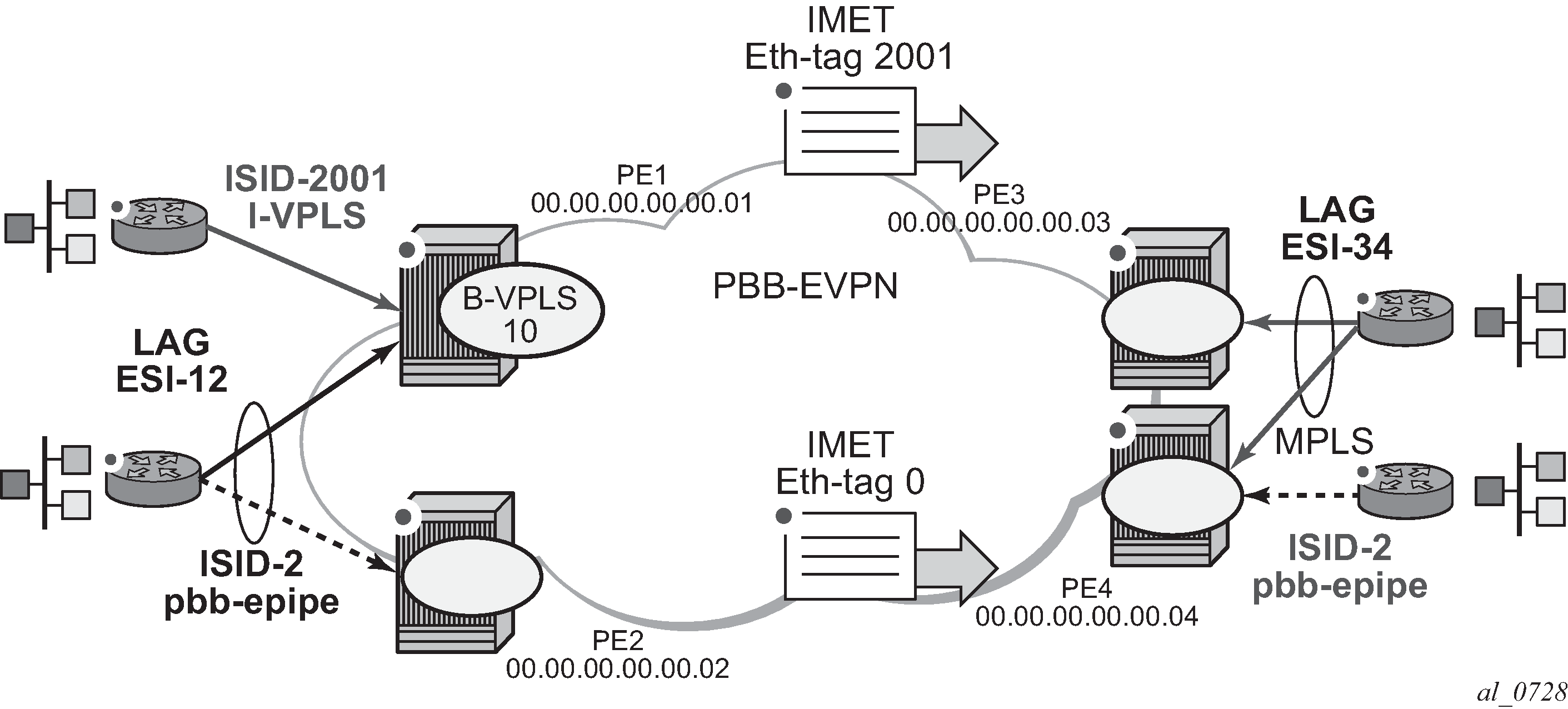 PBB-EVPN is a combination of 802.1ah PBB and RFC 7432 EVPN and reuses the PBB-VPLS service model, where BGP-EVPN is enabled in the B-VPLS domain. EVPN is used as the control plane in the B-VPLS domain to control the distribution of B-MACs and setup per-ISID flooding trees for I-VPLS services. The learning of the C-MACs, either on local SAPs/SDP bindings or associated with remote B-MACs, is still performed in the data plane. Only the learning of B-MACs in the B-VPLS is performed through BGP.
