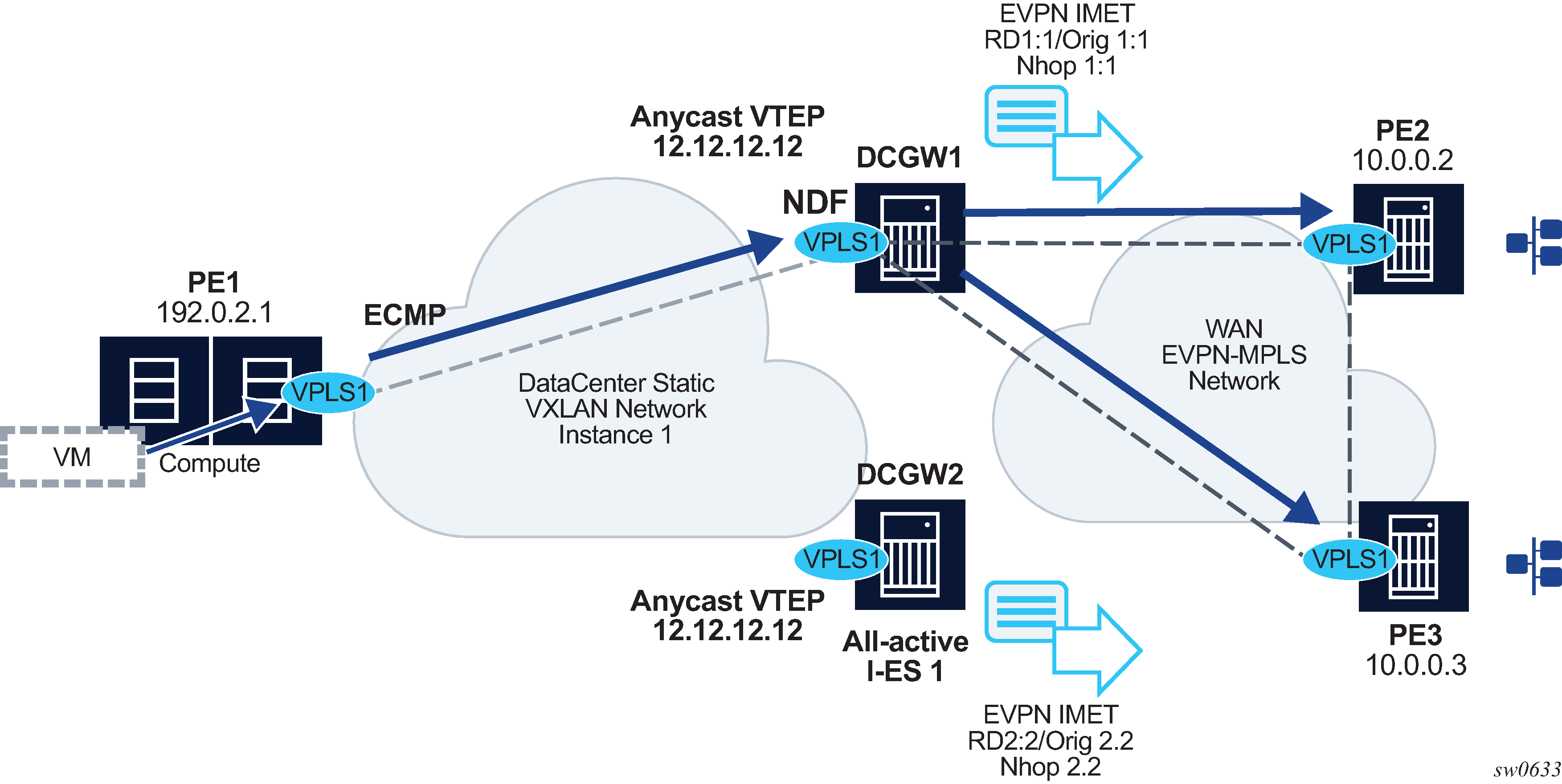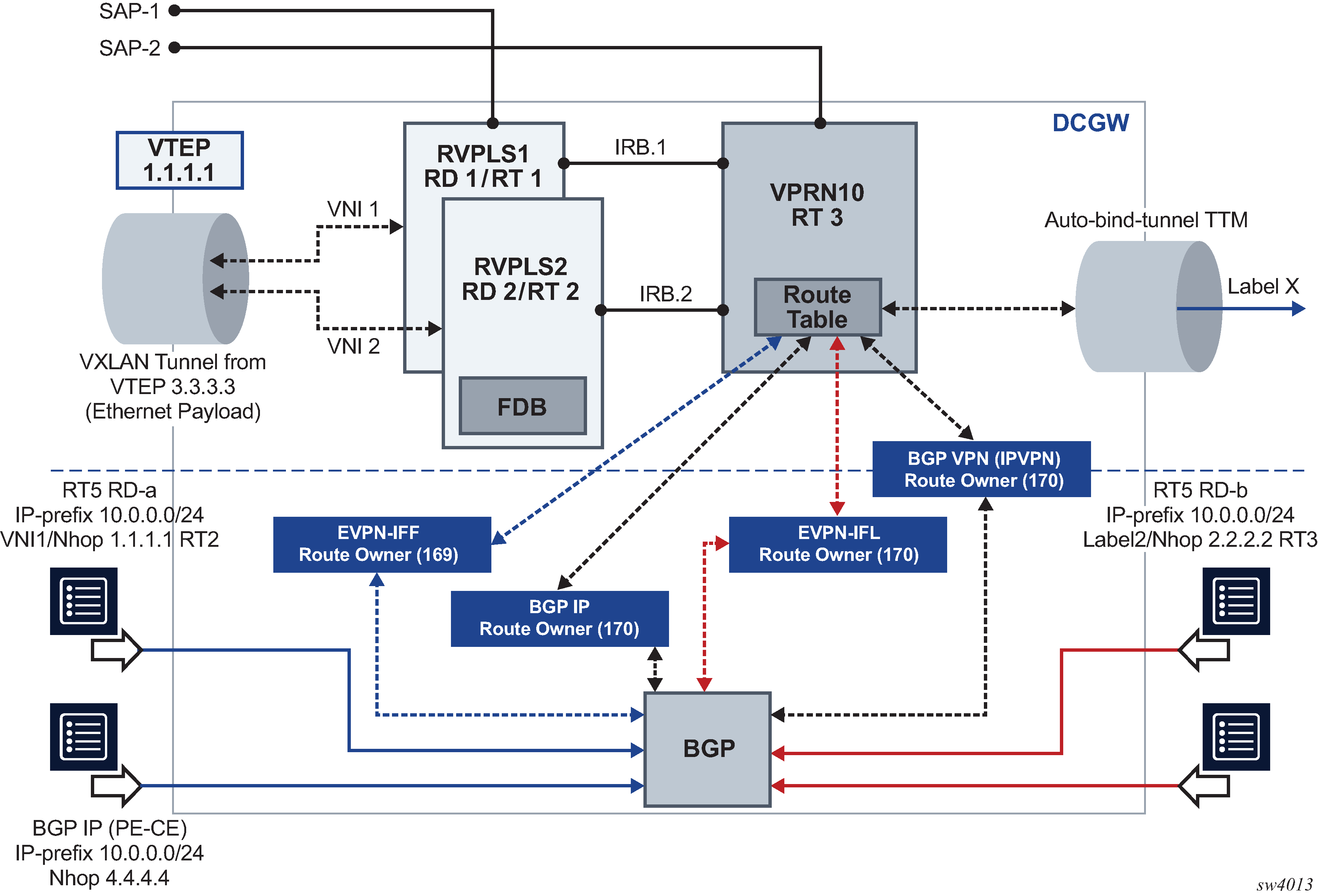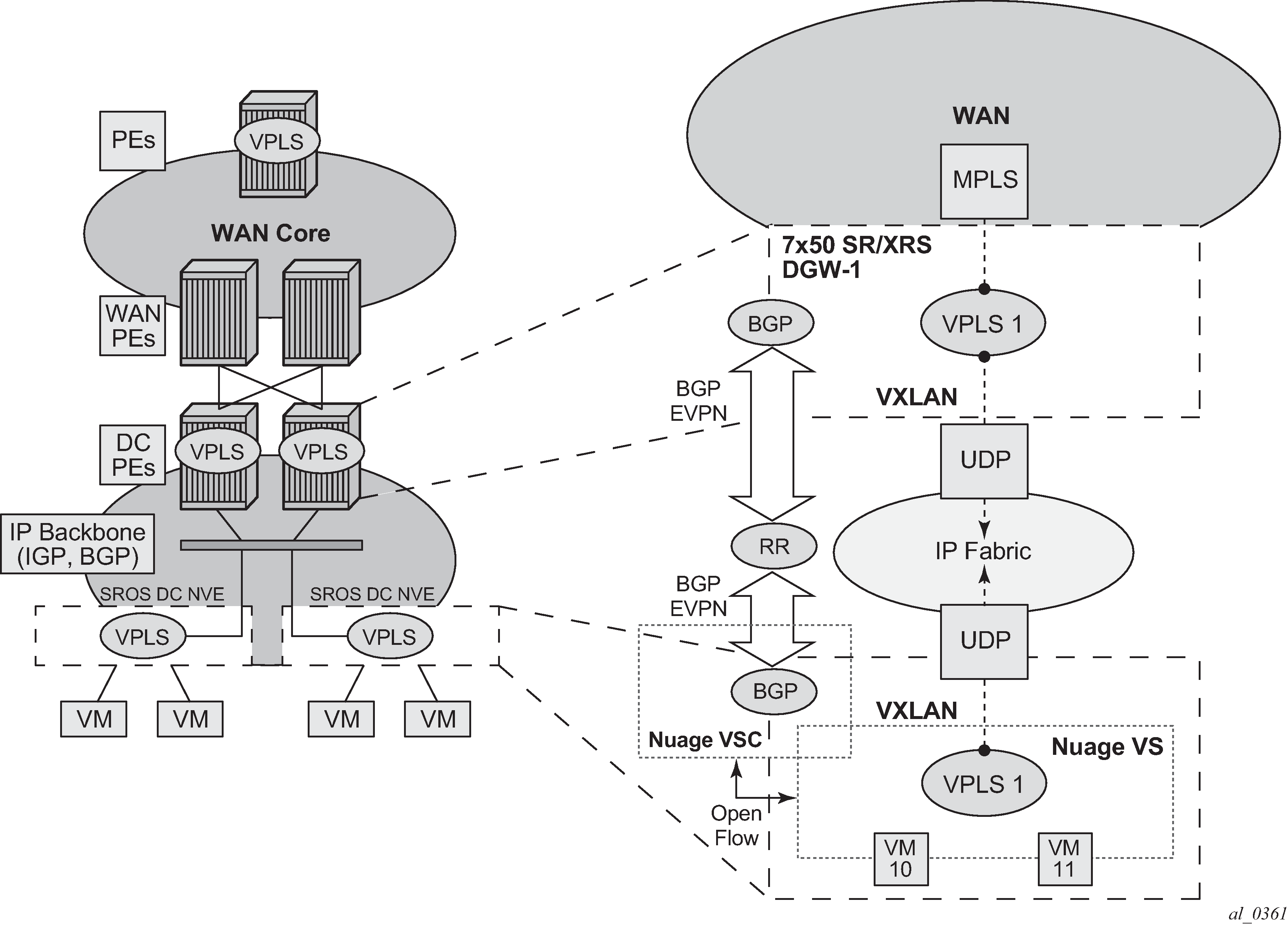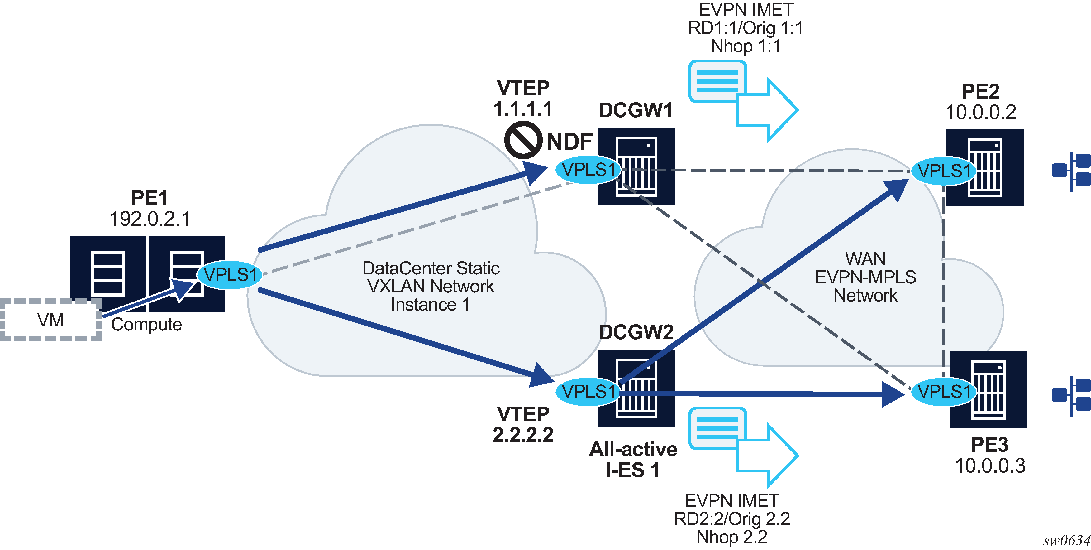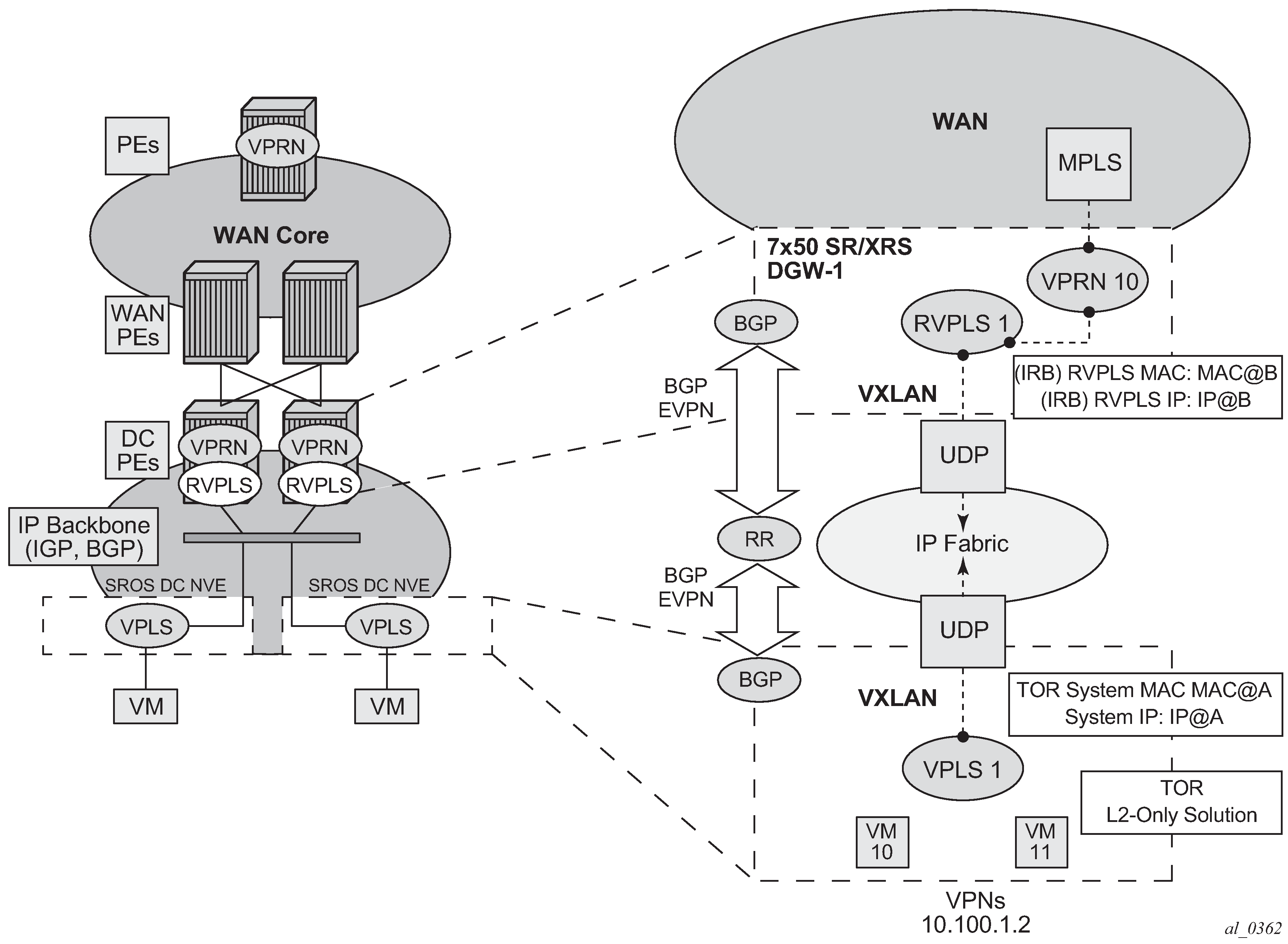 EVPN for VXLAN overlay tunnels (EVPN-VXLAN), being the Data Center Gateway (DGW) function, is the main application for this feature. In this application, VXLAN is expected within the Data Center and VPLS SDP bindings or SAPs are expected for WAN connectivity. R-VPLS and VPRN connectivity to the WAN is also supported.