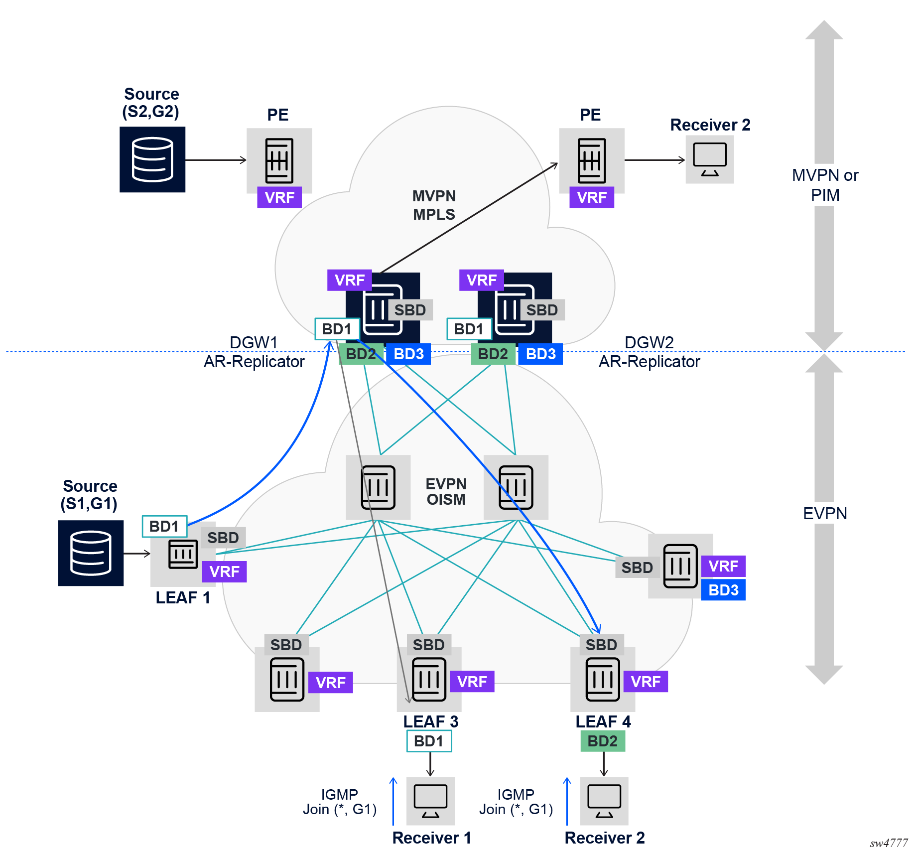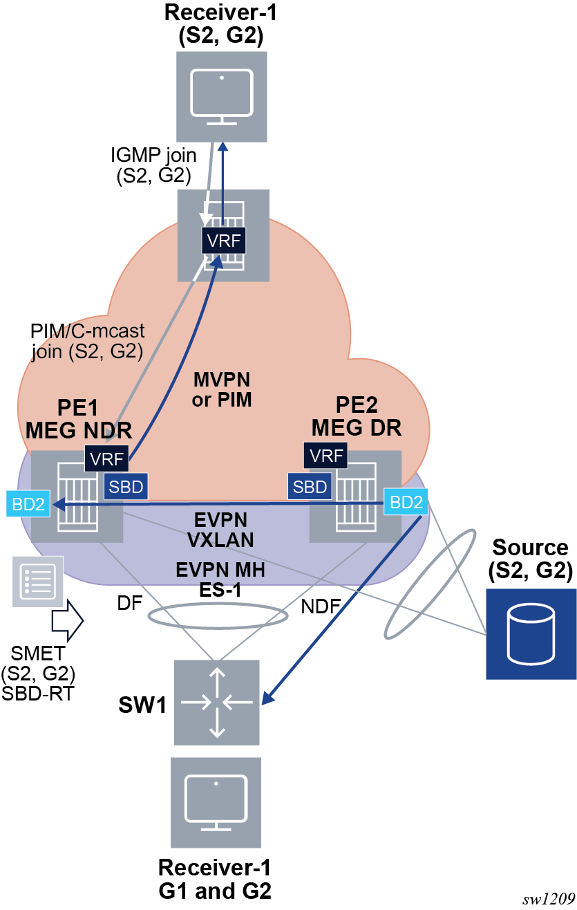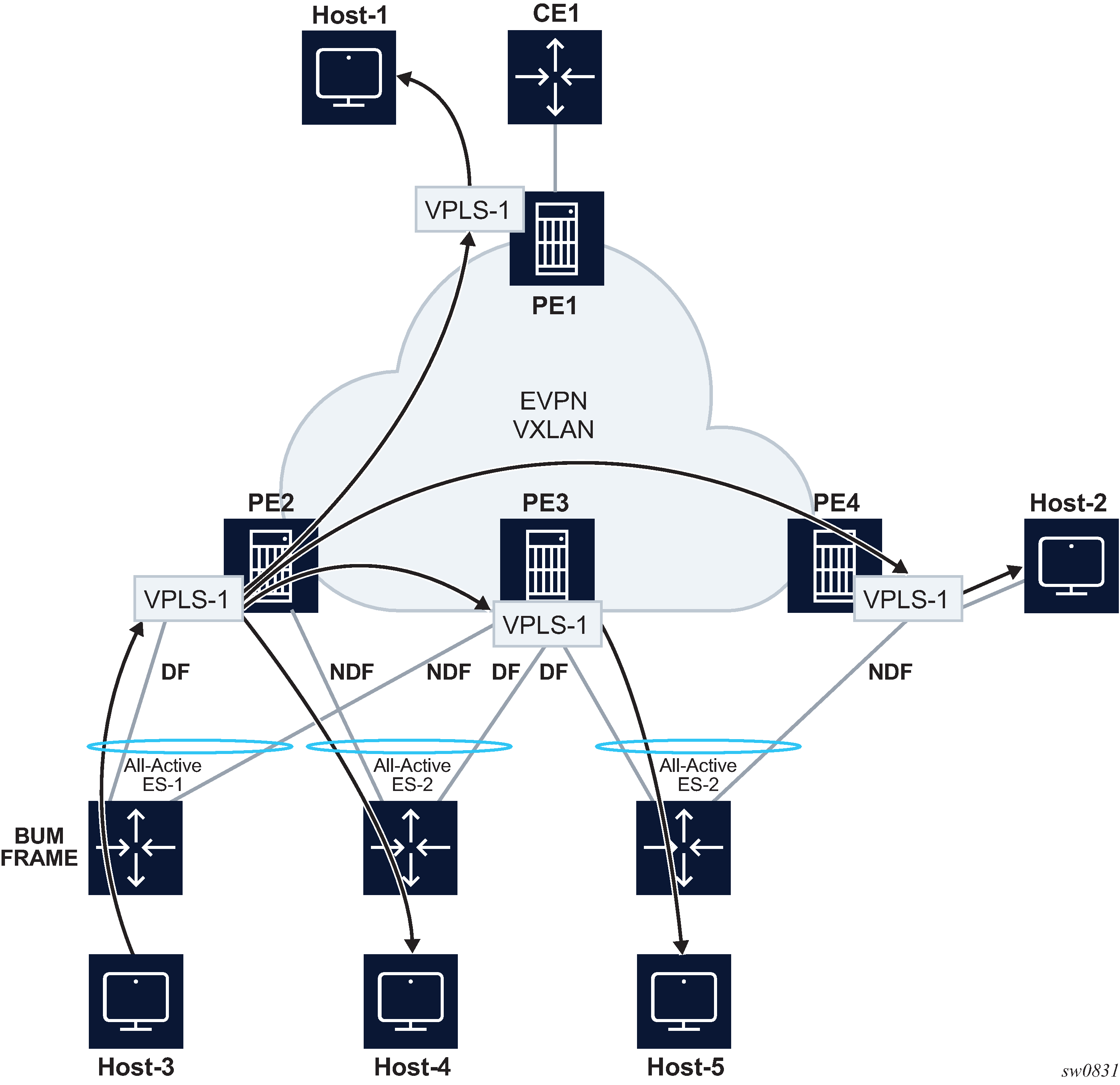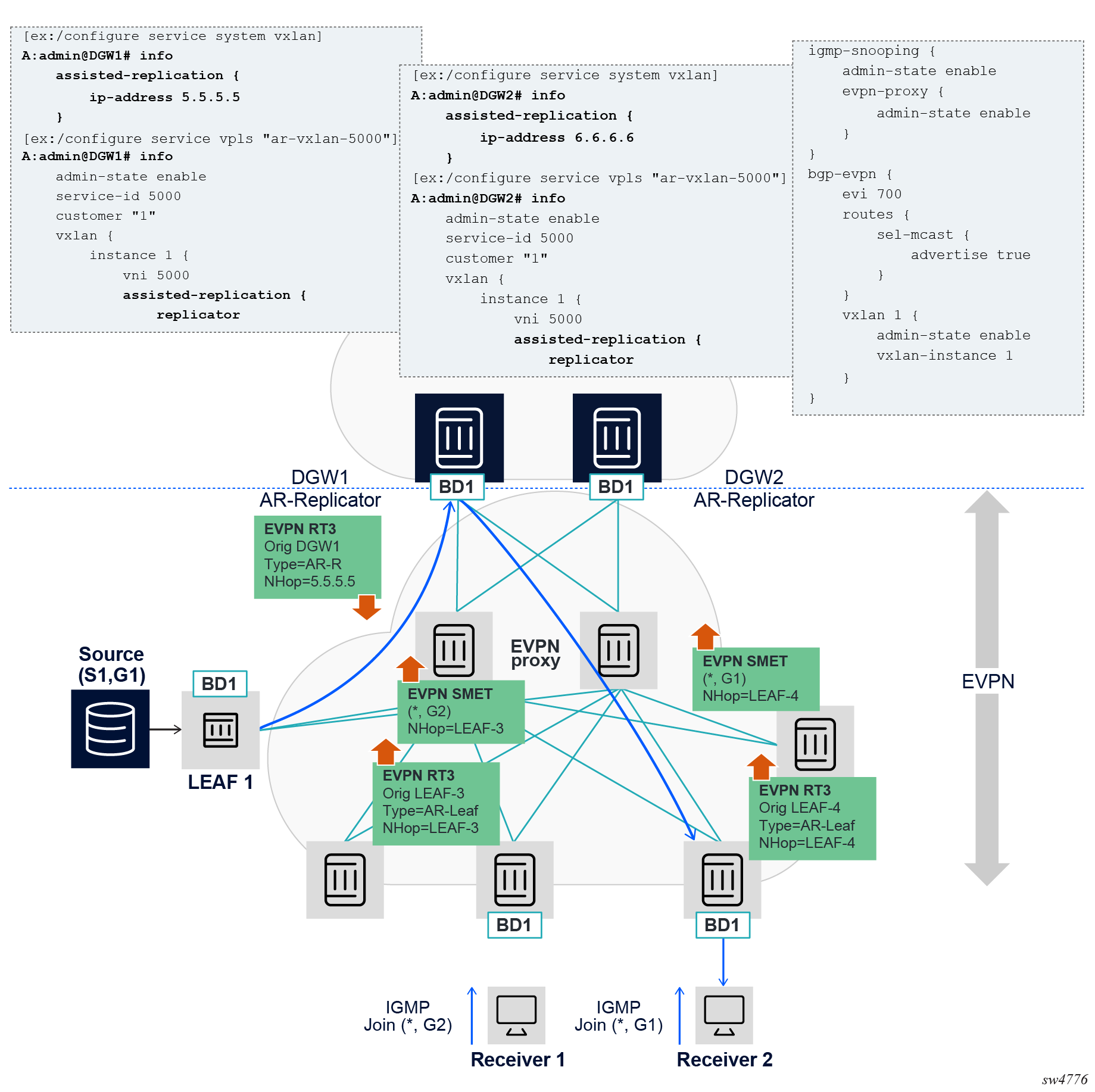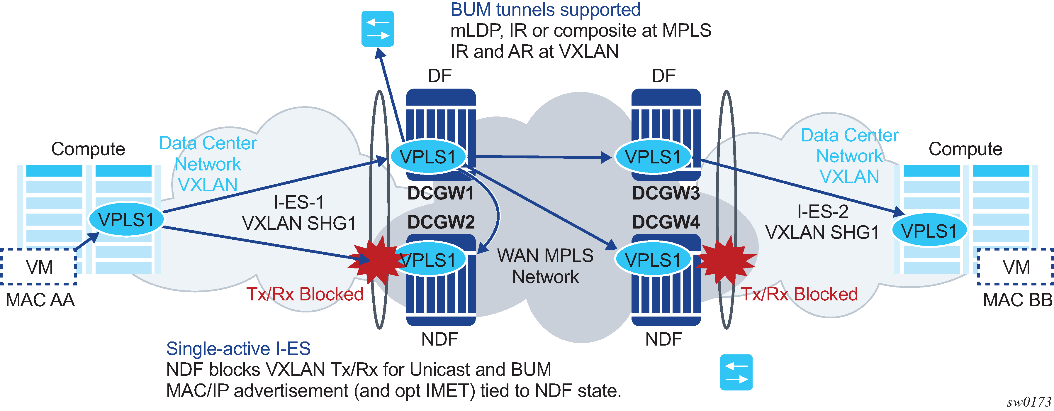 EVPN for VXLAN overlay tunnels (EVPN-VXLAN), being the Data Center Gateway (DGW) function, is the main application for this feature. In this application, VXLAN is expected within the Data Center and VPLS SDP bindings or SAPs are expected for WAN connectivity. R-VPLS and VPRN connectivity to the WAN is also supported.