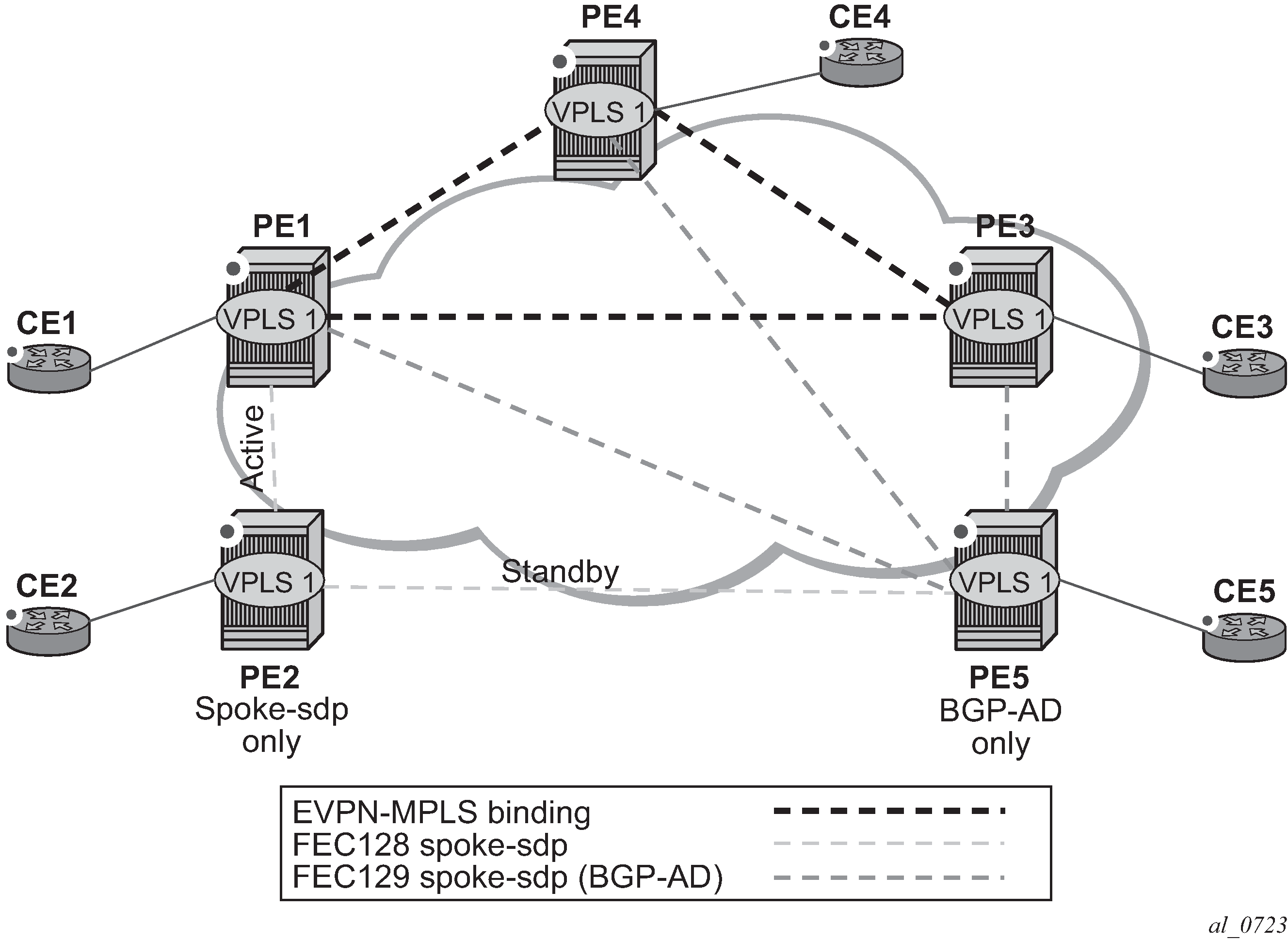 In the following configuration example, PE-70 and PE-73 are part of the same single-active multihoming, Ethernet-segment ESI-7413. In this case, the CE is connected to PE-70 and PE-73 through spoke-SDPs 4:74 and 34:74, respectively.