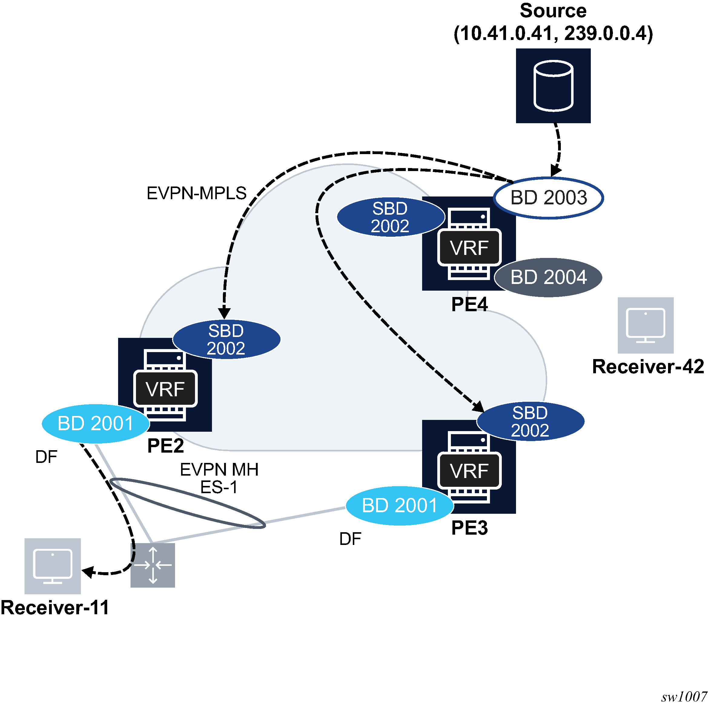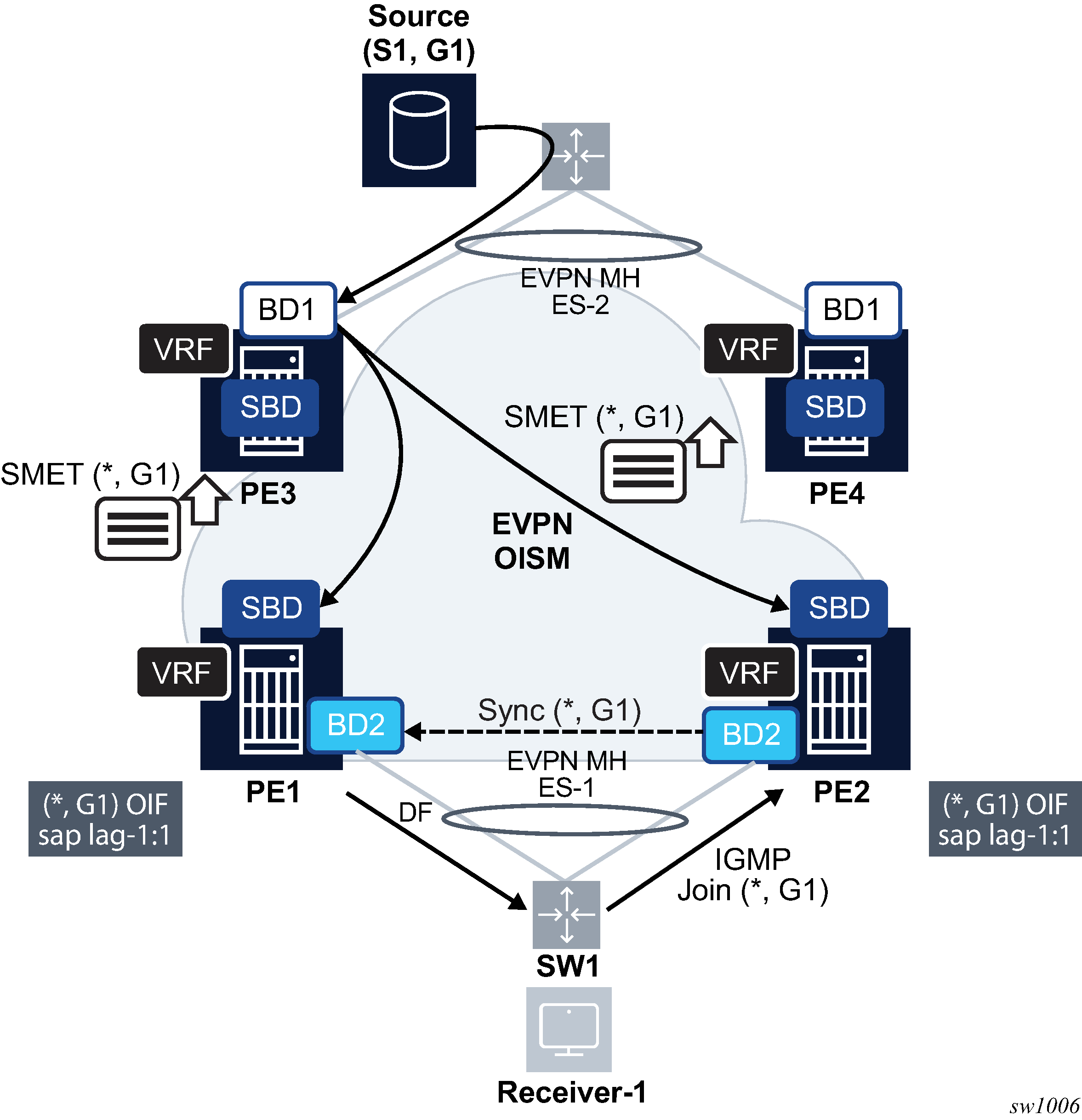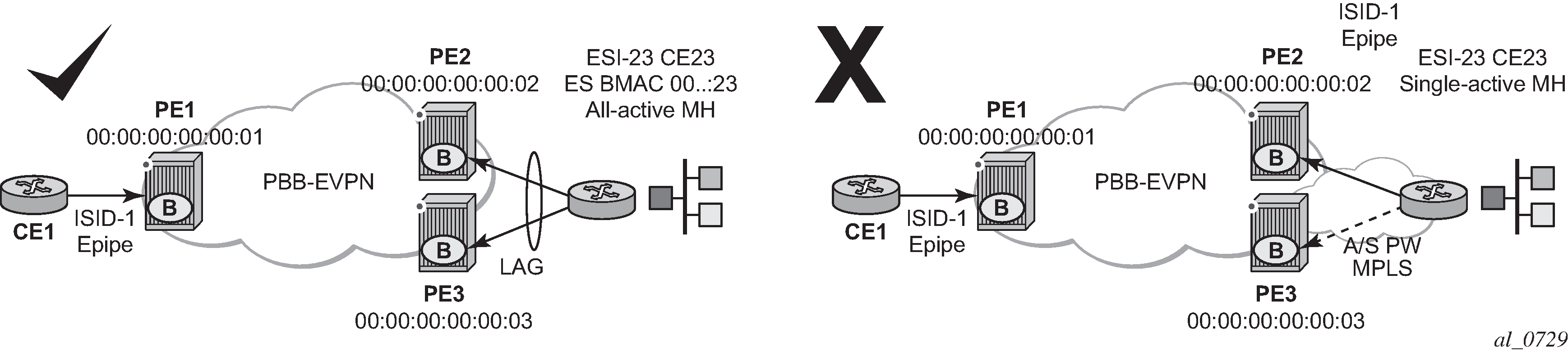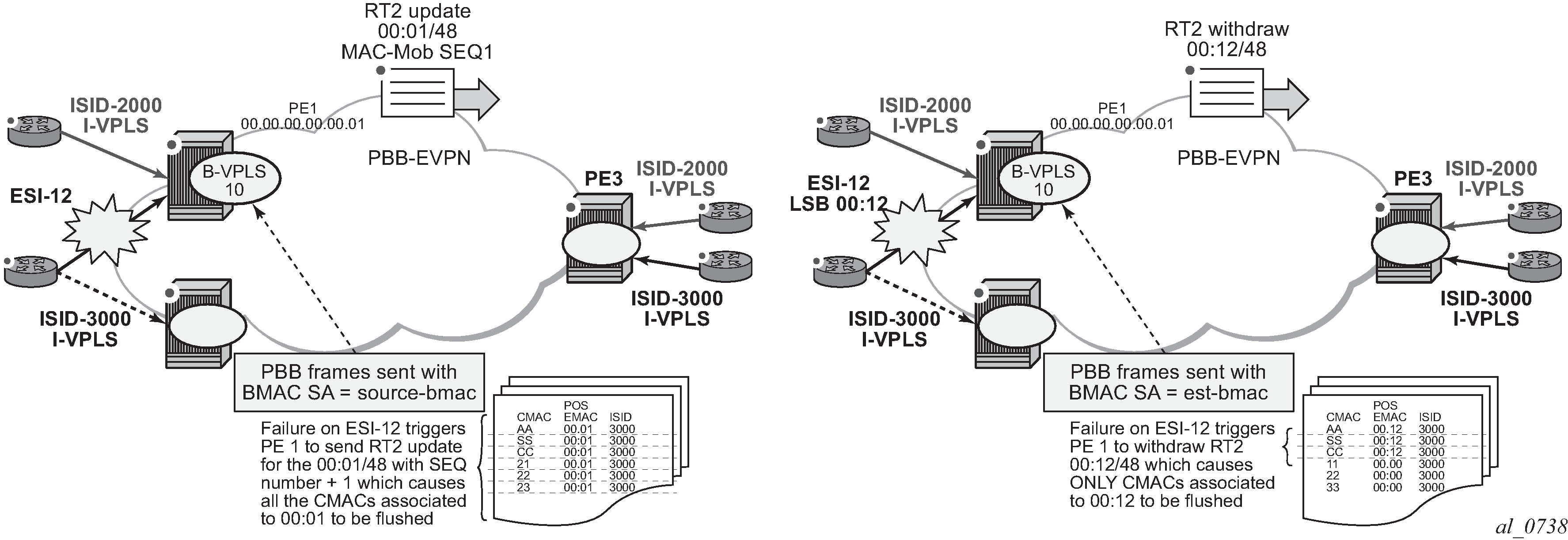 The combination of the pbb source-bmac and the Ethernet-segment source-bmac-lsb create the same BMAC for all the packets sourced from both PE-1 and PE-2 for Ethernet-segment ‟ESI-71”.
