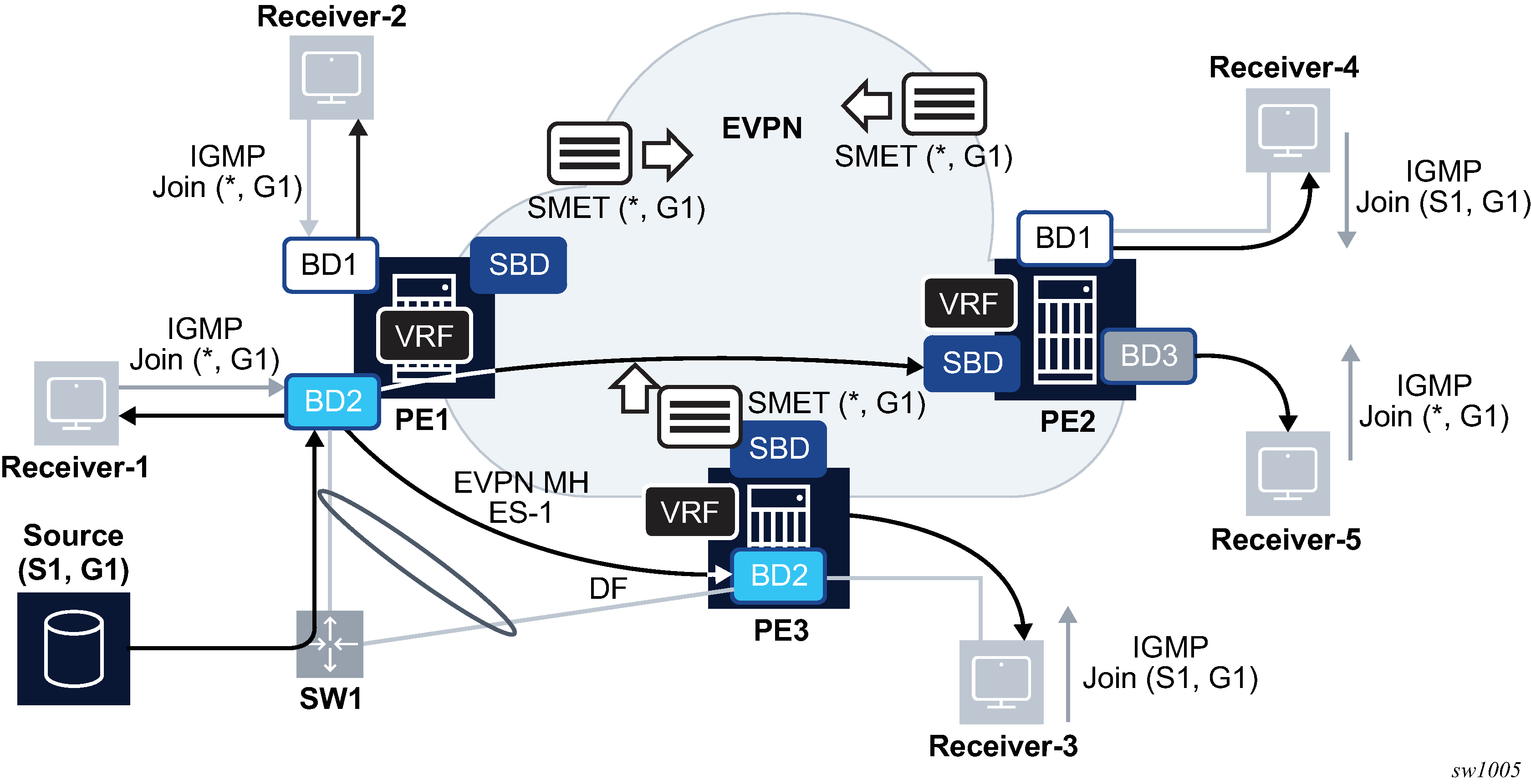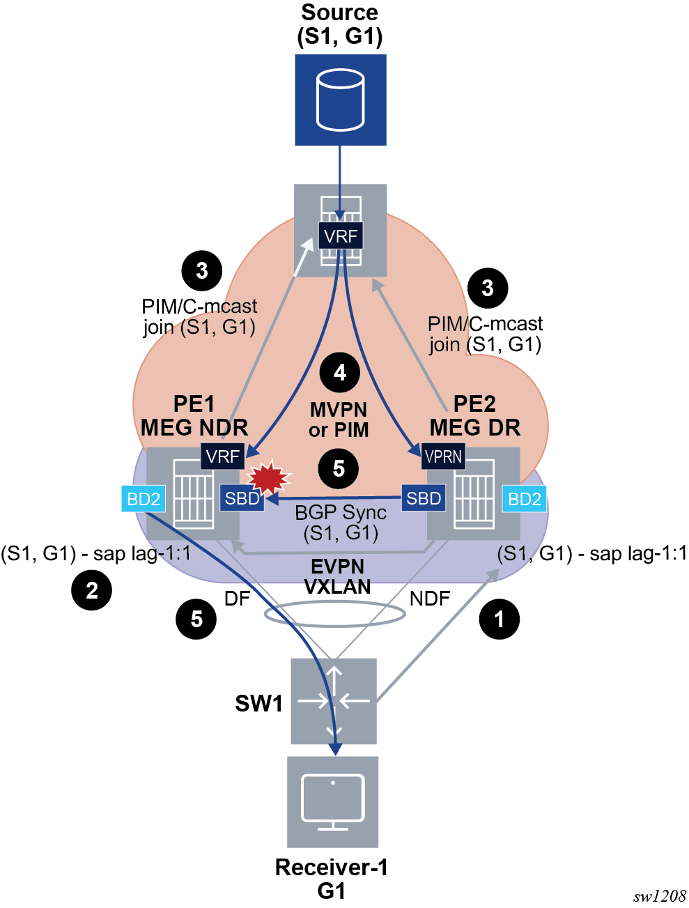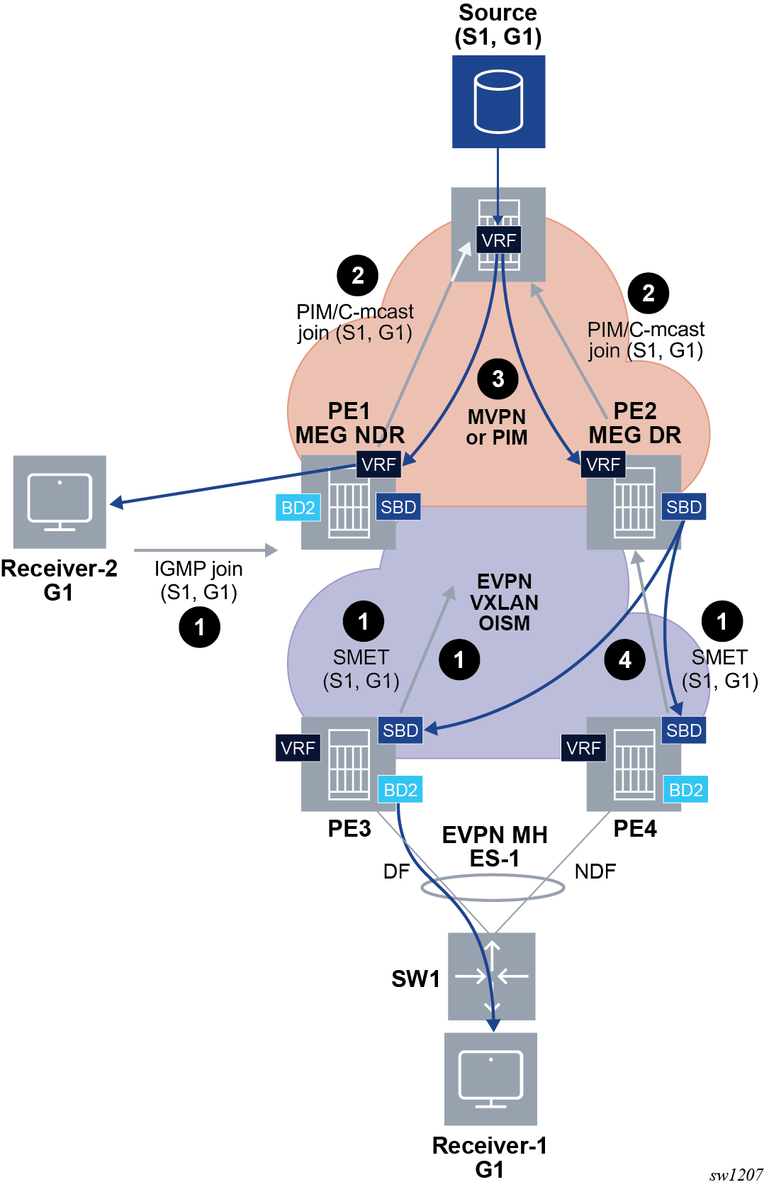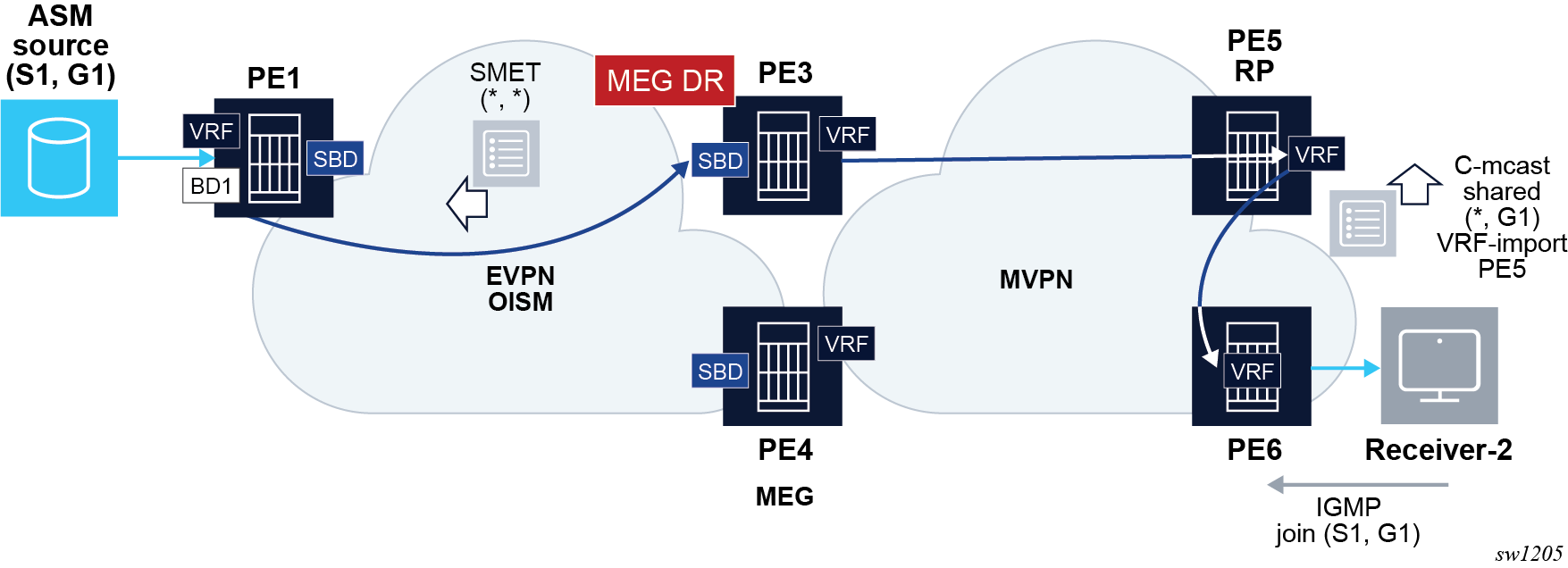 The combination of the pbb source-bmac and the Ethernet-segment source-bmac-lsb create the same BMAC for all the packets sourced from both PE-1 and PE-2 for Ethernet-segment ‟ESI-71”.