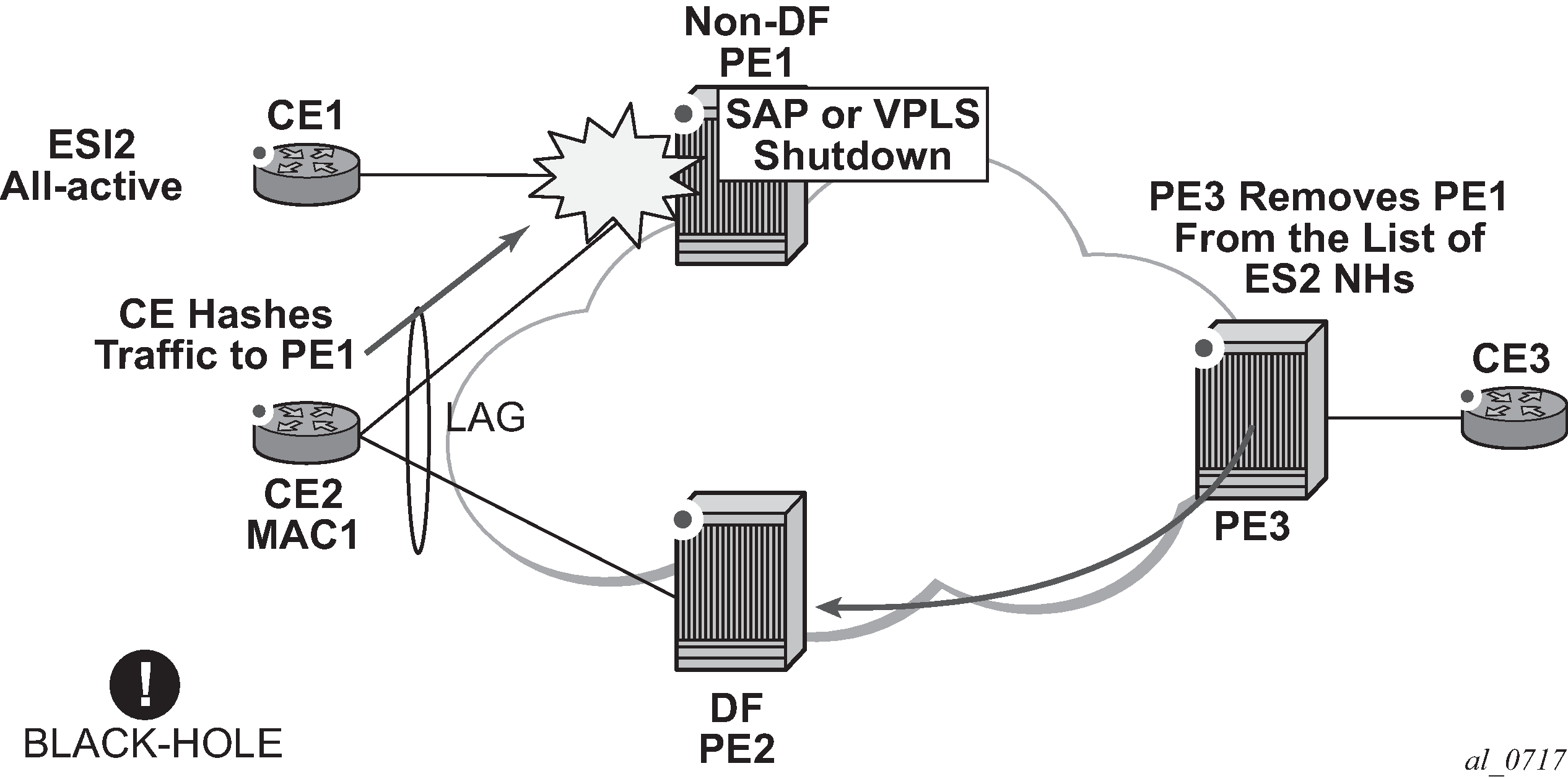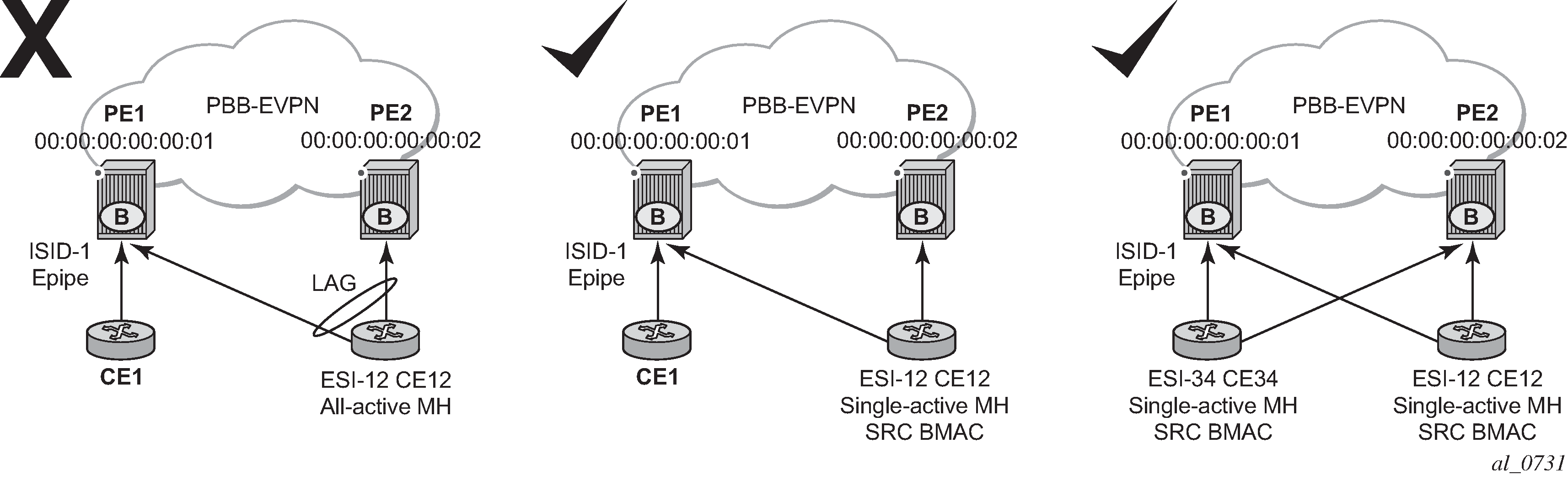 PE-1 and PE-2 are multihomed to CE-12 that uses a LAG to get connected to I-VPLS 20001. CE-12 is connected to LAG SAPs configured in an all-active multihoming Ethernet-segment.
