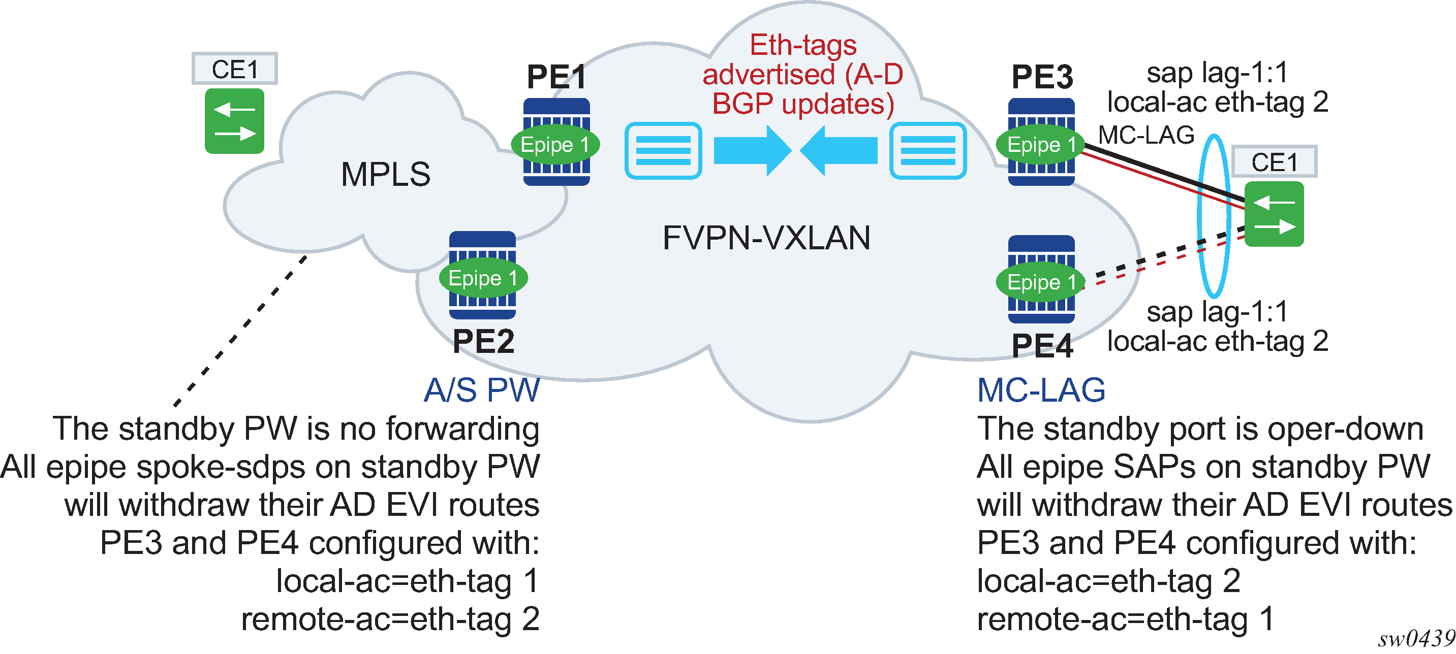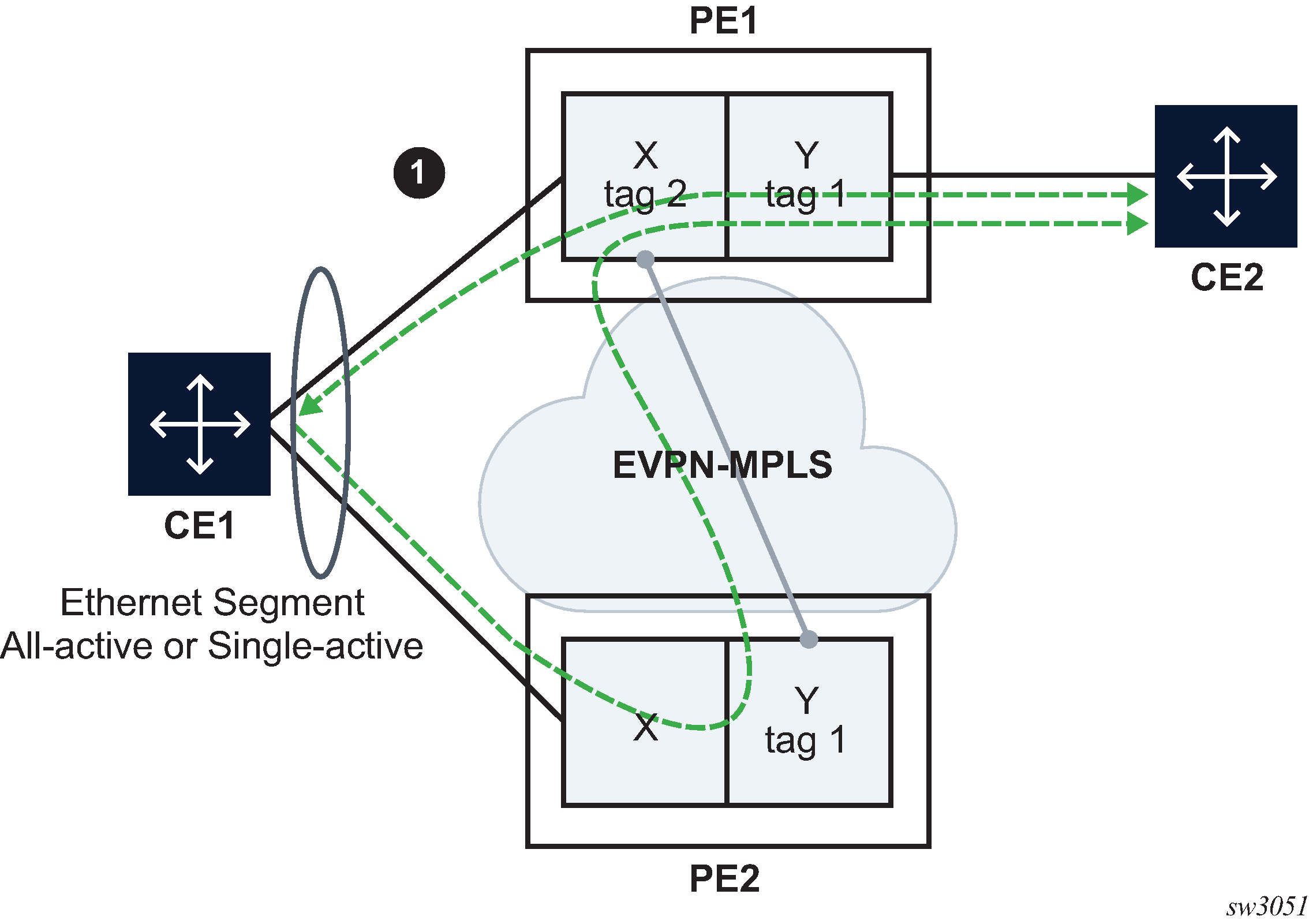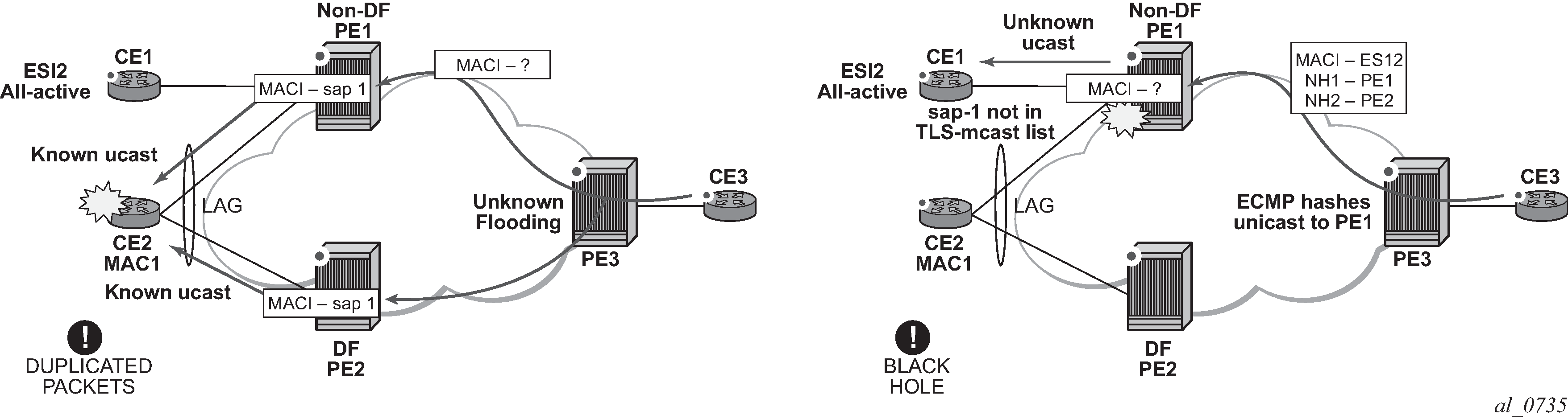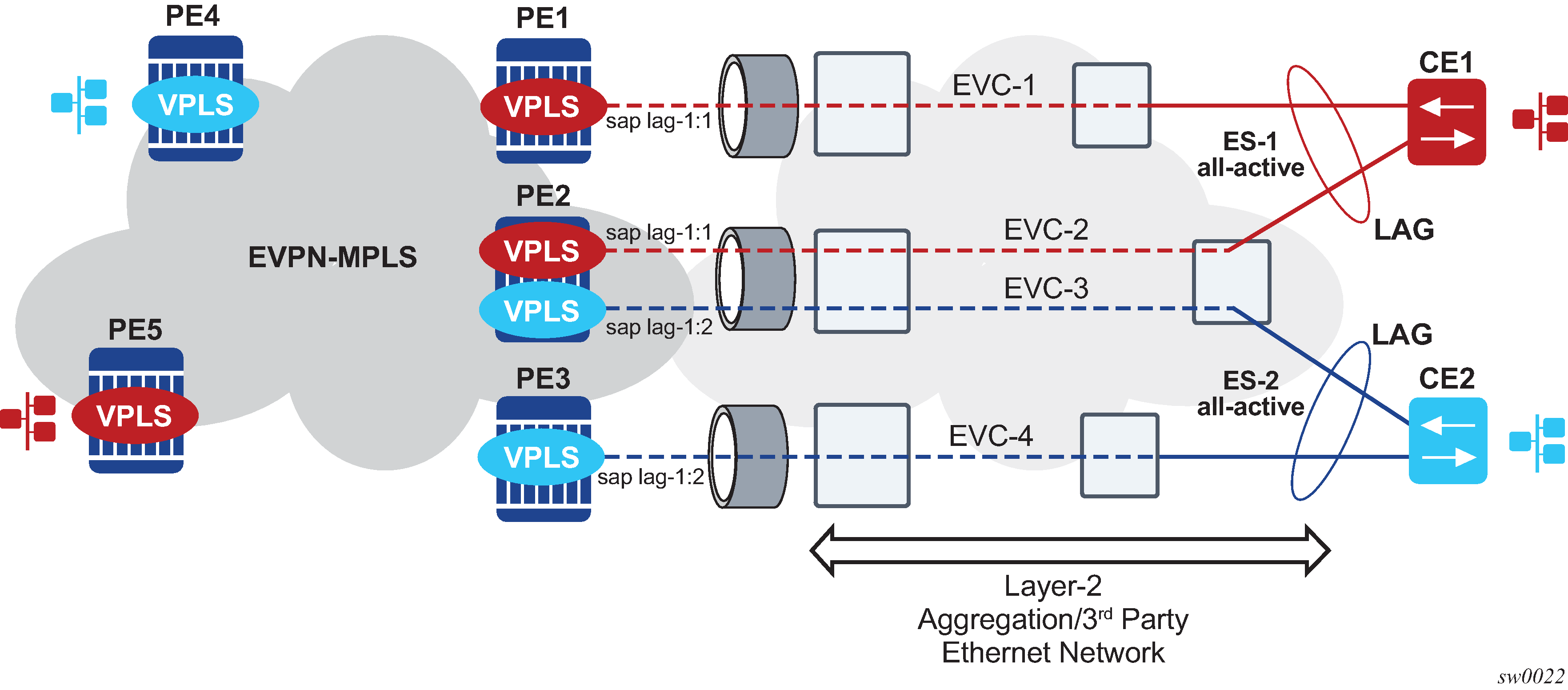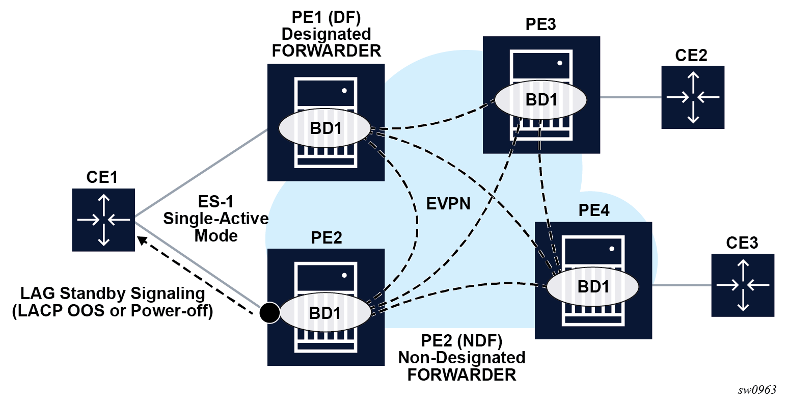 PE-1 and PE-2 are multihomed to CE-12 that uses a LAG to get connected to the network. CE-12 is connected to LAG SAPs configured in an all-active multihoming ES.
