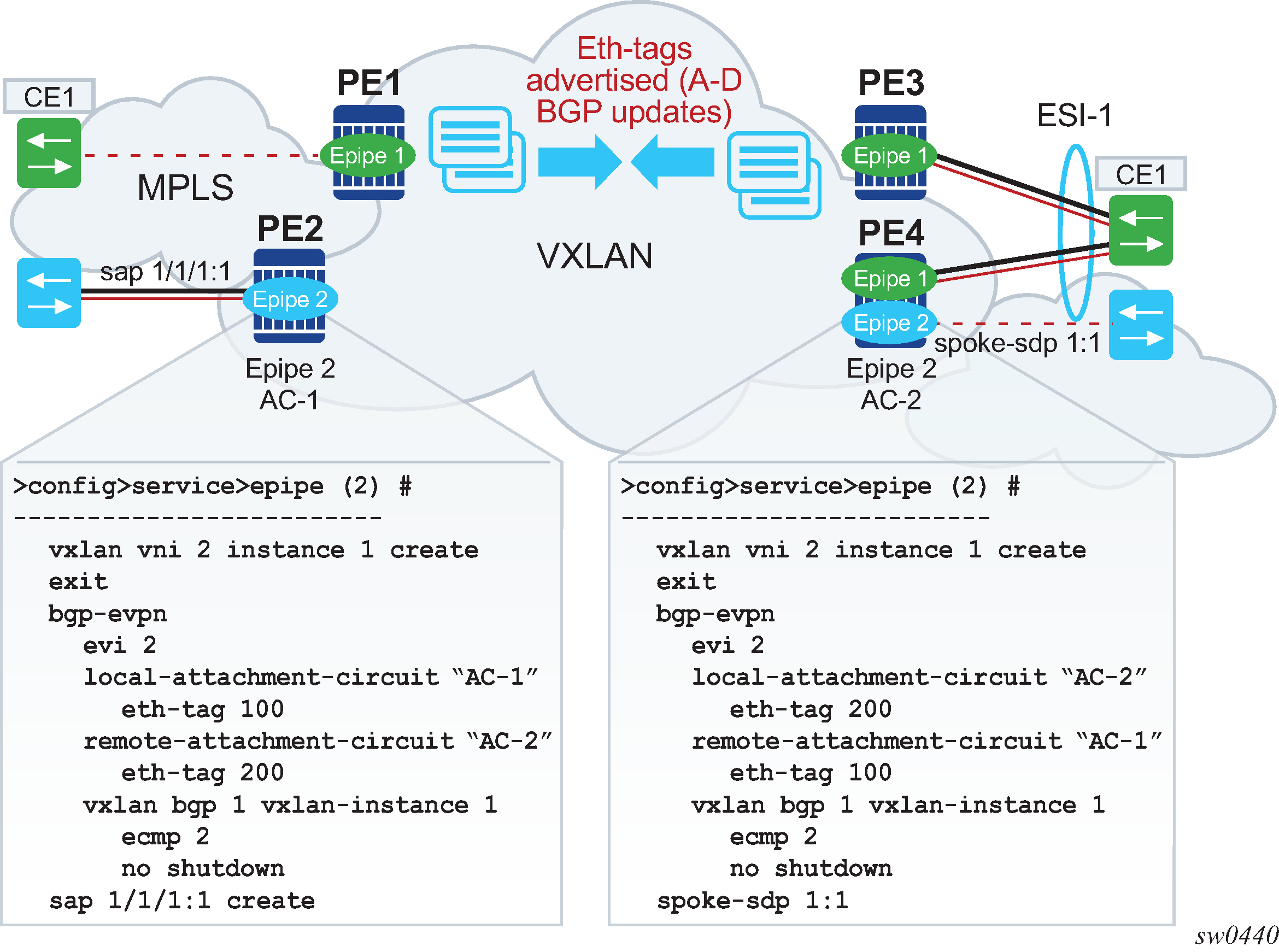 If point-to-point services are needed in the DC, SR OS supports the use of EVPN-VPWS for VXLAN tunnels, including multihoming, in accordance with RFC 8214.