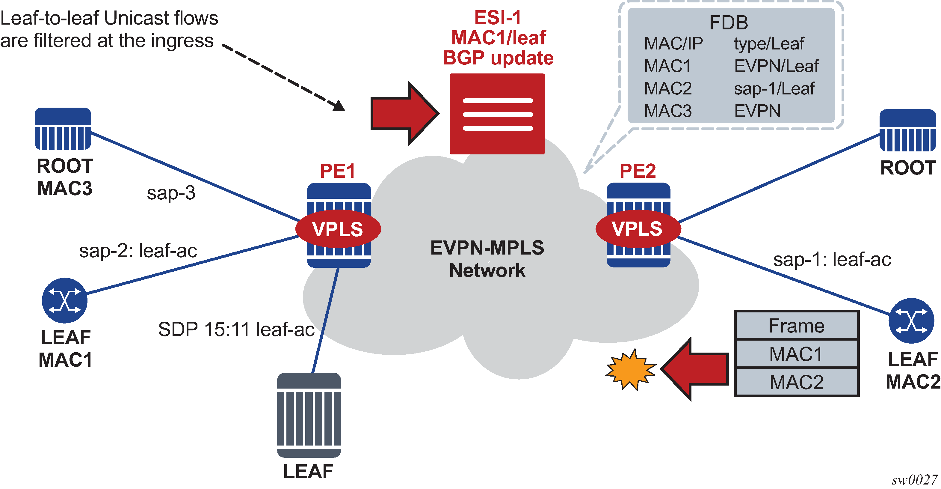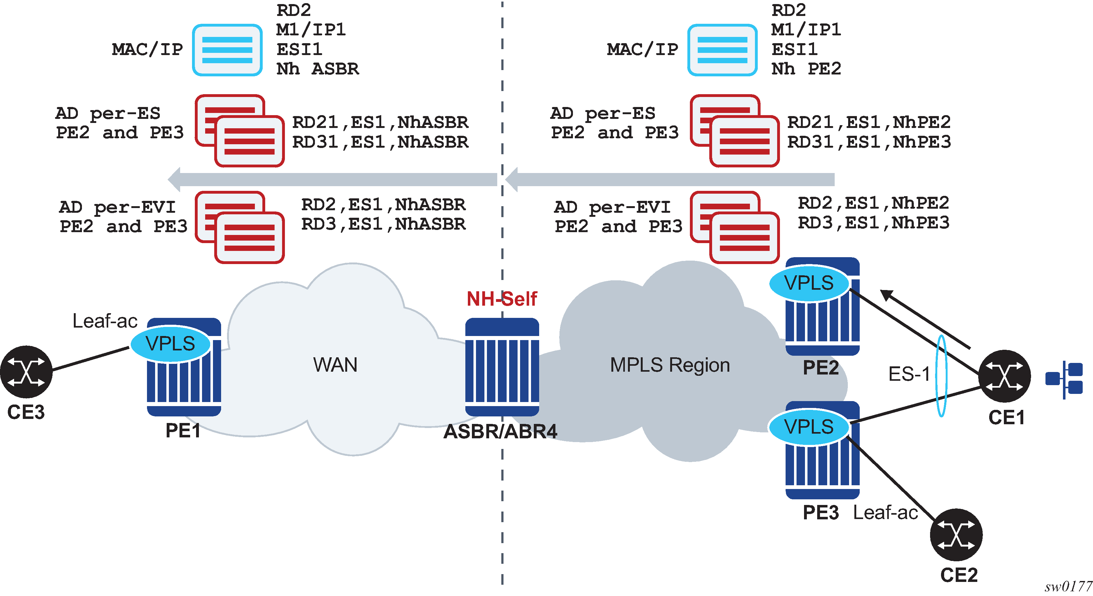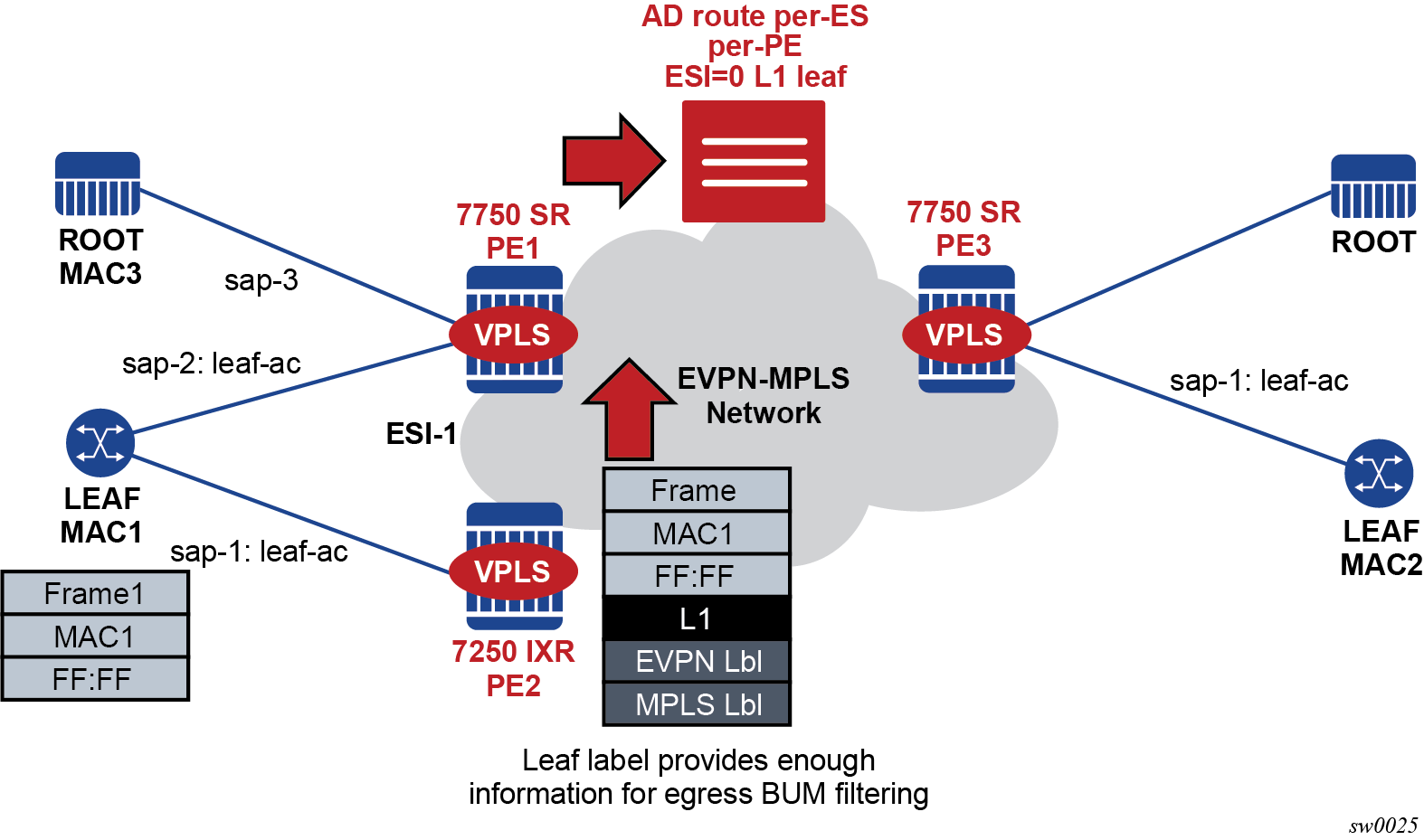 EVPN for PBB over MPLS shows the use of EVPN for MPLS tunnels on the 7750 SR, 7450 ESS, and 7950 XRS. In this case, EVPN is used as the control plane for E-LAN services in the WAN.