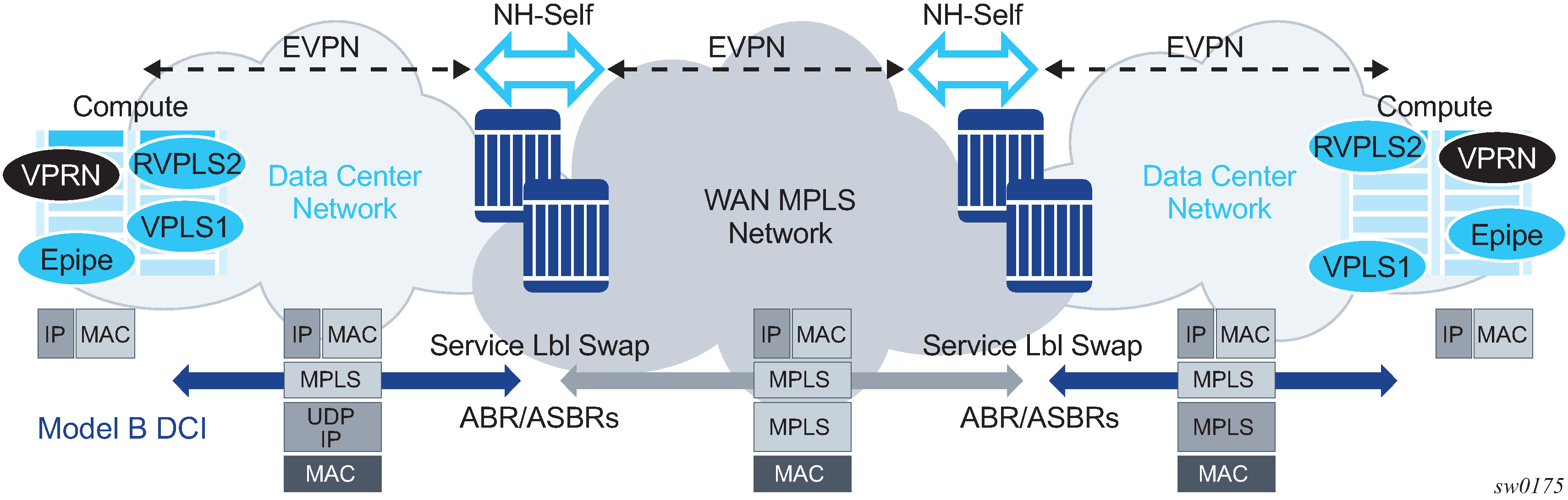 EVPN-MPLS can also be used in the WAN. In this case, the Layer 2 DGW function provides translation between EVPN-VXLAN and EVPN-MPLS. EVPN multihoming can be used to provide DGW redundancy.