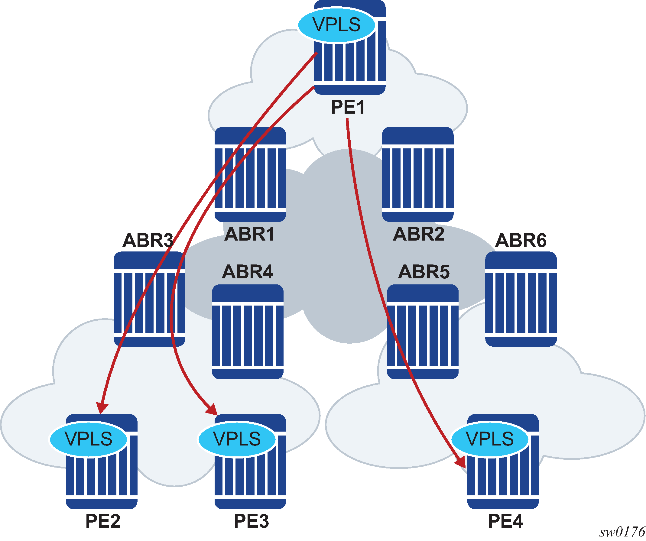 The WAN connectivity is based on VPLS where SAPs (null, dot1q, and qinq), spoke SDPs (FEC type 128 and 129), and mesh-SDPs are supported.
