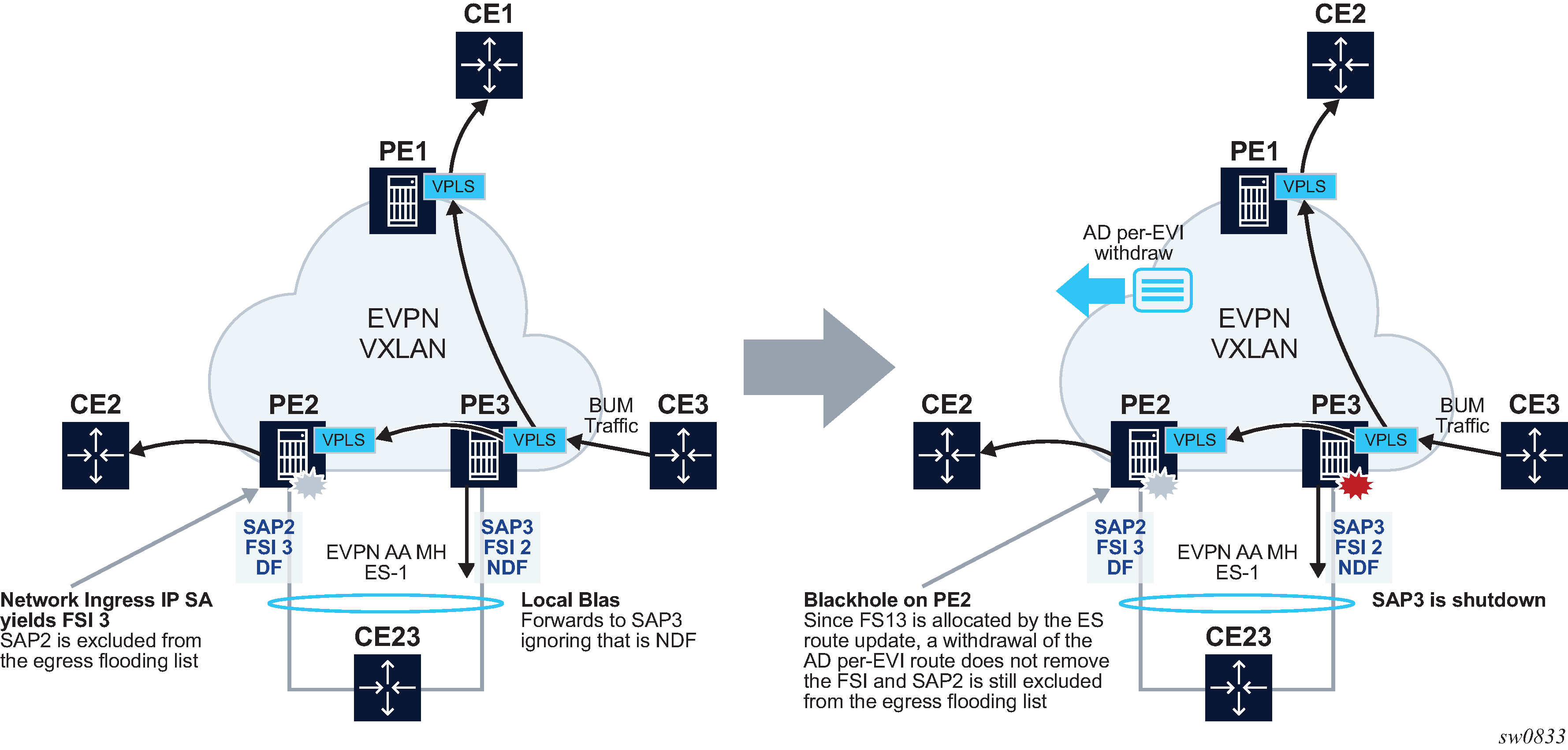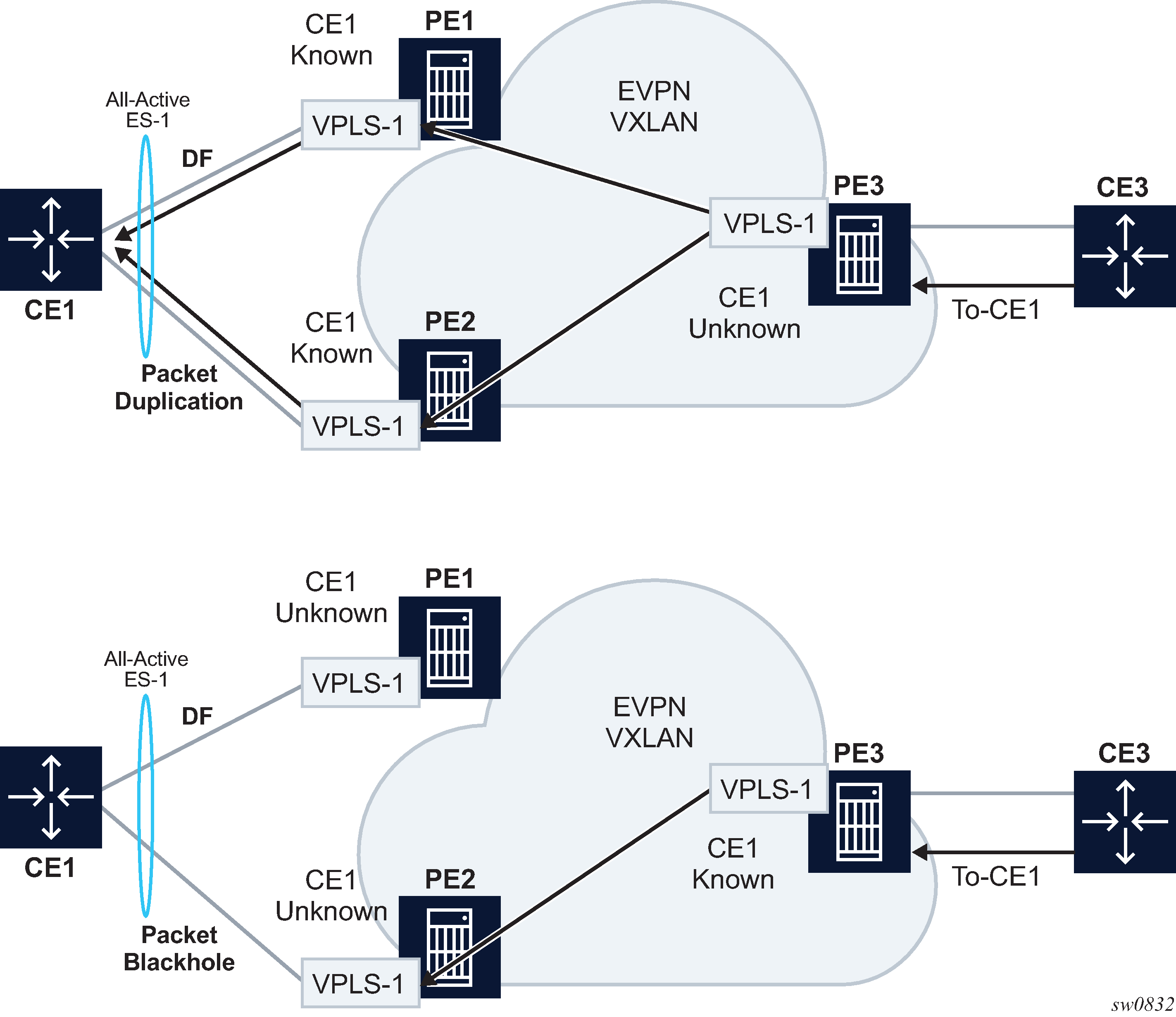 EVPN supports both all-active multihoming (per flow load-balancing multihoming) as well as single-active multihoming (per-service load-balancing multihoming). Although VPLS already supports single-active multihoming, EVPN single-active multihoming is deemed the superior technology because of its mass-withdrawal capabilities to speed up convergence in scaled environments.