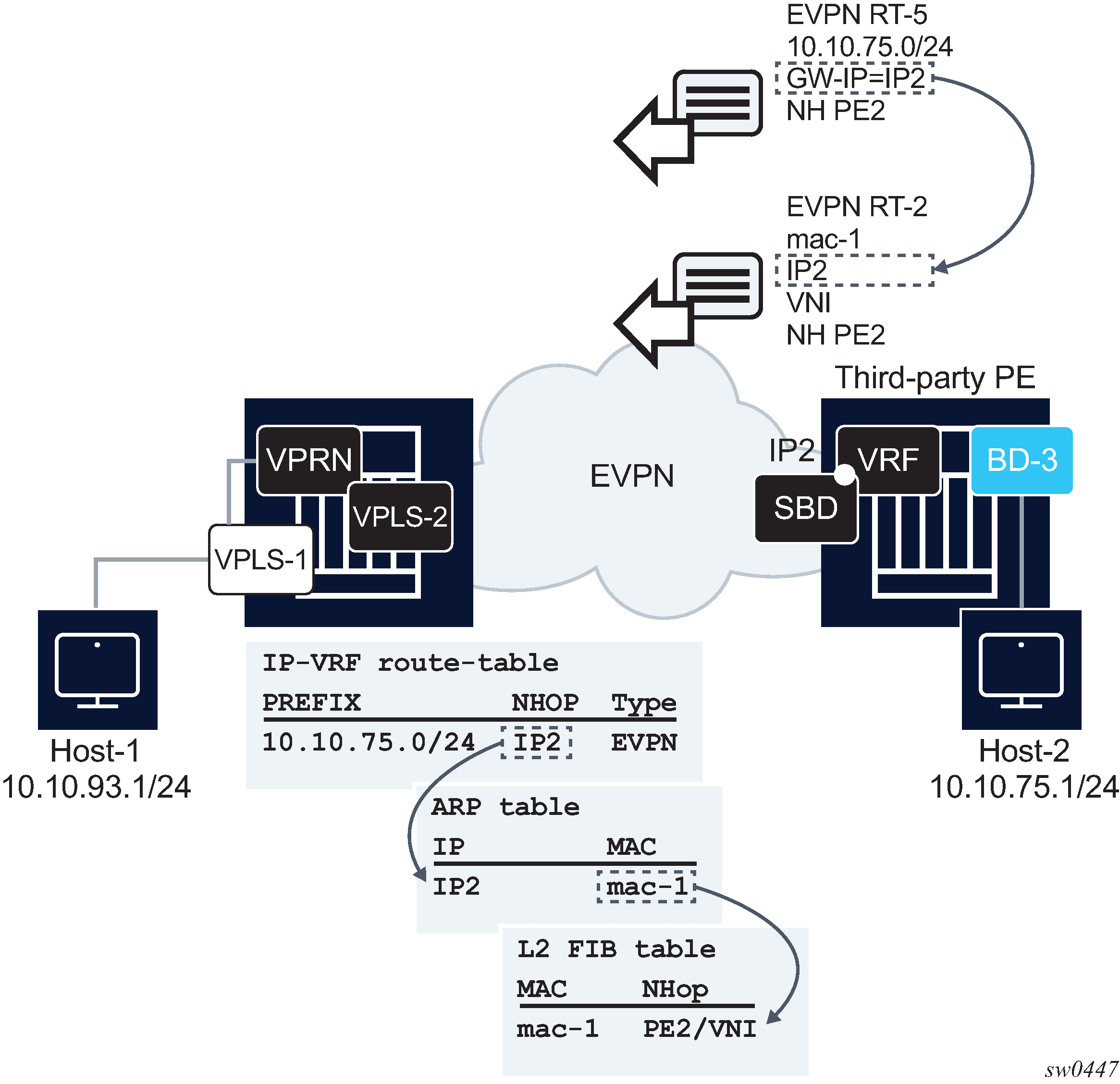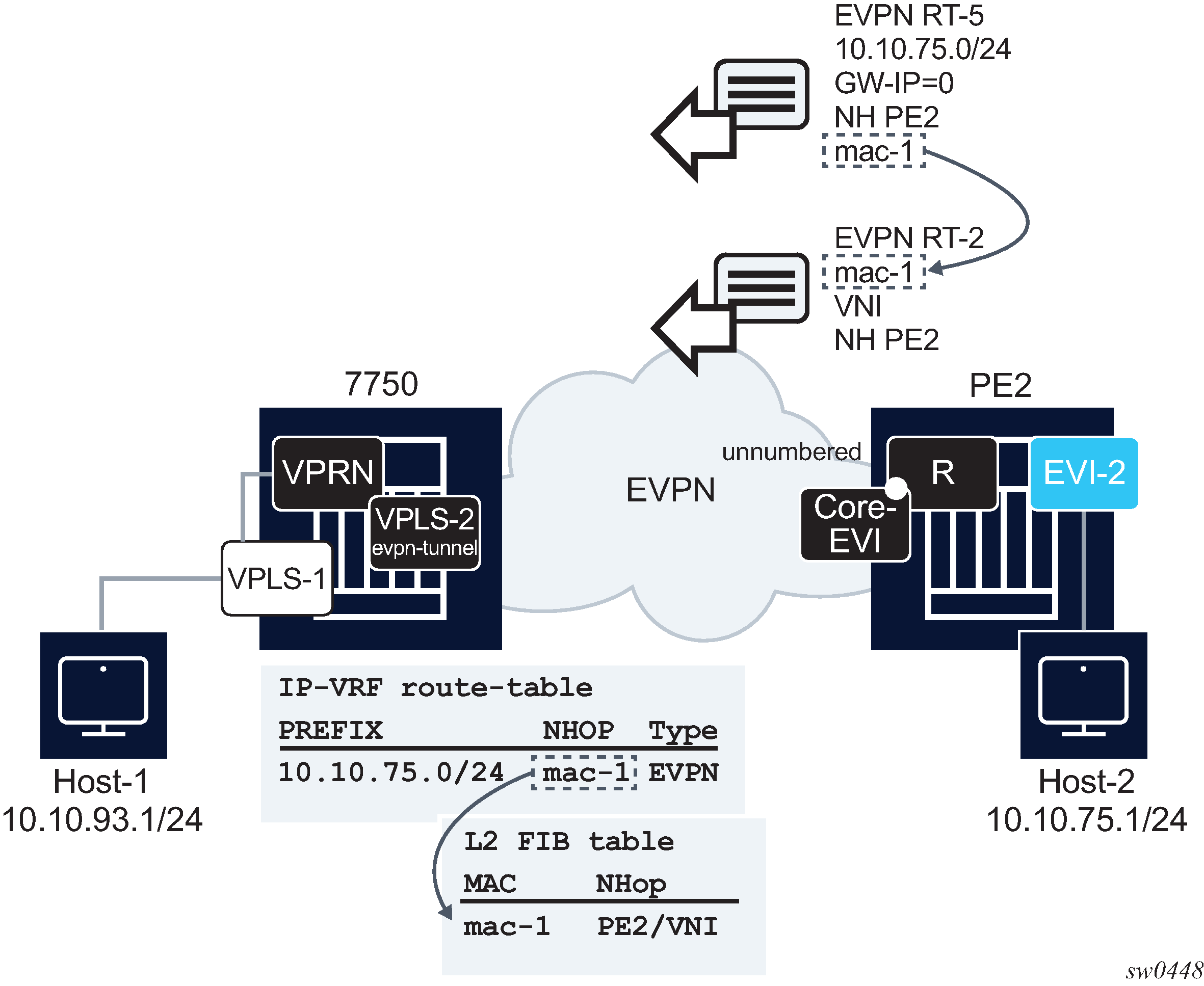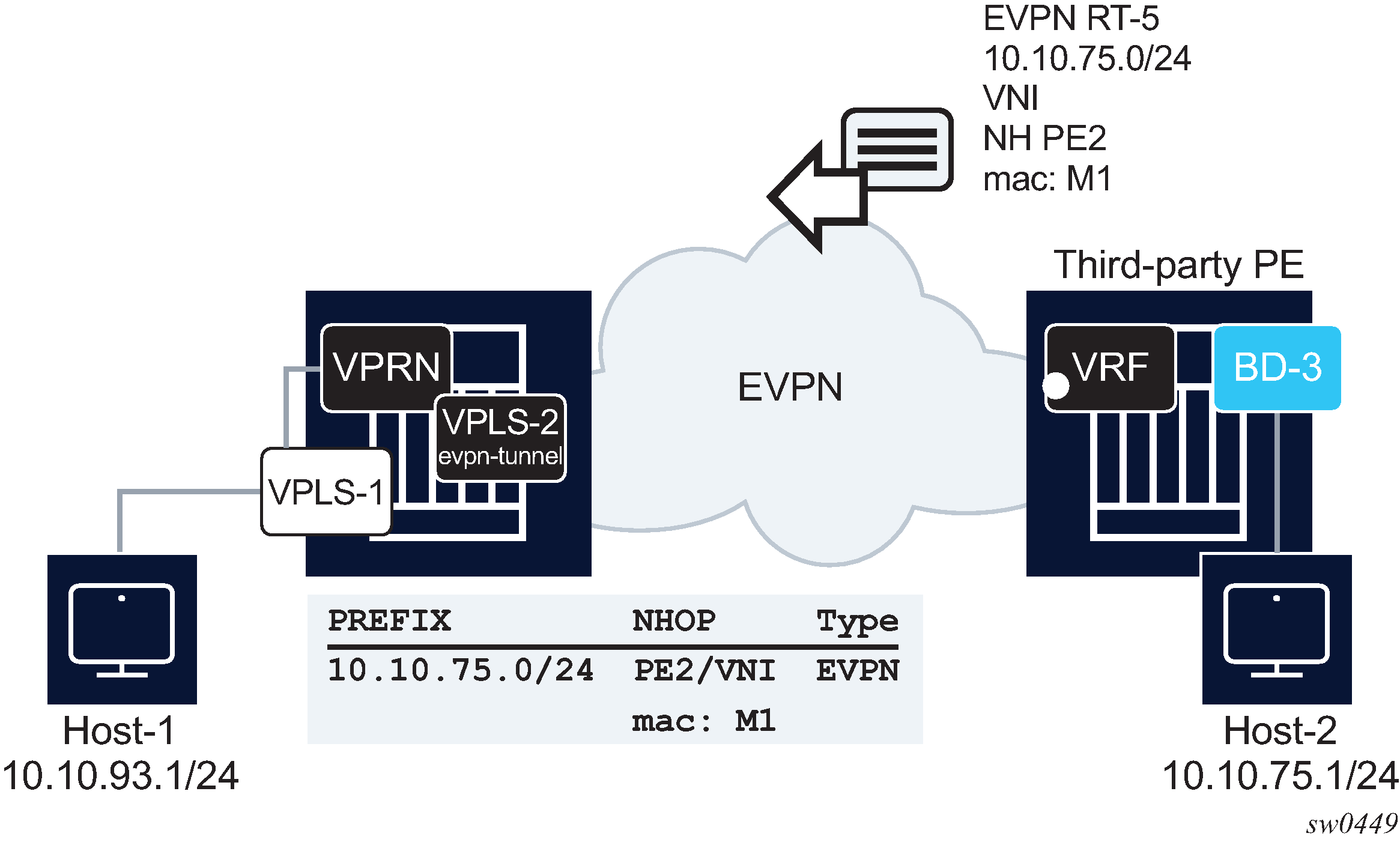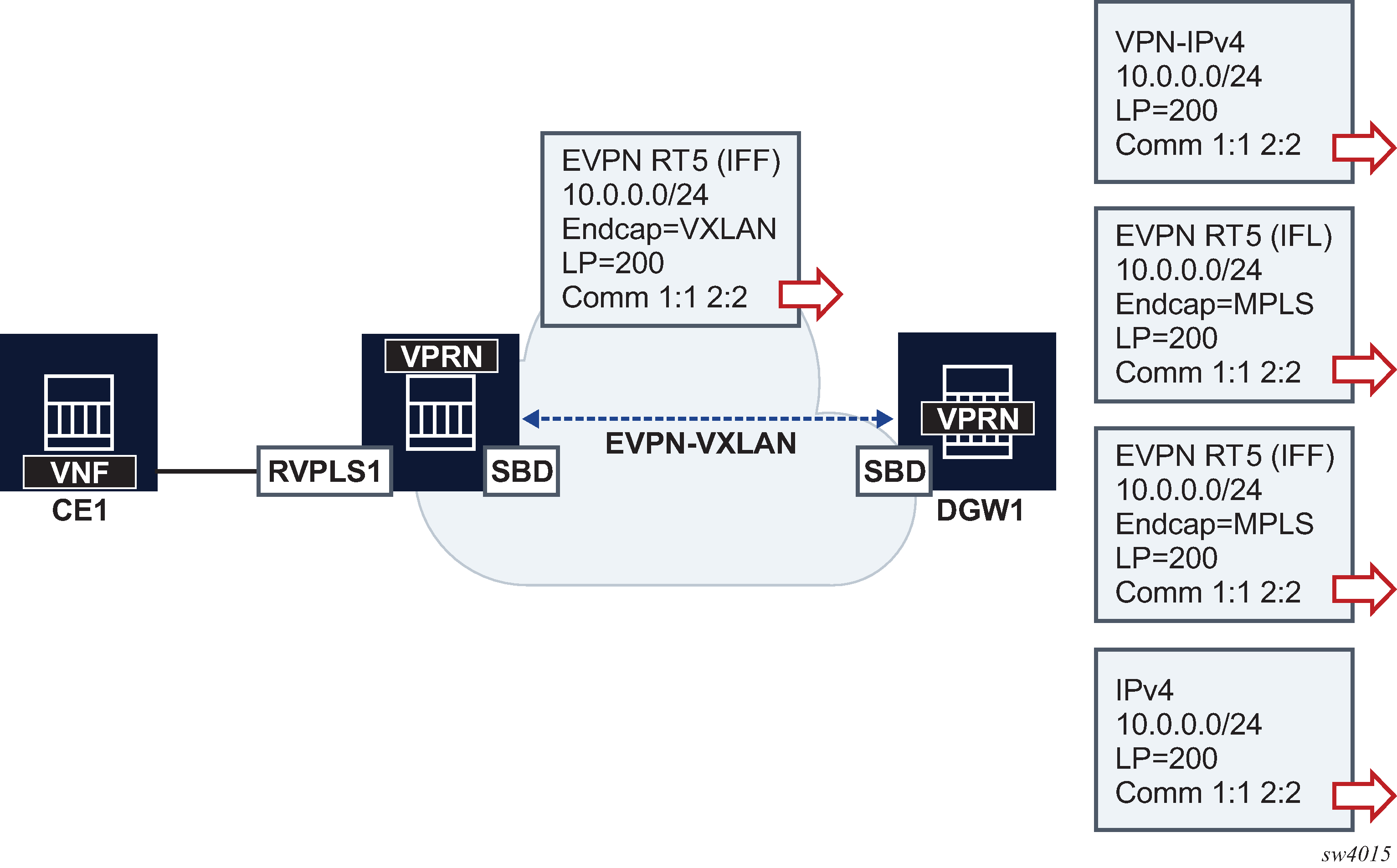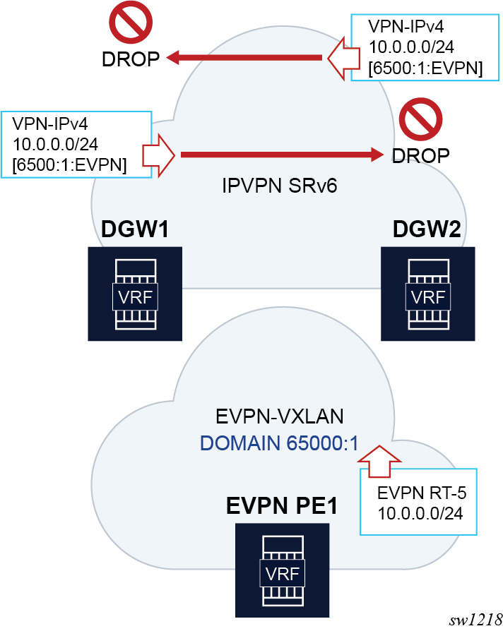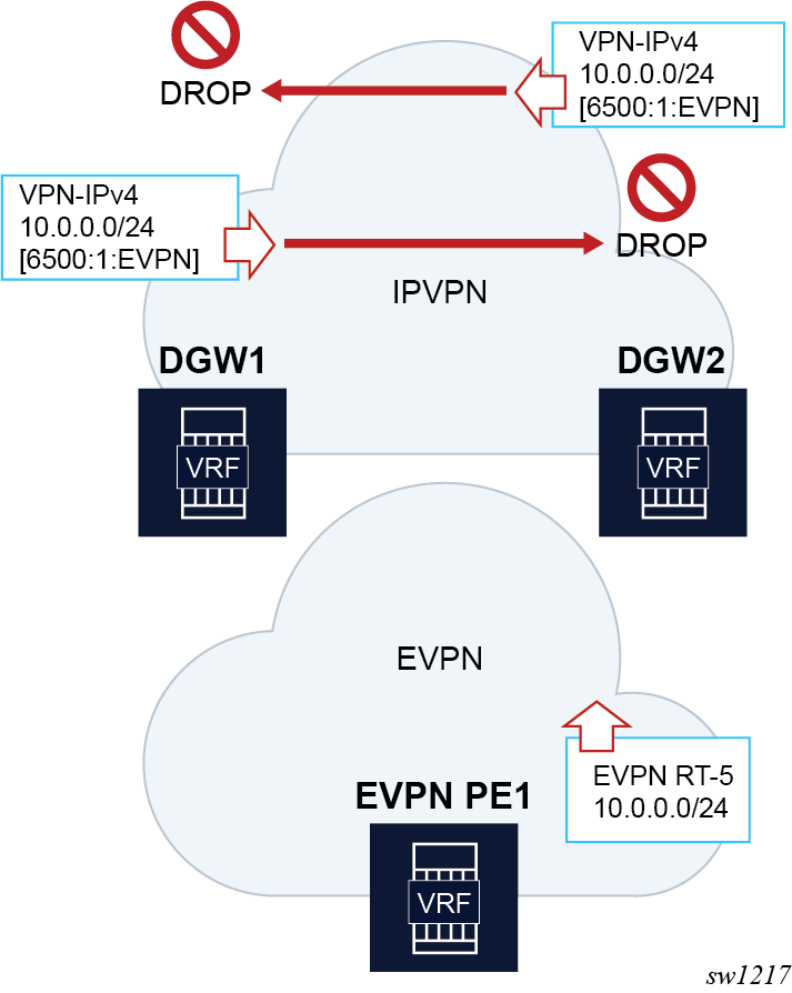 The 7750 SR, 7450 ESS, and 7950 XRS DGW support the IRB backhaul R-VPLS model, where the R-VPLS runs EVPN-VXLAN and the VPRN instances exchange IP prefixes (IPv4 and IPv6) through the use of EVPN. Interoperability between the EVPN and IP-VPN for IP prefixes is also fully supported.