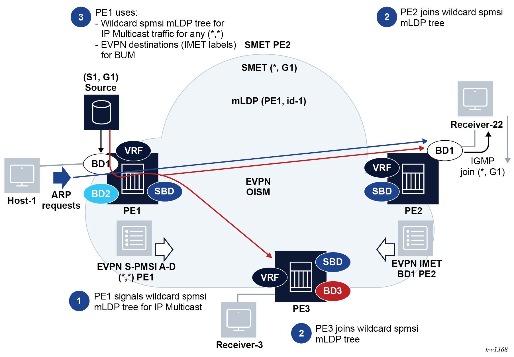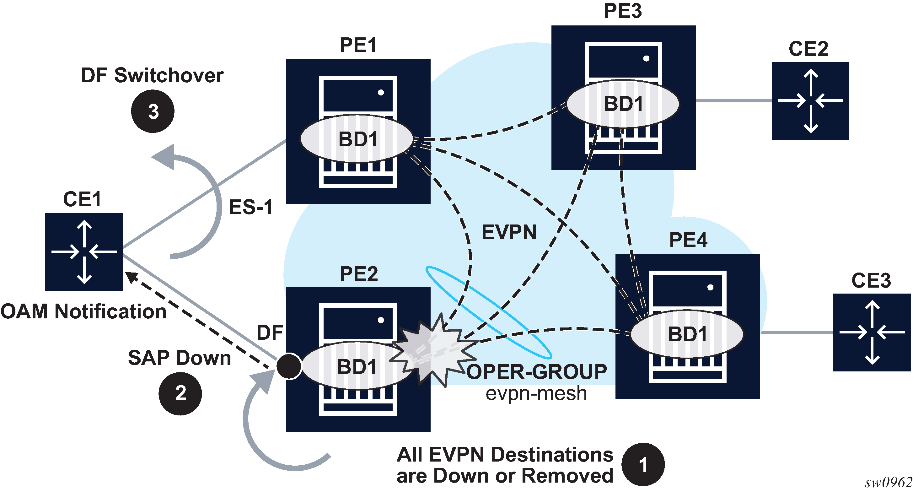 The three PEs are connected through B-VPLS 20000, a Backbone VPLS where EVPN is enabled.