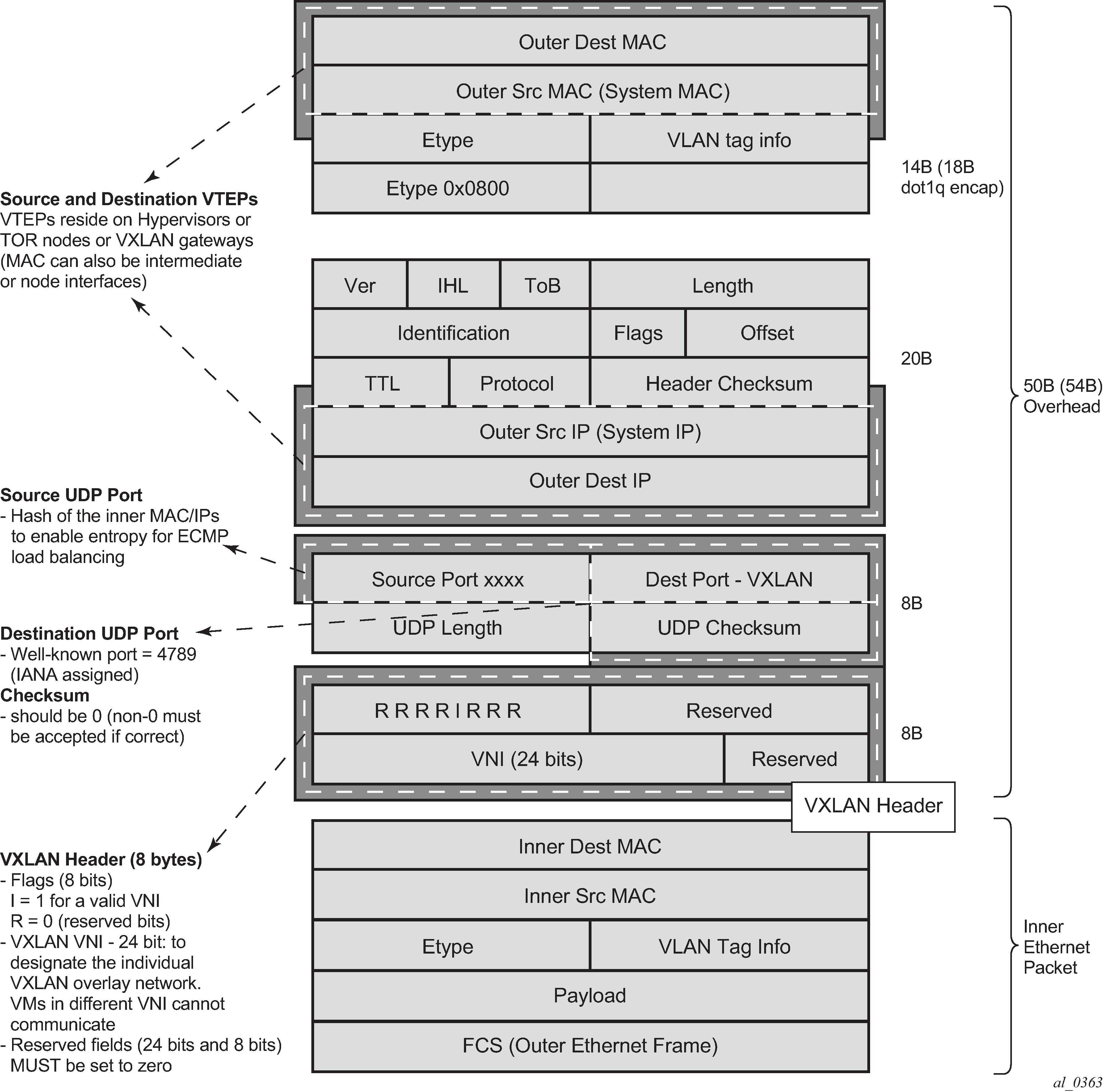 VXLAN encapsulates the inner Ethernet frames into VXLAN + UDP/IP packets. The main pieces of information encoded in this encapsulation are the following:
