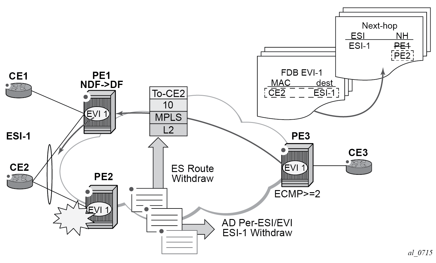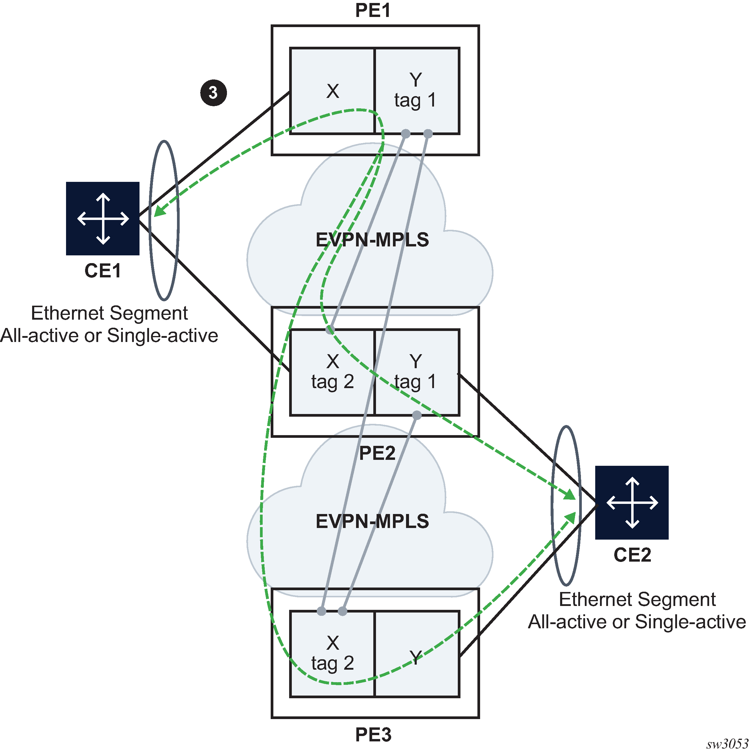PE-3 is a remote PE that performs aliasing for traffic destined for the CE-12