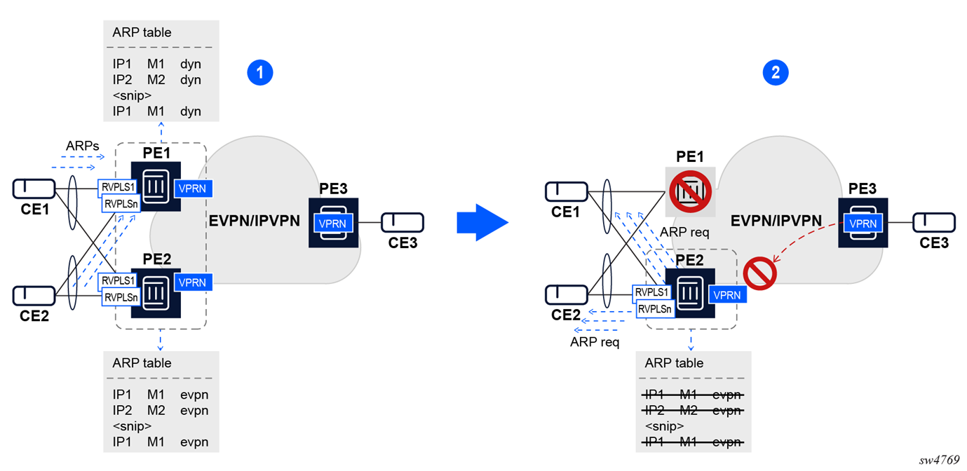 EVPN-MPLS can also be enabled in R-VPLS services with the same feature-set that is described for VXLAN tunnels in sections and EVPN for VXLAN tunnels in a Layer 3 DC with integrated routing bridging connectivity among VPRNs and EVPN for VXLAN tunnels in a Layer 3 DC with EVPN-tunnel connectivity among VPRNs.