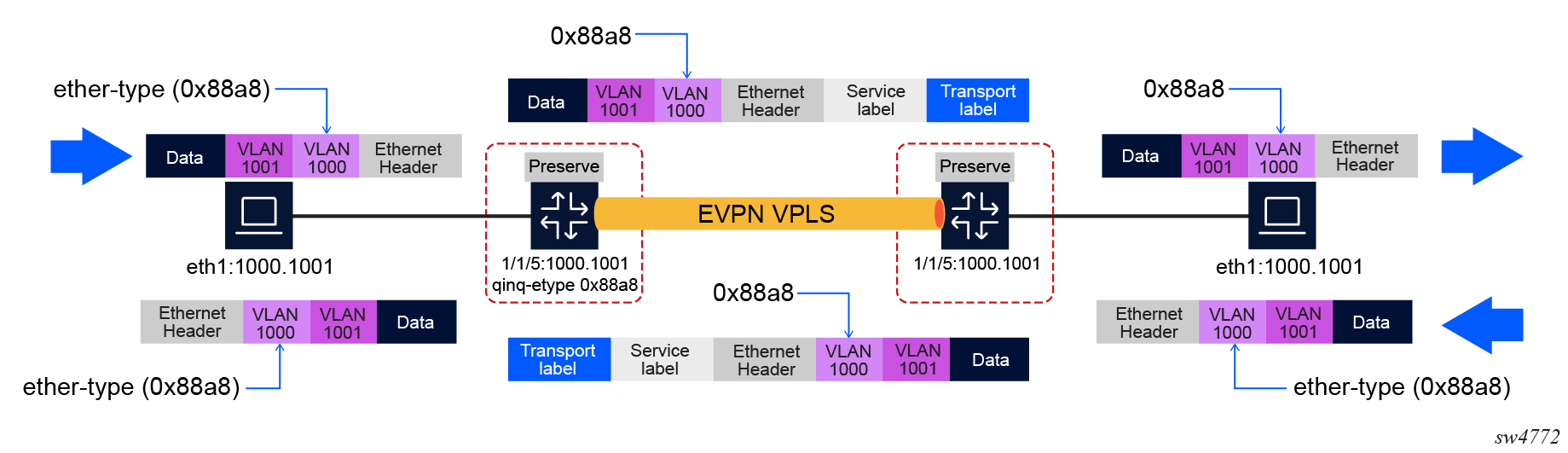 The source port is derived from a hashing of the inner source and destination MAC/IP addresses that the 7750 SR, 7450 ESS, or 7950 XRS does at ingress. This creates an ‟entropy” value that can be used by the core DC nodes for load balancing on ECMP paths.