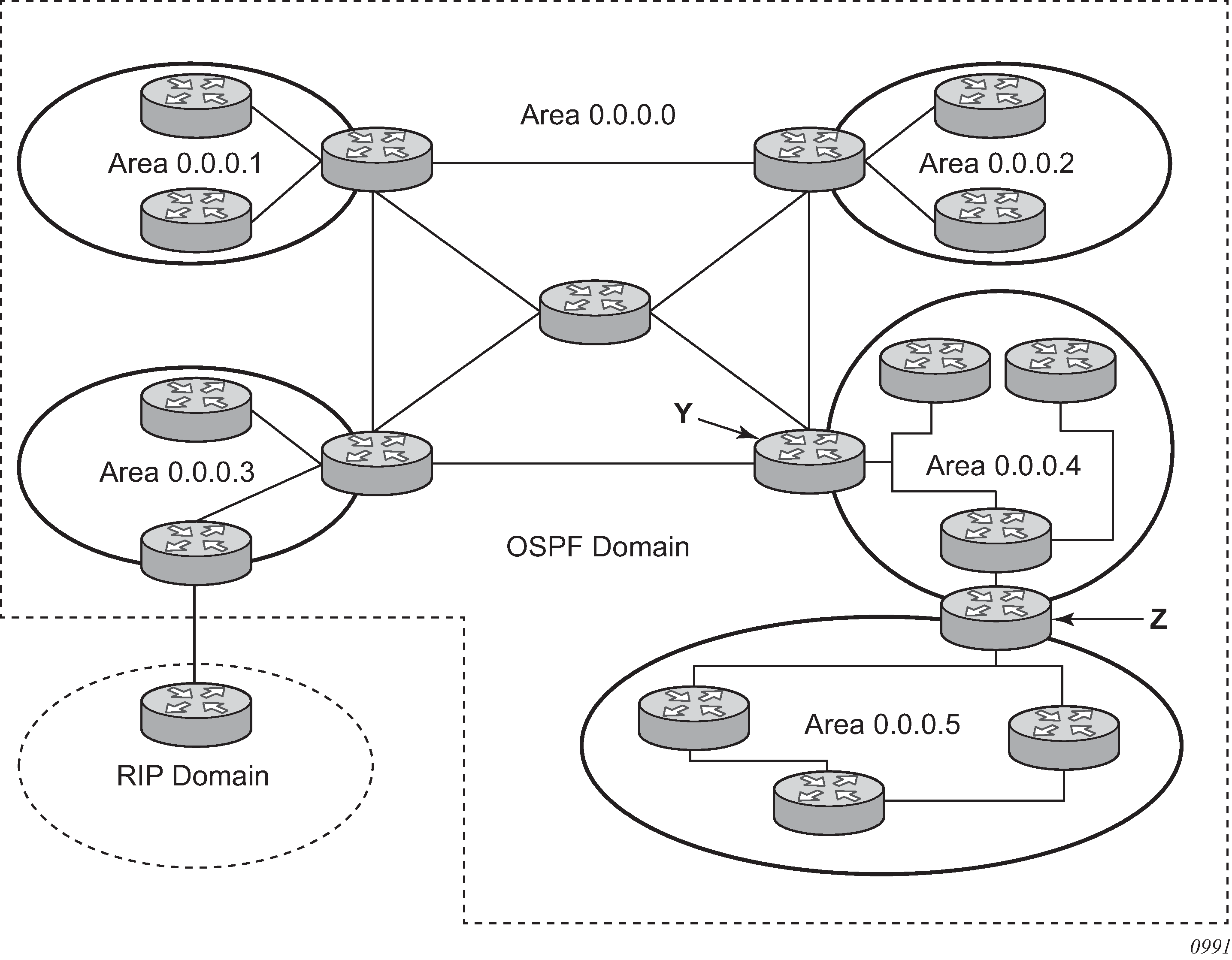 The OSPF backbone area, area 0.0.0.0, must be contiguous and all other areas must be connected to the backbone area. The backbone distributes routing information between areas. If it is not practical to connect an area to the backbone (see Area 0.0.0.5 in OSPF areas), the area border routers (such as routers Y and Z) must be connected via a virtual link. The two area border routers form a point-to-point-like adjacency across the transit area (see Area 0.0.0.4). A virtual link can only be configured while in the area 0.0.0.0 context.