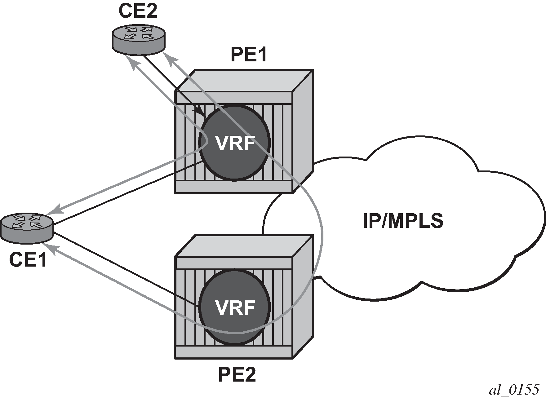 Each Virtual Private Routed Network (VPRN) consists of a set of customer sites connected to one or more PE routers. Each associated PE router maintains a separate IP forwarding table for each VPRN. Additionally, the PE routers exchange the routing information configured or learned from all customer sites via MP-BGP peering. Each route exchanged via the MP-BGP protocol includes a Route Distinguisher (RD), which identifies the VPRN association and handles the possibility of IP address overlap.