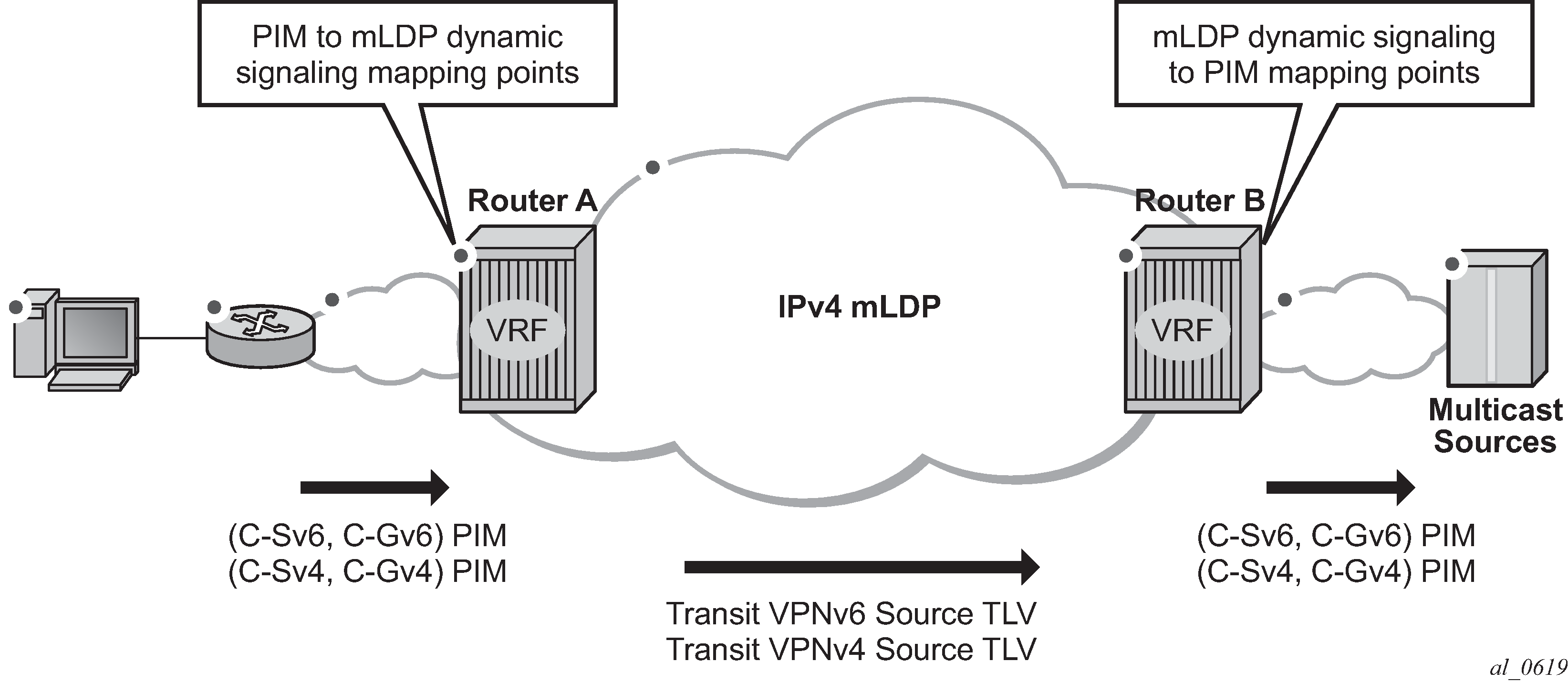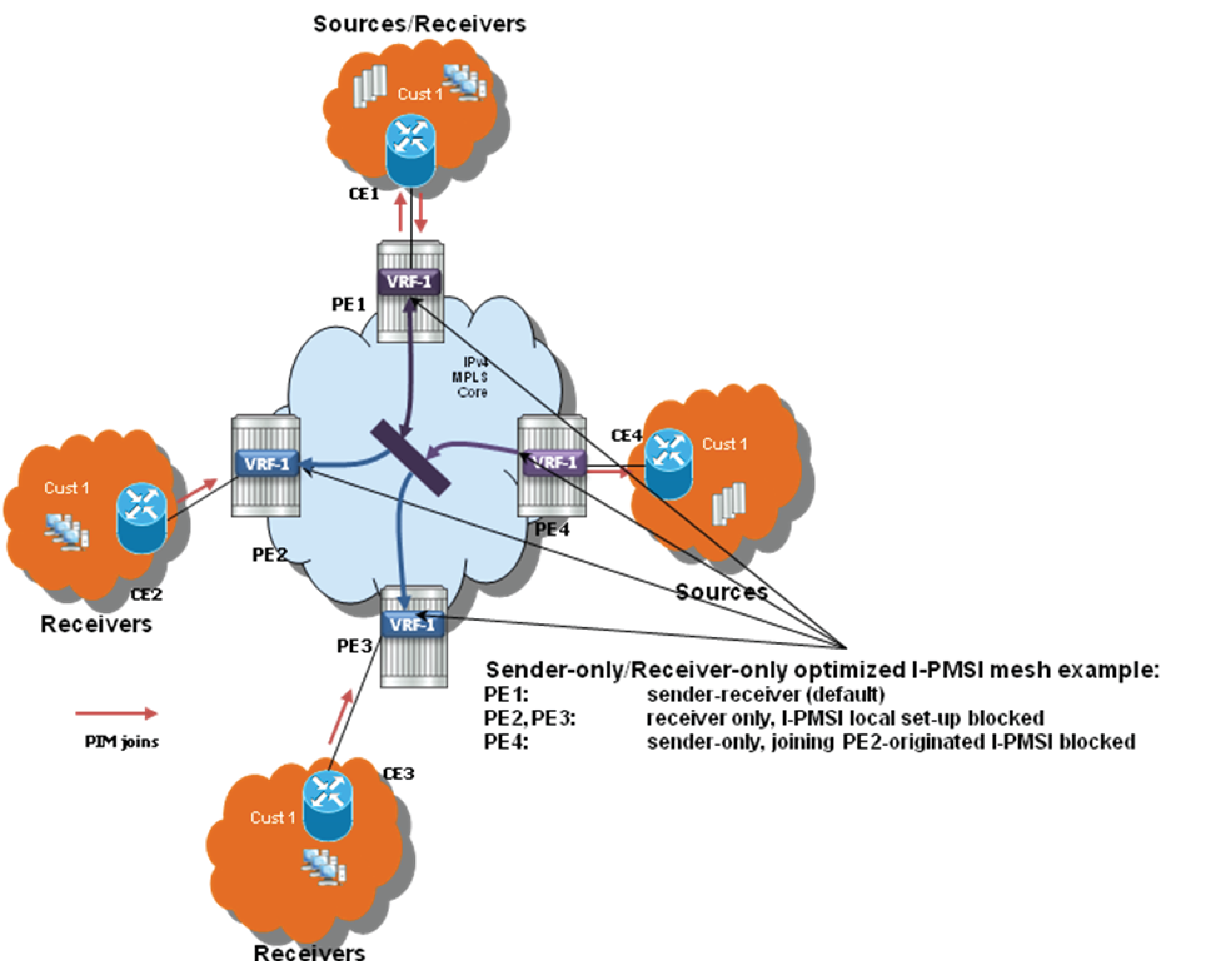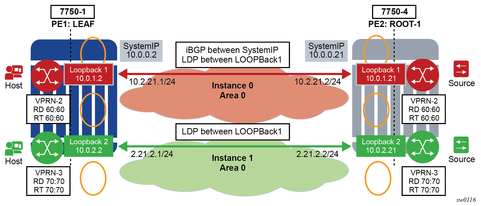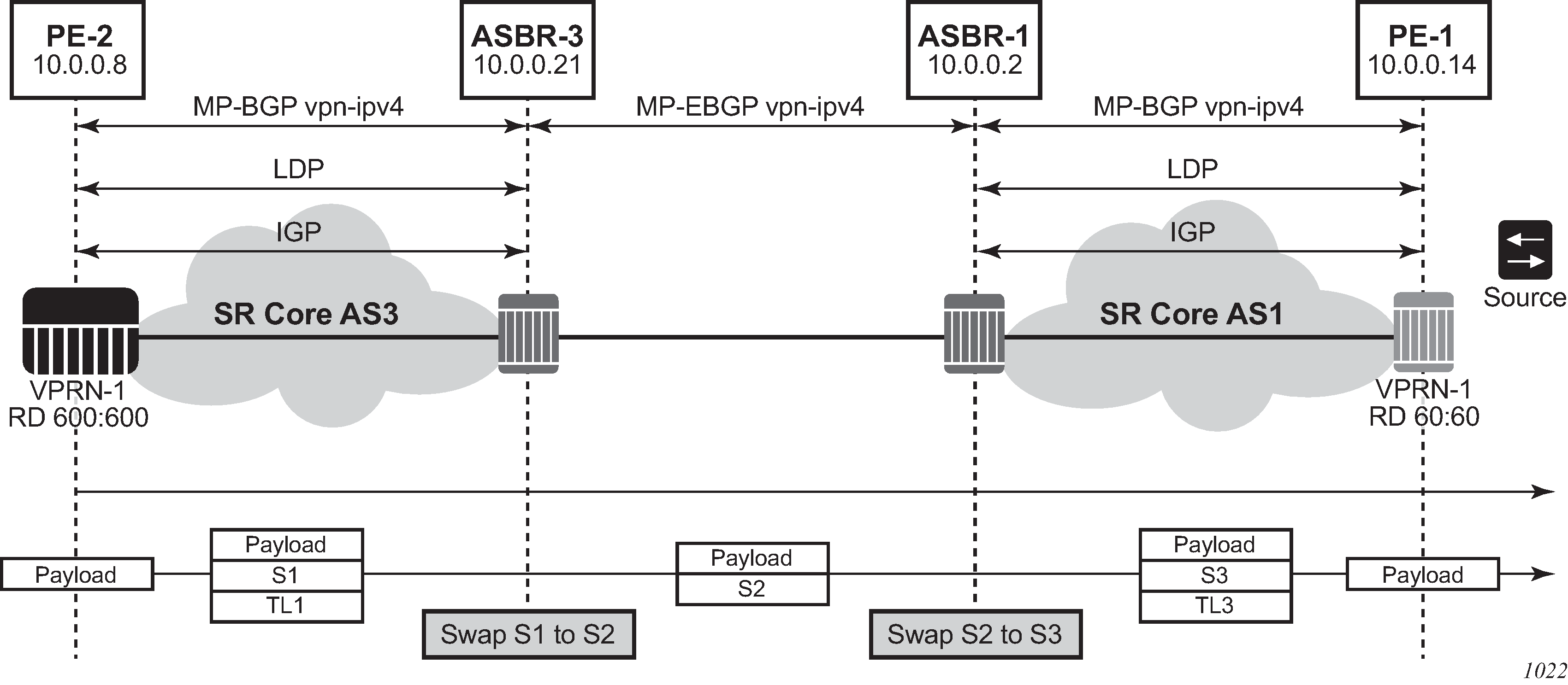 Here, both routes can have a source protocol of VPN-IPv4 but one still has an IPv4 next hop and the other can have a VPN-IPv4 next hop pointing out a network interface. Traffic is still load balanced (if eiBGP is enabled) as if only a single VRF was involved.
