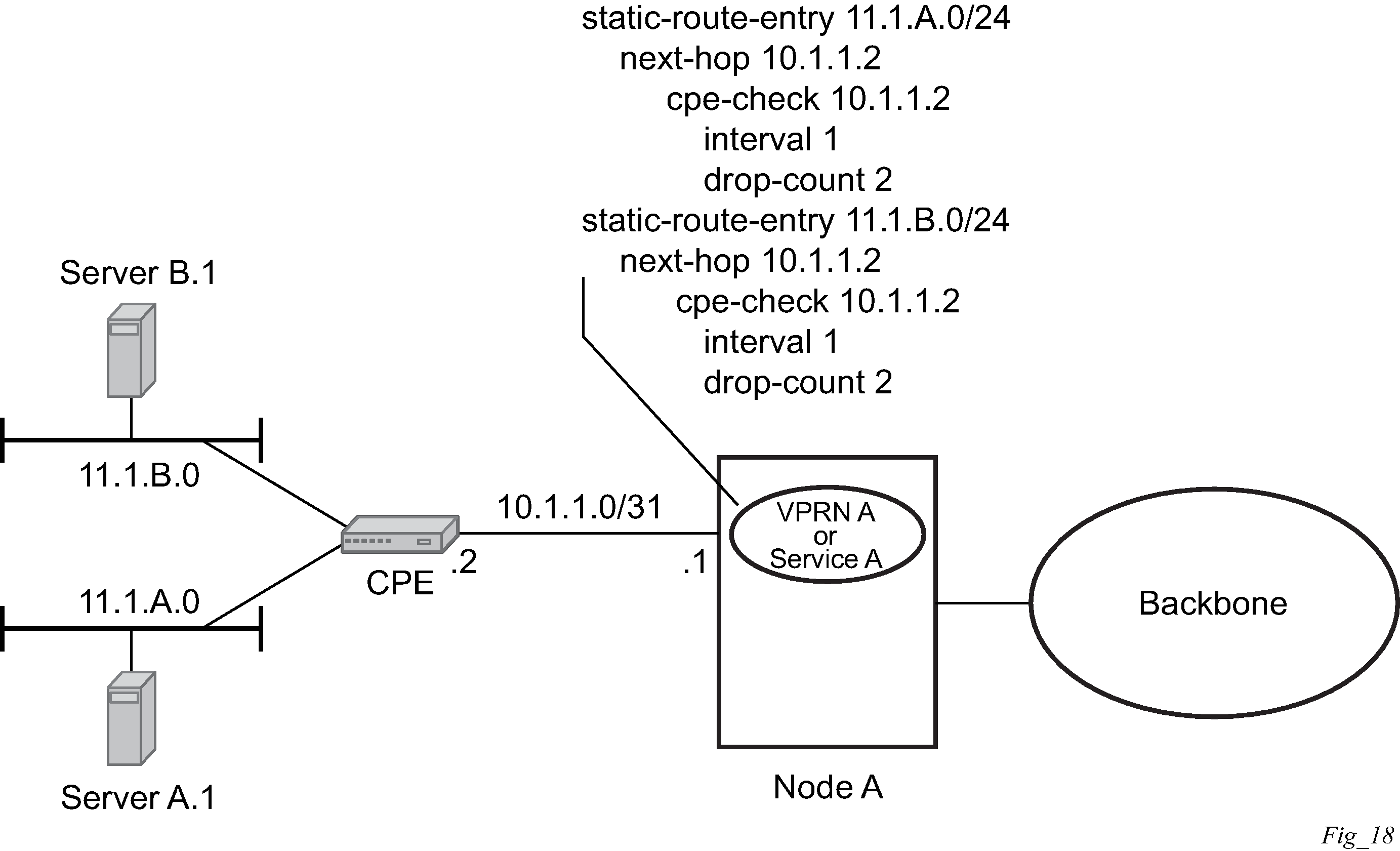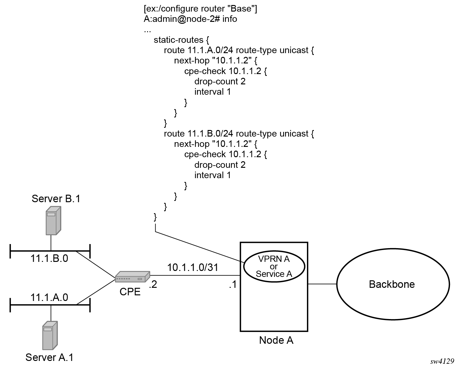 Static routes are used within many IES services and VPRN services. Unlike dynamic routing protocols, there is no way to change the state of routes based on availability information for the associated CPE. CPE connectivity check adds flexibility so that unavailable destinations are removed from the VPRN routing tables dynamically and minimize wasted bandwidth.