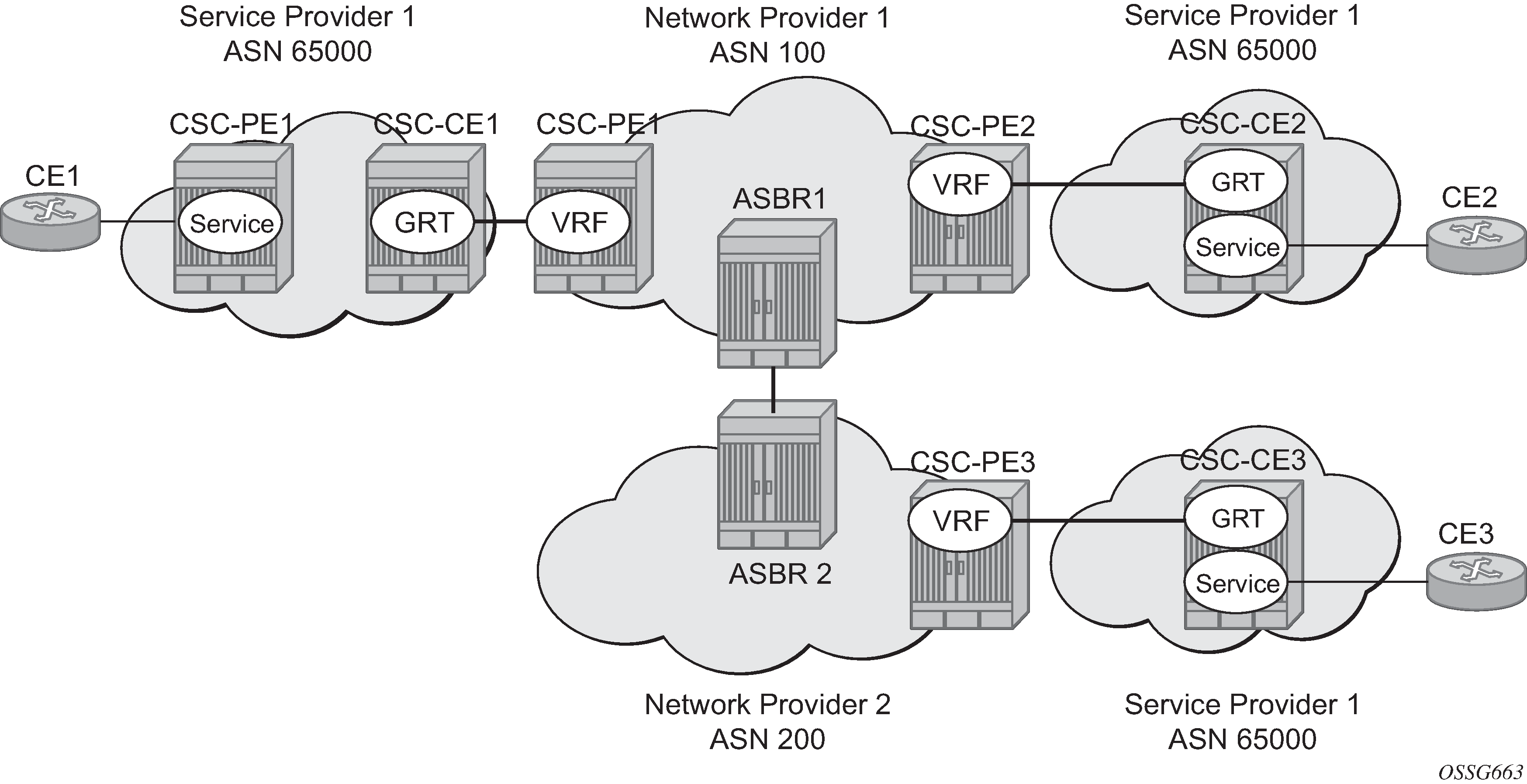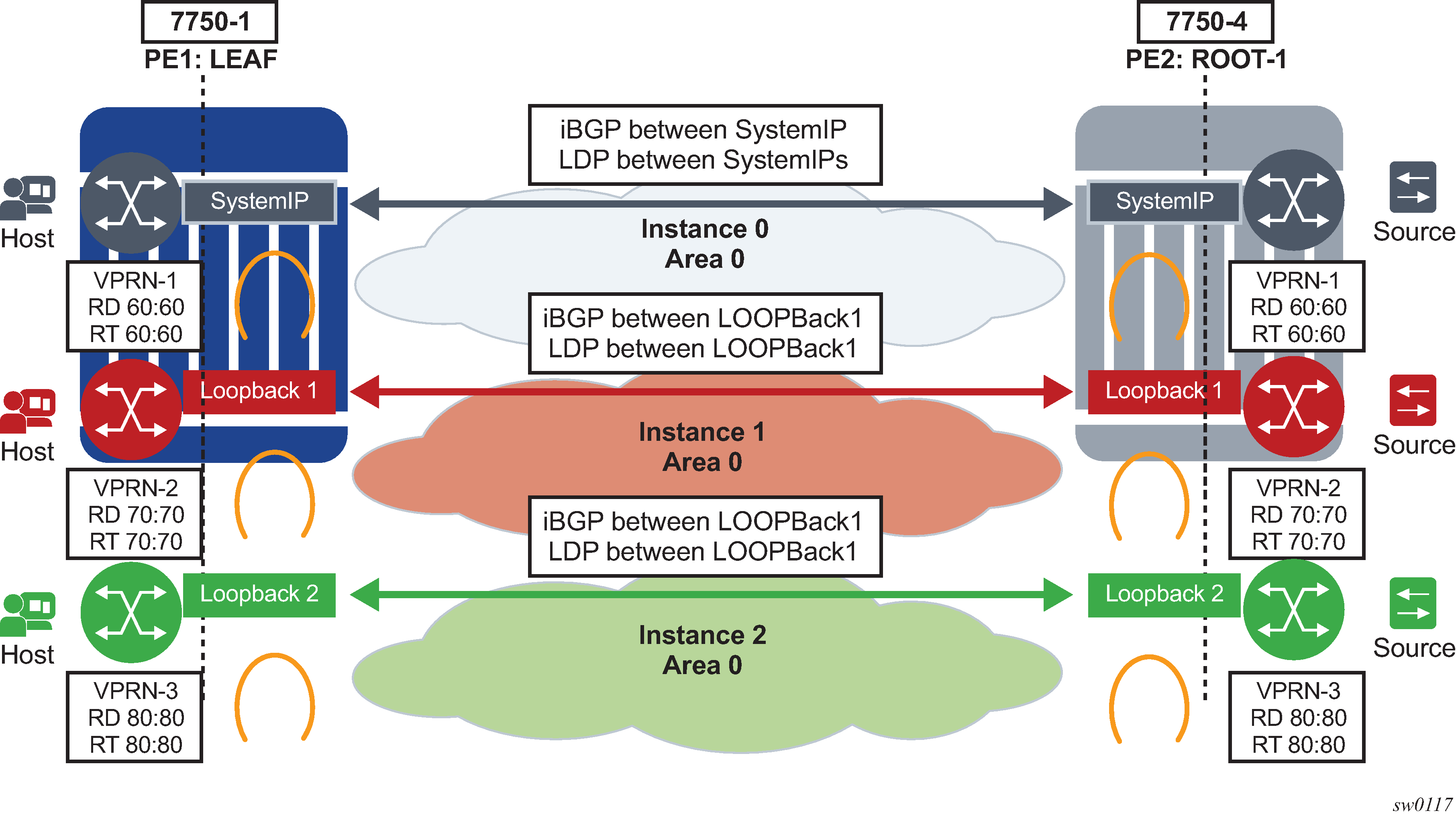Each VPN routing instance is isolated from any other VPN routing instance, and from the routing used across the backbone. OSPF can be run with any VPRN, independently of the routing protocols used in other VPRNs, or in the backbone itself. For more information about the OSPF protocol, see the 7450 ESS, 7750 SR, 7950 XRS, and VSR Router Configuration Guide.
