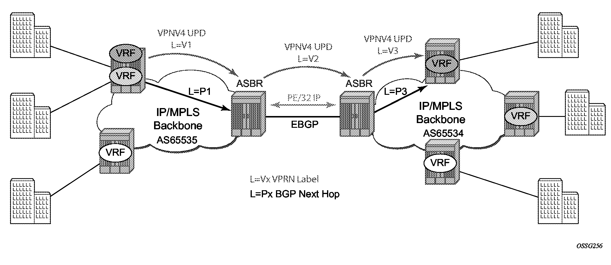 When BGP distributes a VPN route it also distributes an MPLS label for that route. On an SR series router, the method of allocating a label to a VPN route depends on the VPRN label mode and the configuration of the VRF export policy. SR series routers support three label allocation methods: label per VRF, label per next hop, and label per prefix.
