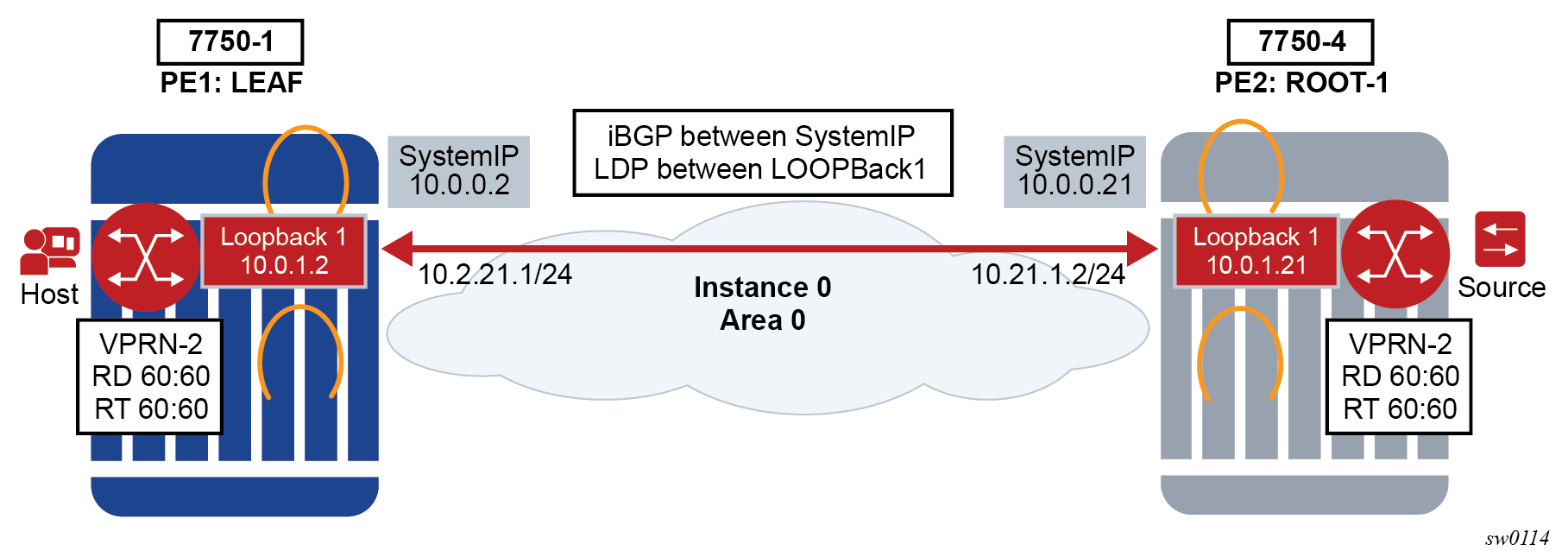 You can configure a VPRN interface as a loopback interface by issuing the loopback command instead of the sap command. The loopback flag cannot be set on an interface where a SAP is already defined and a SAP cannot be defined on a loopback interface.