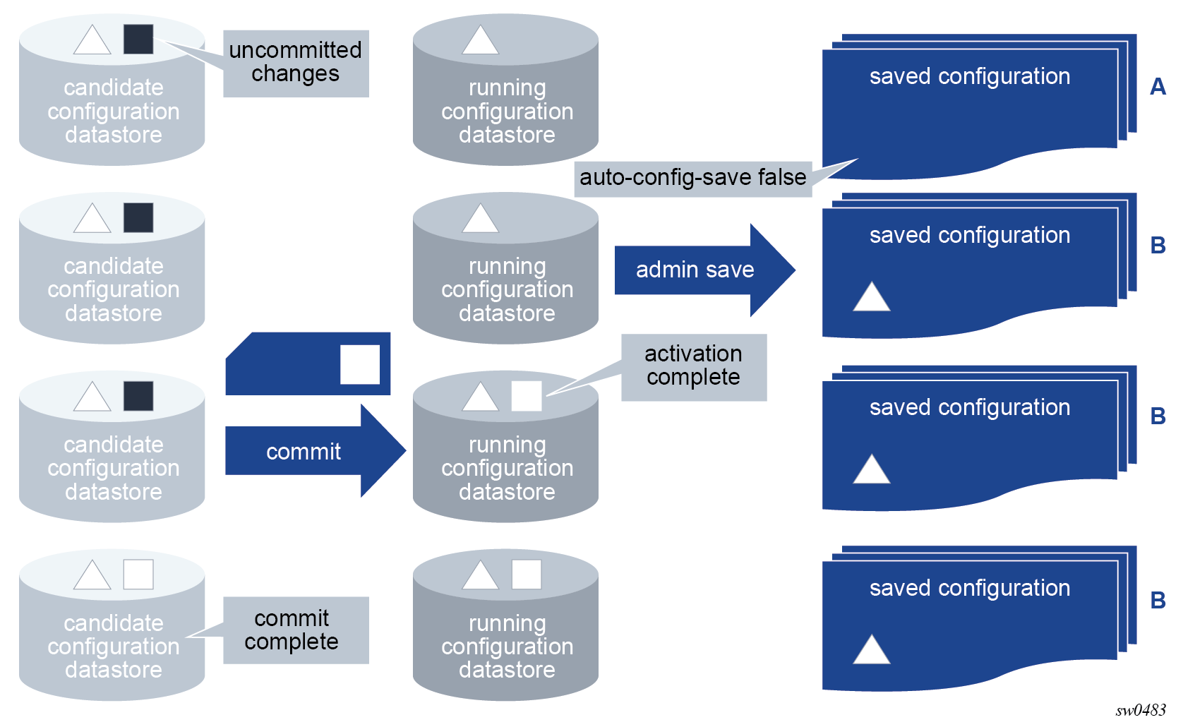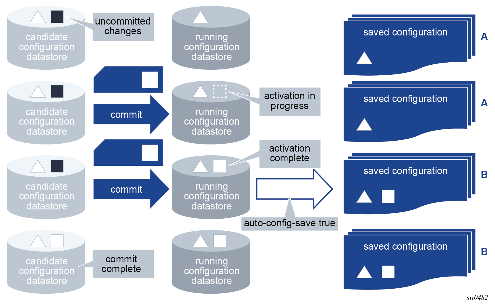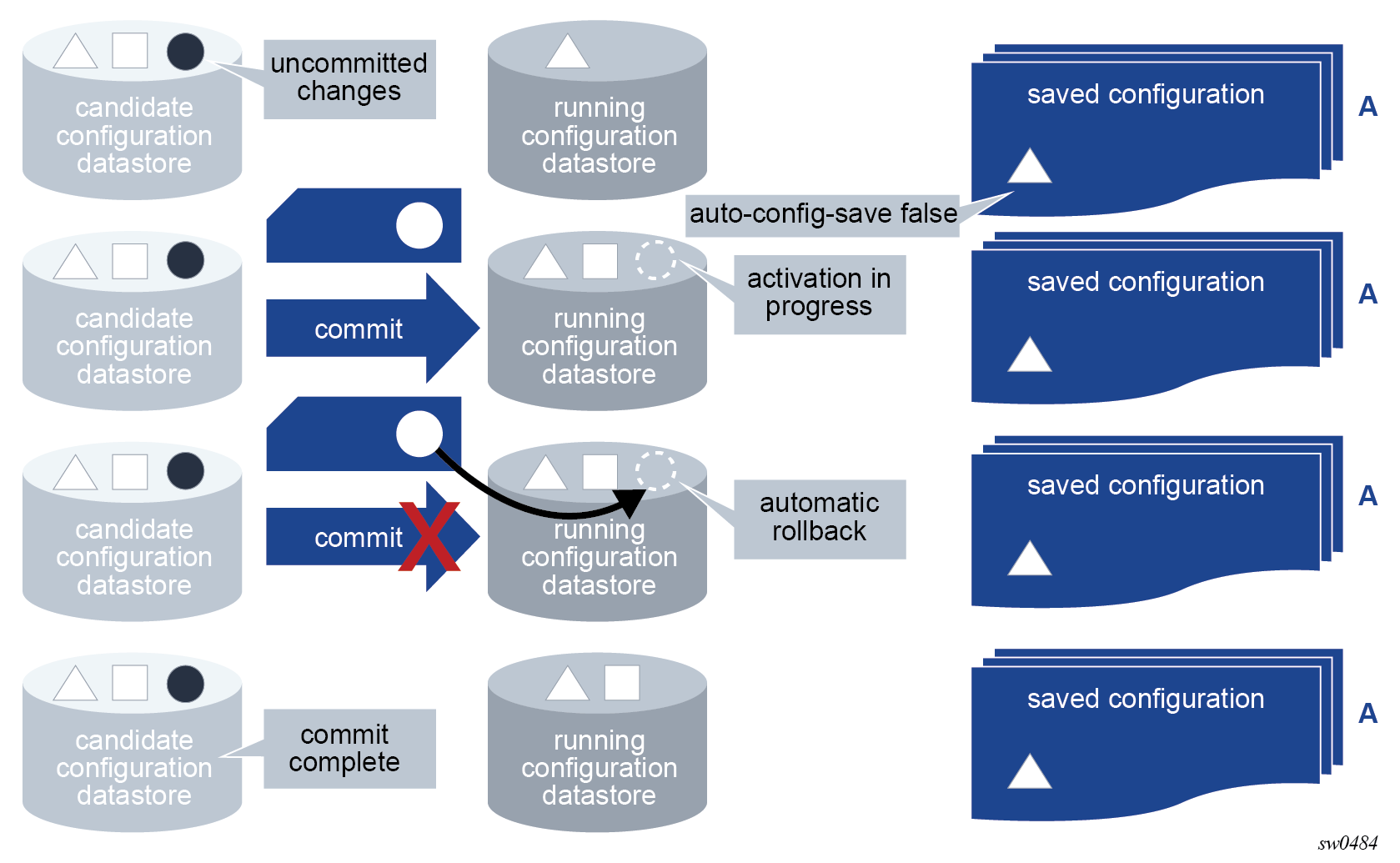 The following figure shows the flow of configuration changes from the candidate configuration to the running configuration.