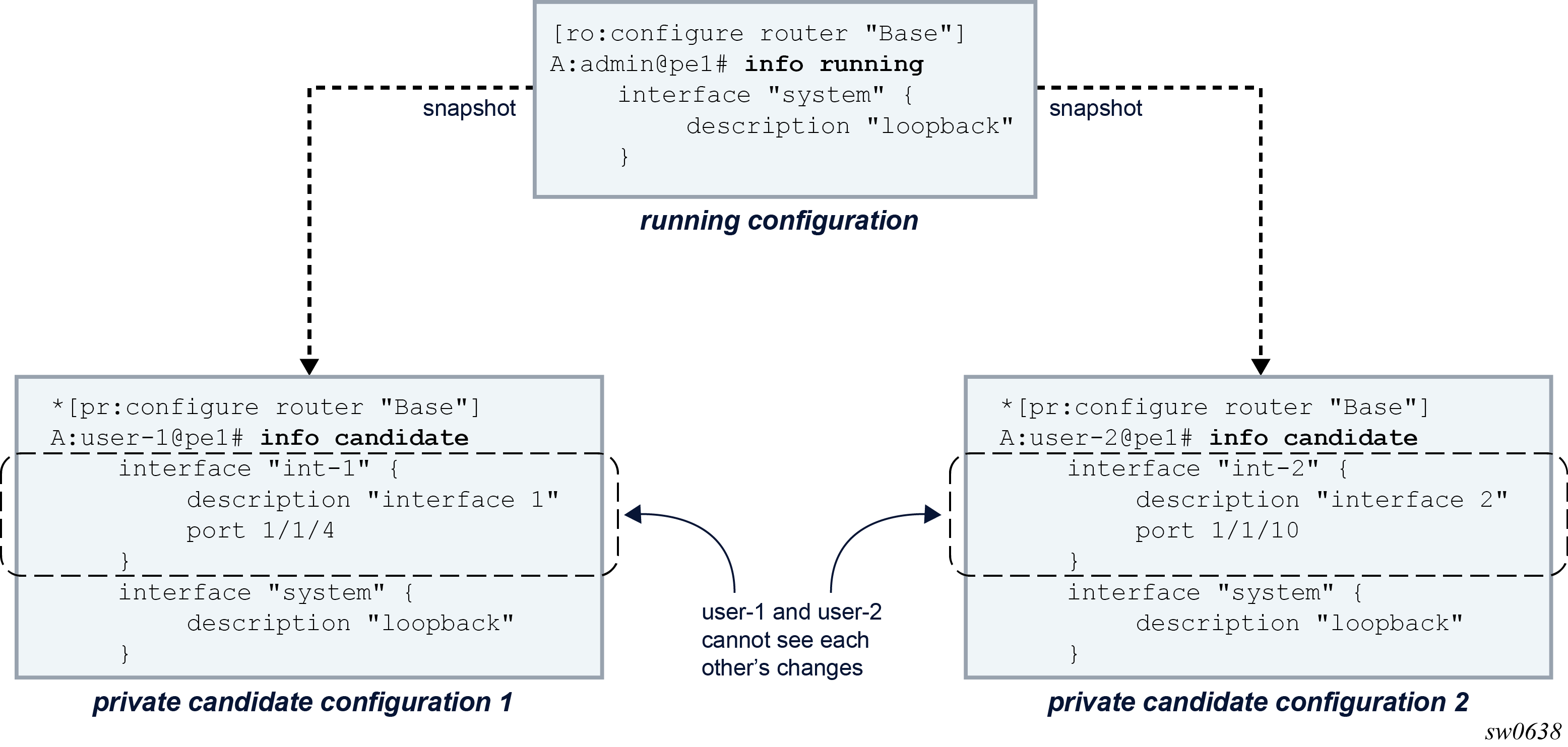 The configuration mode (private, exclusive, global, or read-only) determines the interaction with other simultaneous configuration sessions. Candidate configuration modes are detailed in Candidate configuration modes.
