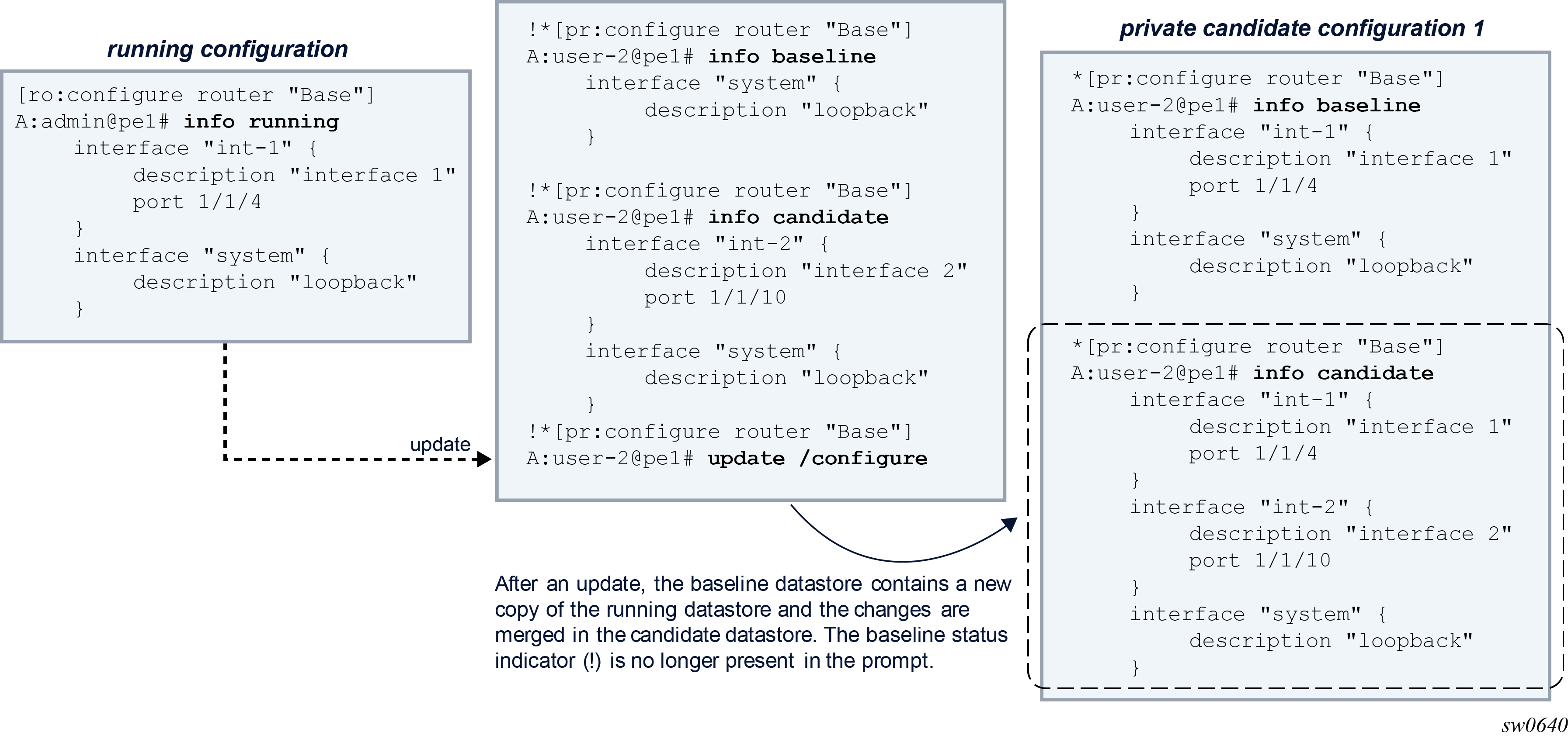 At login, an MD-CLI session always starts in operational mode. To configure the router, the user must enter a configuration mode using the explicit or implicit configuration workflow.