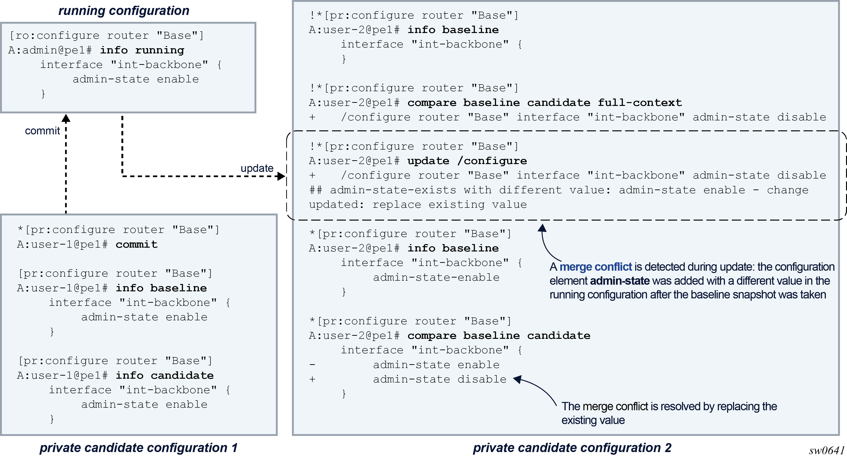 An MD-CLI session in exclusive configuration mode acquires an explicit lock for both the global candidate and running configuration datastores. This is achieved by executing the configure exclusive command (in the implicit configuration workflow) or the edit-config exclusive command (in the explicit configuration workflow).