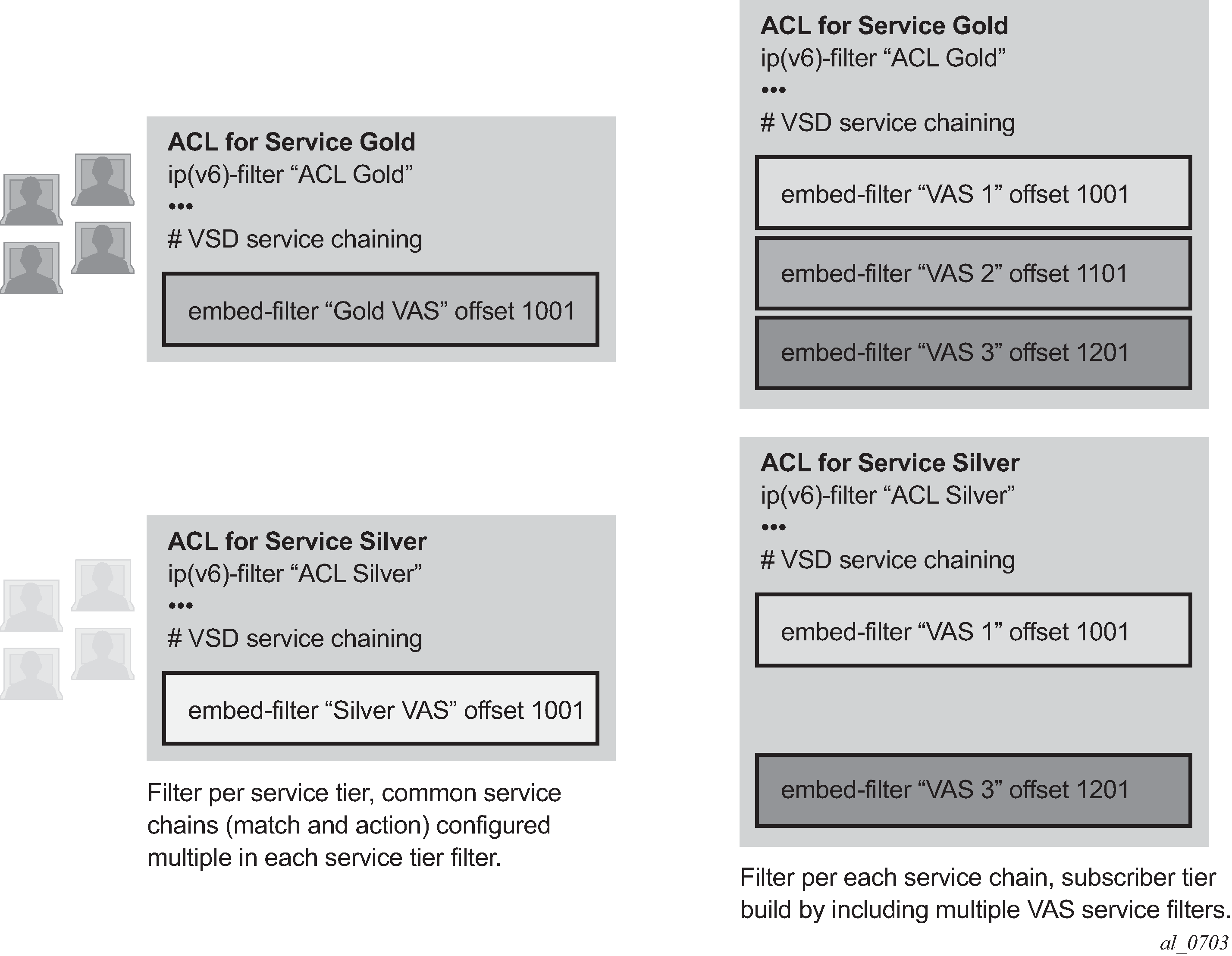 ACL filter policies, also referred to as Access Control Lists (ACLs) or just ‟filters”, are sets of ordered rule entries specifying packet match criteria and actions to be performed to a packet upon a match. Filter policies are created with a unique filter ID and filter name. The filter name needs to be assigned during the creation of the filter policy. If a name is not specified at creation time, then SR OS assigns a string version of the filter ID as the name.