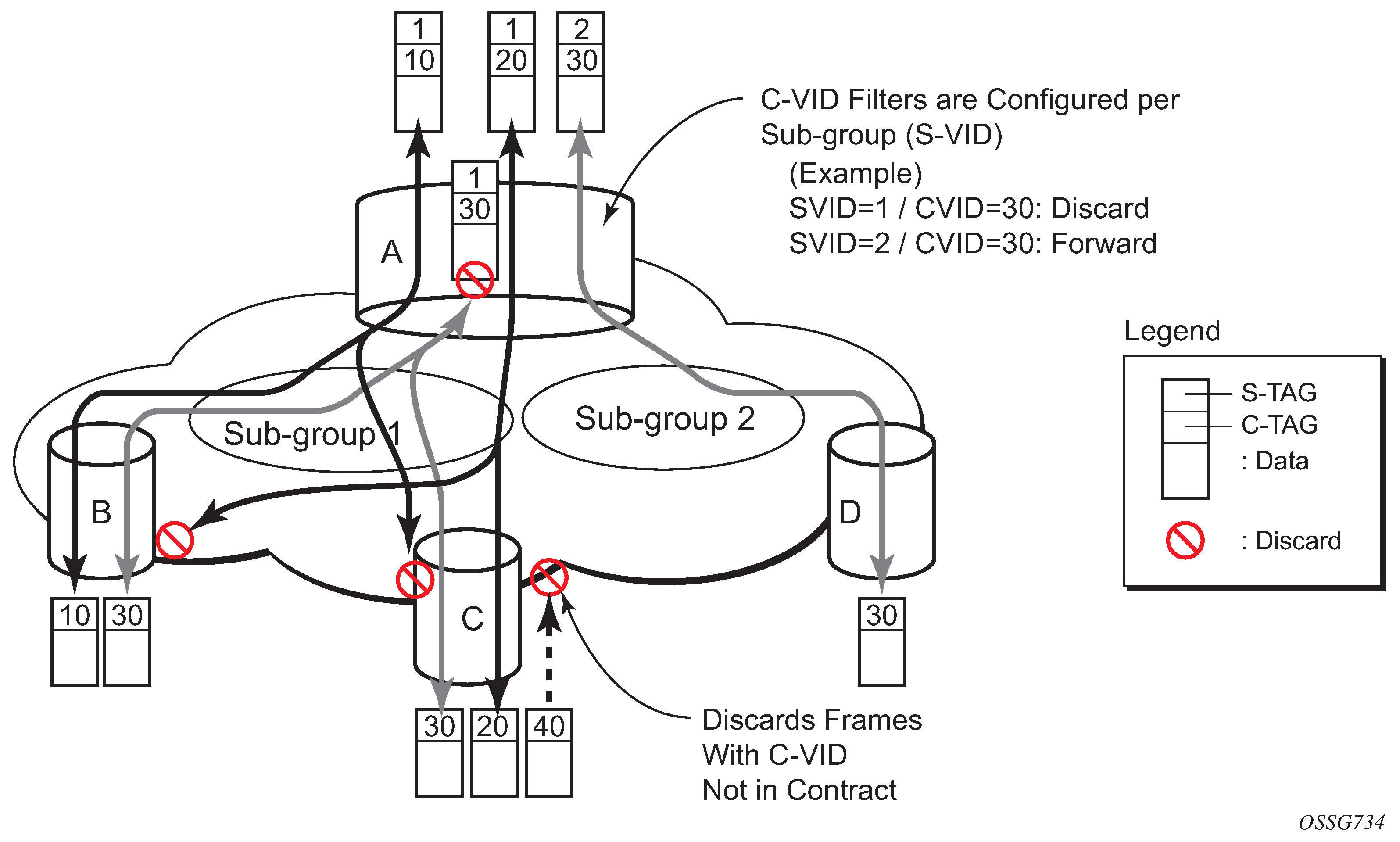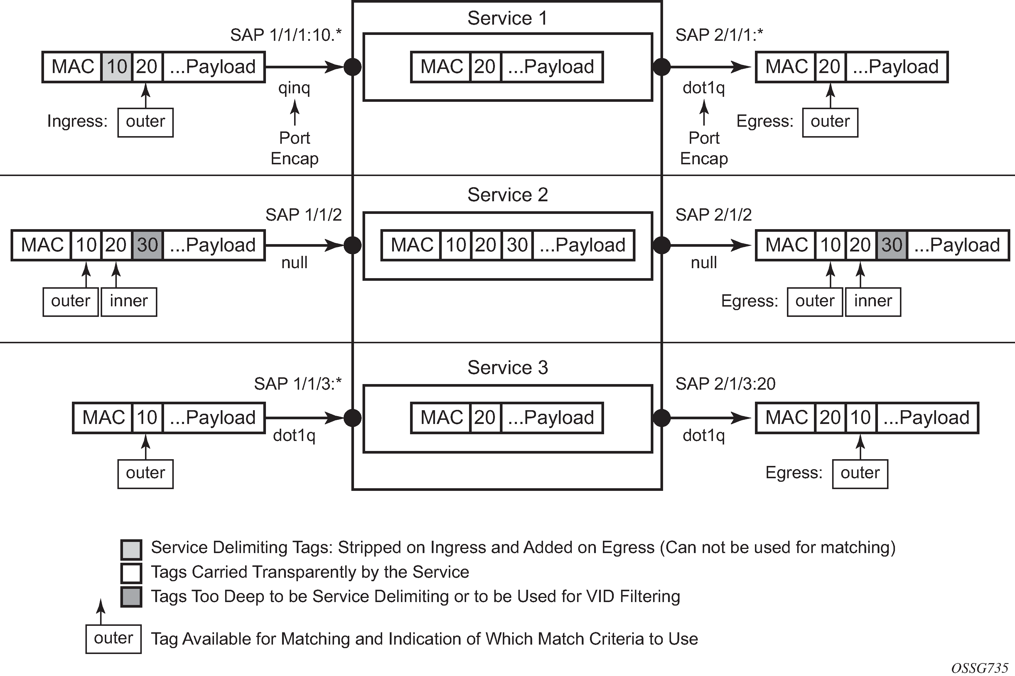The following list describes the MAC match criteria supported by SR OS or switches for all types of MAC filters (normal, ISID, and VID). The criteria are evaluated against the Ethernet header of the Ethernet frame. Support for match criteria may depend on H/W or filter direction as described in the following description. Match criteria is blocked if it is not supported by a specified frame-type or MAC filter type. Nokia recommends not configuring a filter in a direction or on hardware where a match condition is not supported as this may lead to unwanted behavior.