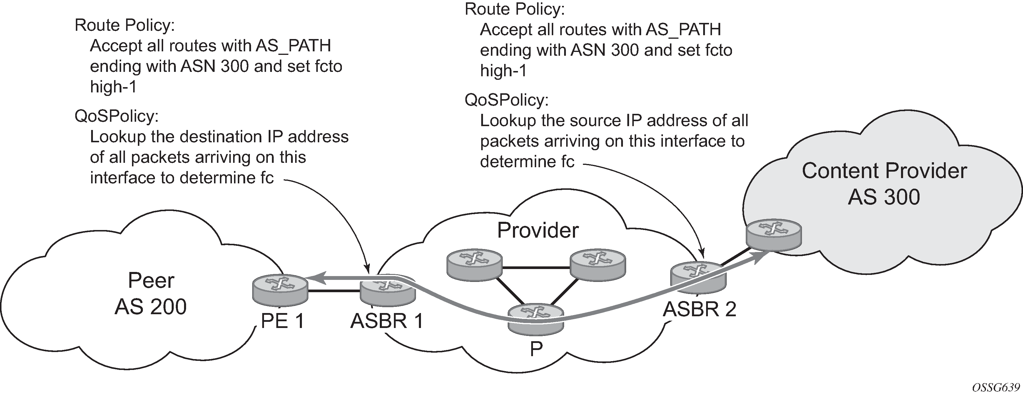 Use of QPPB to differentiate traffic in an ISP network shows an example of an ISP that has an agreement with the content provider managing AS300 to provide traffic sourced and terminating within AS300 with differentiated service appropriate to the content being transported. In this example, ASBR1 and ASBR2 mark the DSCP of packets terminating and sourced, respectively, in AS300 so that other nodes within the ISP’s network do not need to rely on QPPB to determine the correct forwarding-class to use for the traffic. The DSCP or other CoS markings could be left unchanged in the ISP’s network and QPPB used on every node.