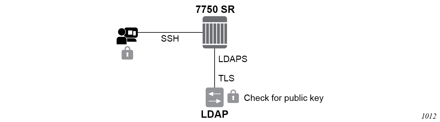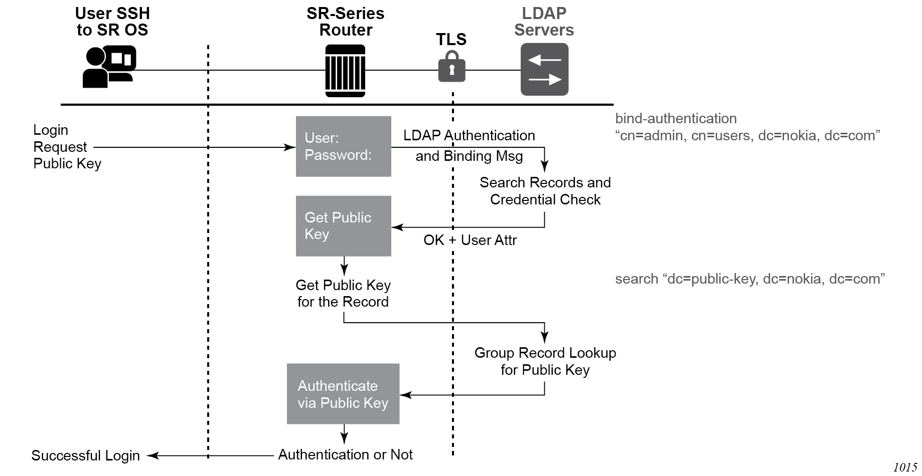 Lightweight Directory Access Protocol (LDAP) can provide authentication, authorization, accounting (AAA) functionality, and can allow users to access the full virtualized data center and networking devices. SR OS currently supports LDAP provision of a centralized authentication method with public key management. The authentication method is based on SSH public keys or keyboard authentication (username, password).