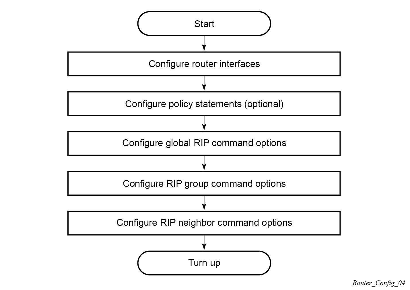 After the RIP protocol instance is created, the no shutdown command is not required because RIP is administratively enabled upon creation. To enable RIP on a router, at least one group and one neighbor must be configured. There are no default groups or neighbors. Each group and neighbor must be explicitly configured.