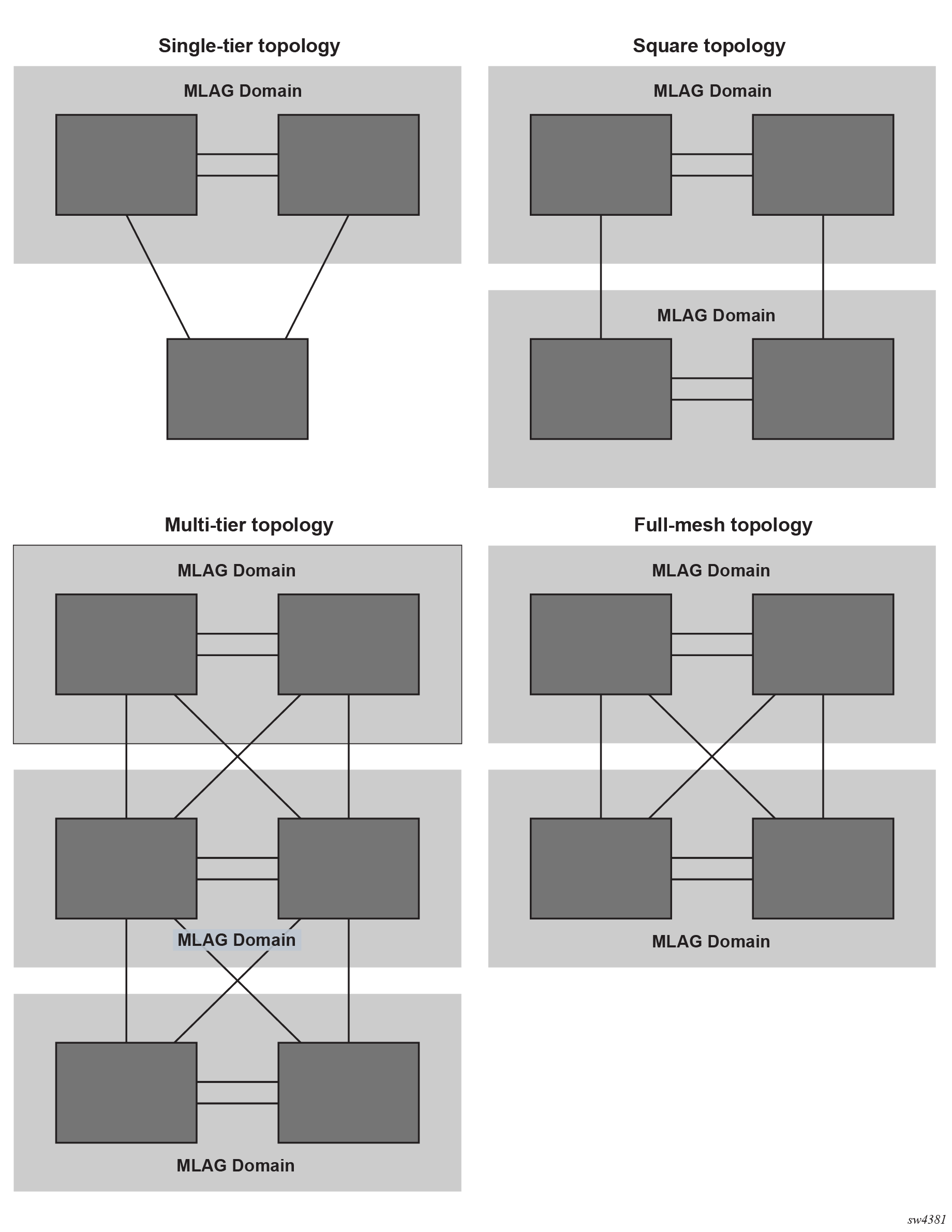 In this configuration, EVPN provides an alternative to MC-LAG solutions, being able to match all the topologies that other MC-LAG solutions support. These topologies include single-tier, multi-tier, square, or full-mesh/bow-tie topologies, as shown in the following figure. EVPN multihoming is supported in all of them as a replacement of MC-LAG.