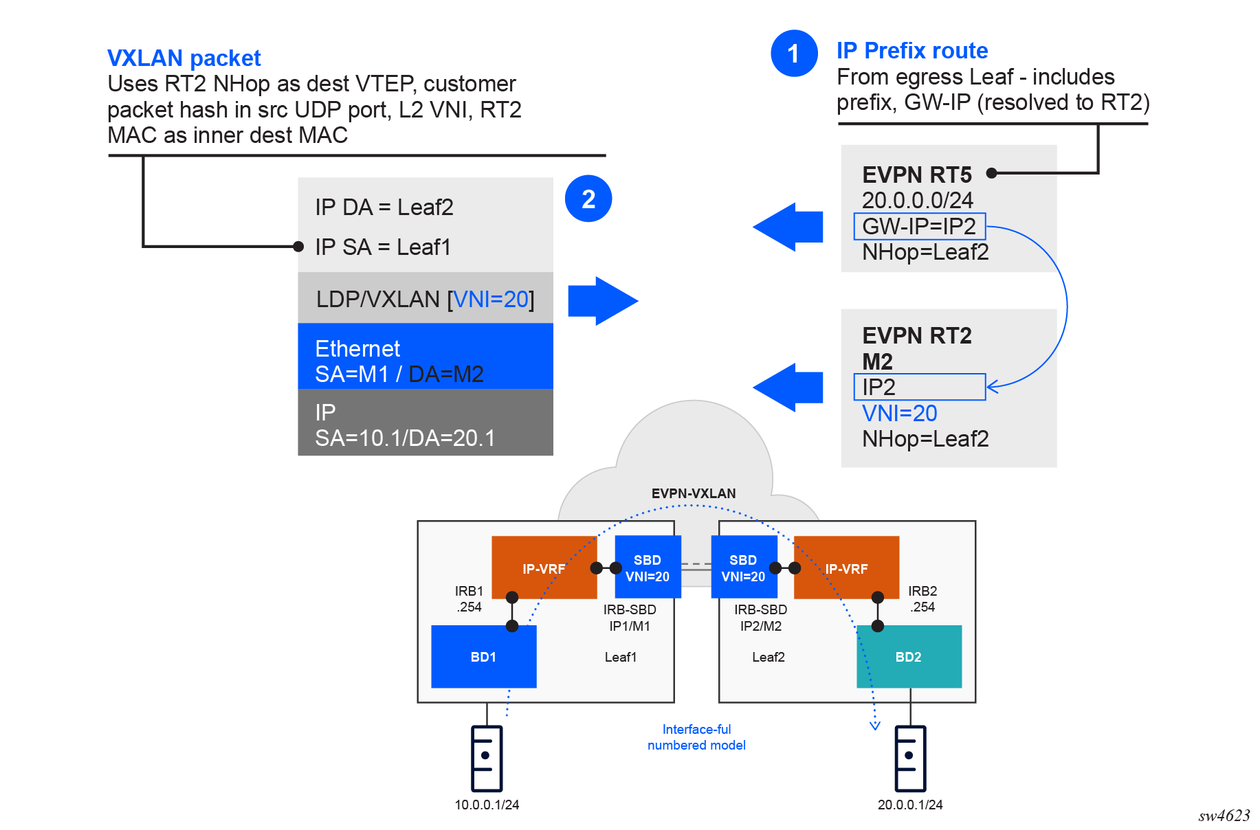 SR Linux support for symmetric IRB includes the prefix routing model using RT5s as in RFC 9136, including the interface-less IP-VRF-to-IP-VRF model (EVPN IFL model).