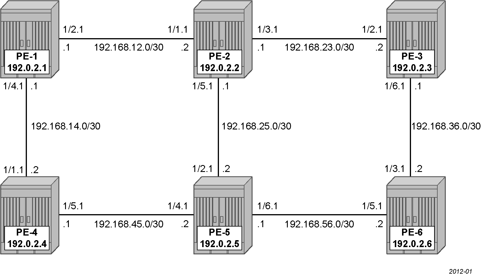 IS-IS is configured on all interfaces. On PE-1, the initial configuration is the following: