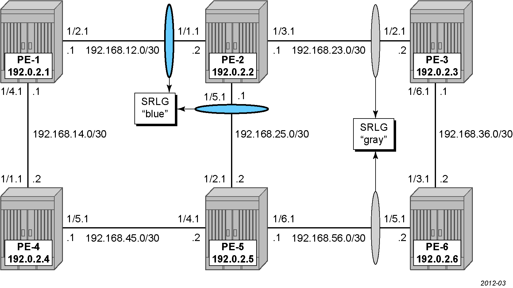 The configuration of the srlg-blue group is only mandatory on PE-1, PE-2, and PE-5, while the srlg-gray group is only mandatory on PE-2, PE-3, PE-5, and PE-6. However, it is good practice to configure both SRLG groups on all nodes, as follows: