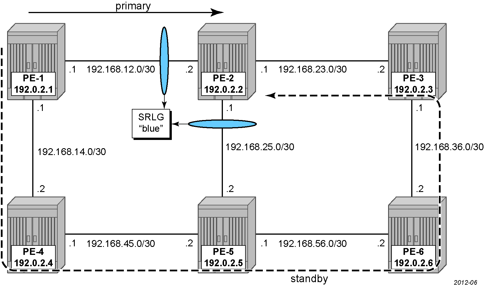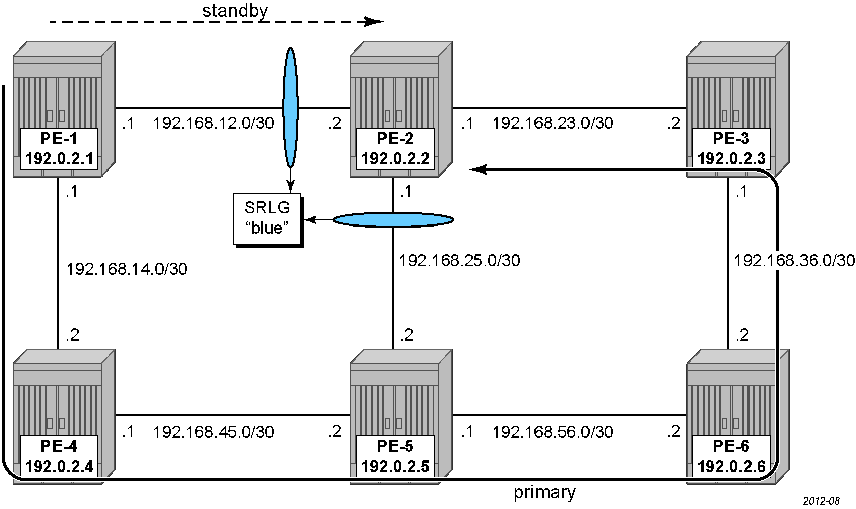 The primary path has the constraint not to use any TE interfaces in srlg-blue and is represented by the dashed line from PE-1 over PE-4, PE-5, PE-6, and PE-3 to PE-2, while the standby path has the constraint not to use any interfaces in an SRLG used by the primary path and it takes the direct link from PE-1 to PE-2.