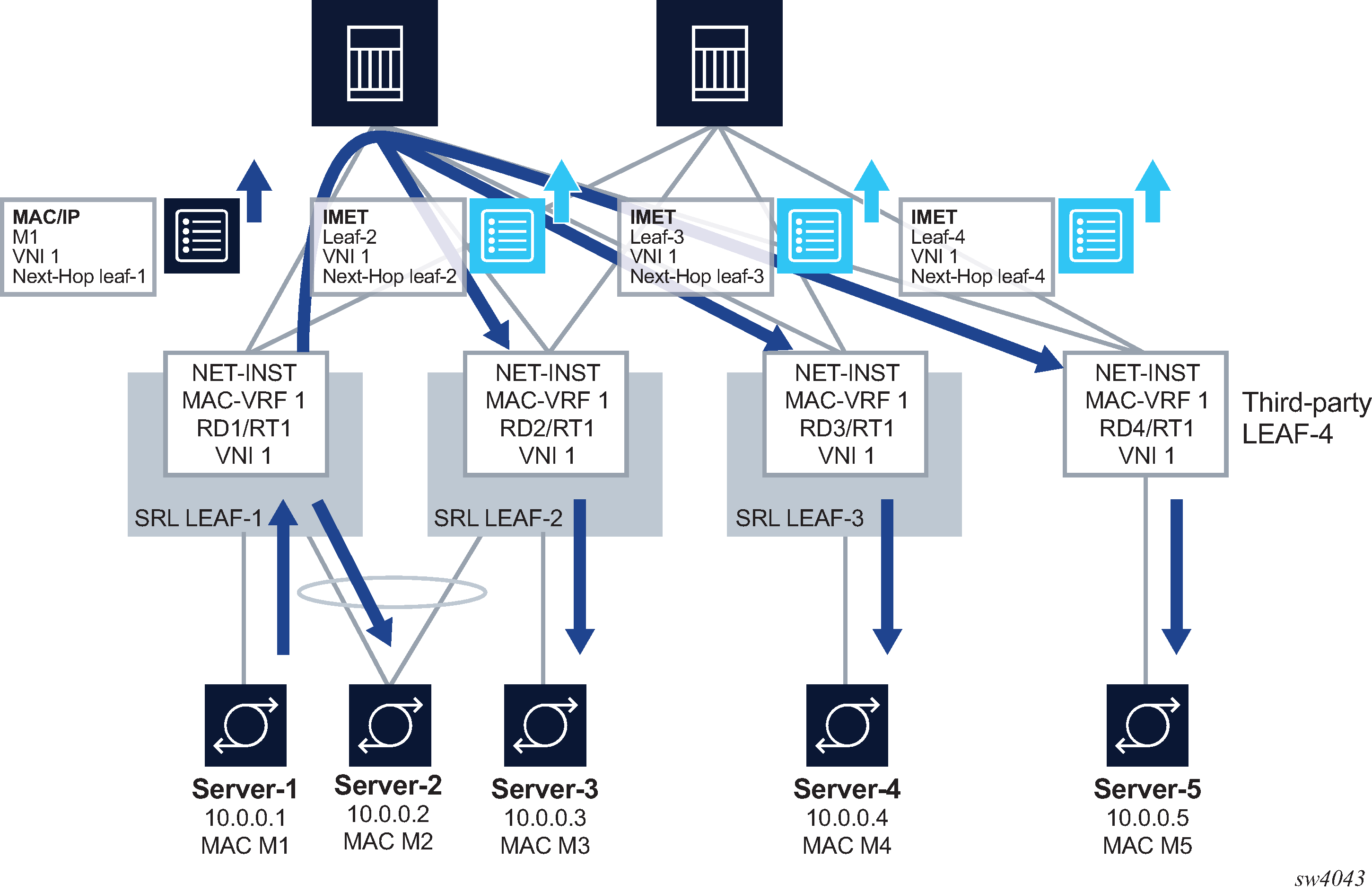 The following diagram shows this concept. In this example, four leaf routers are attached to the same BD that is instantiated by a MAC-VRF on each leaf. SR Linux leaf routers support standard-based EVPN-VXLAN [RFC8365]; therefore third-party leaf routers (LEAF-4 in this example) can be attached to the same BD as the SR Linux leaf routers as long as they follow standard [RFC8365].