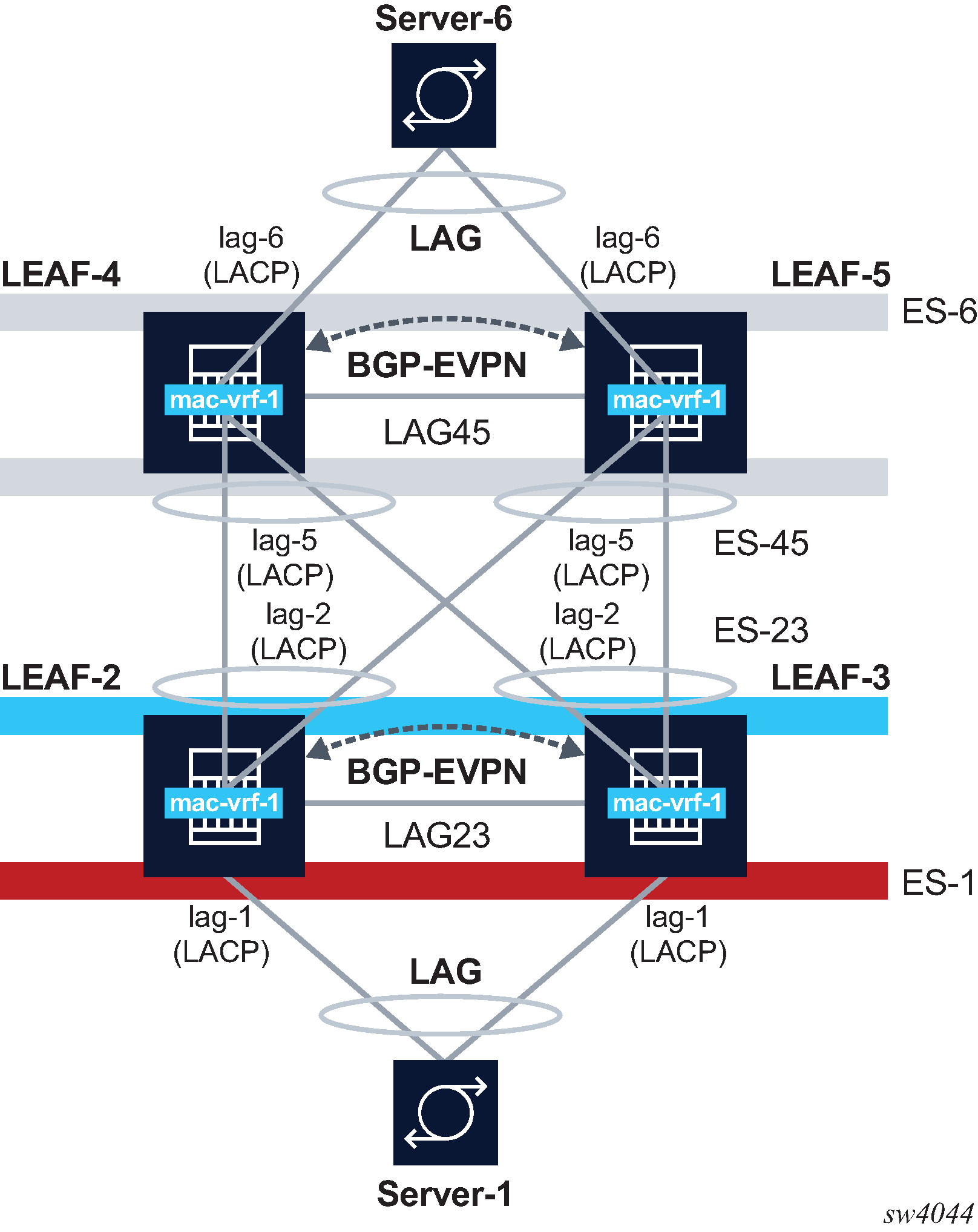 Note that LEAF-2 should have a type 4 route for the ES originating from LEAF-4. There should also be one AD per EVI and one AD per ES route from LEAF-4 for MAC-VRF-1. AD routes are advertised for each MAC-VRF that are part of the ES.