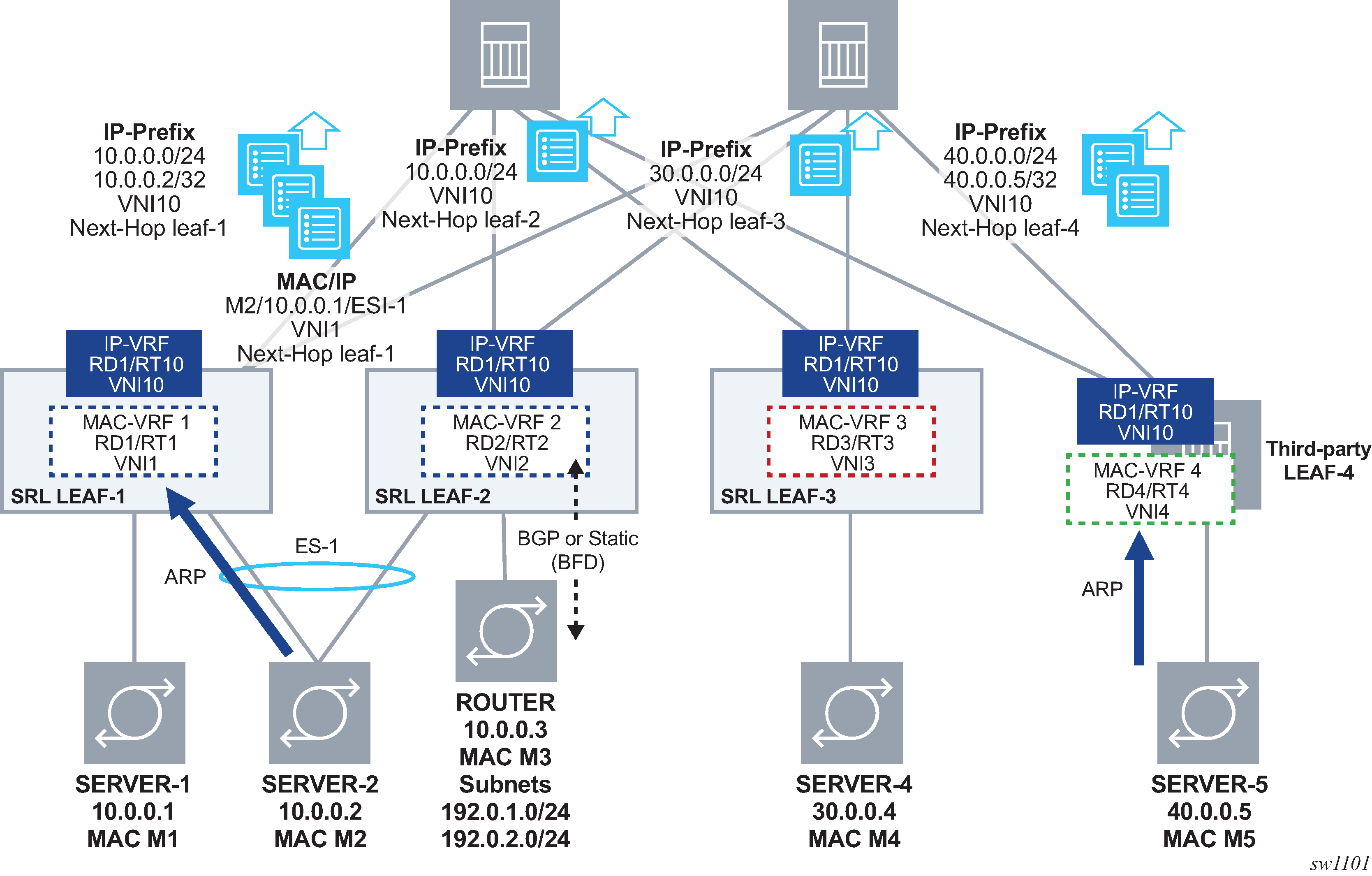 The following figure shows the configuration of an EVPN-VXLAN IP-VRF-10 distributed in three leaf routers, with different subnets, and multi-homing for SERVER-1.
