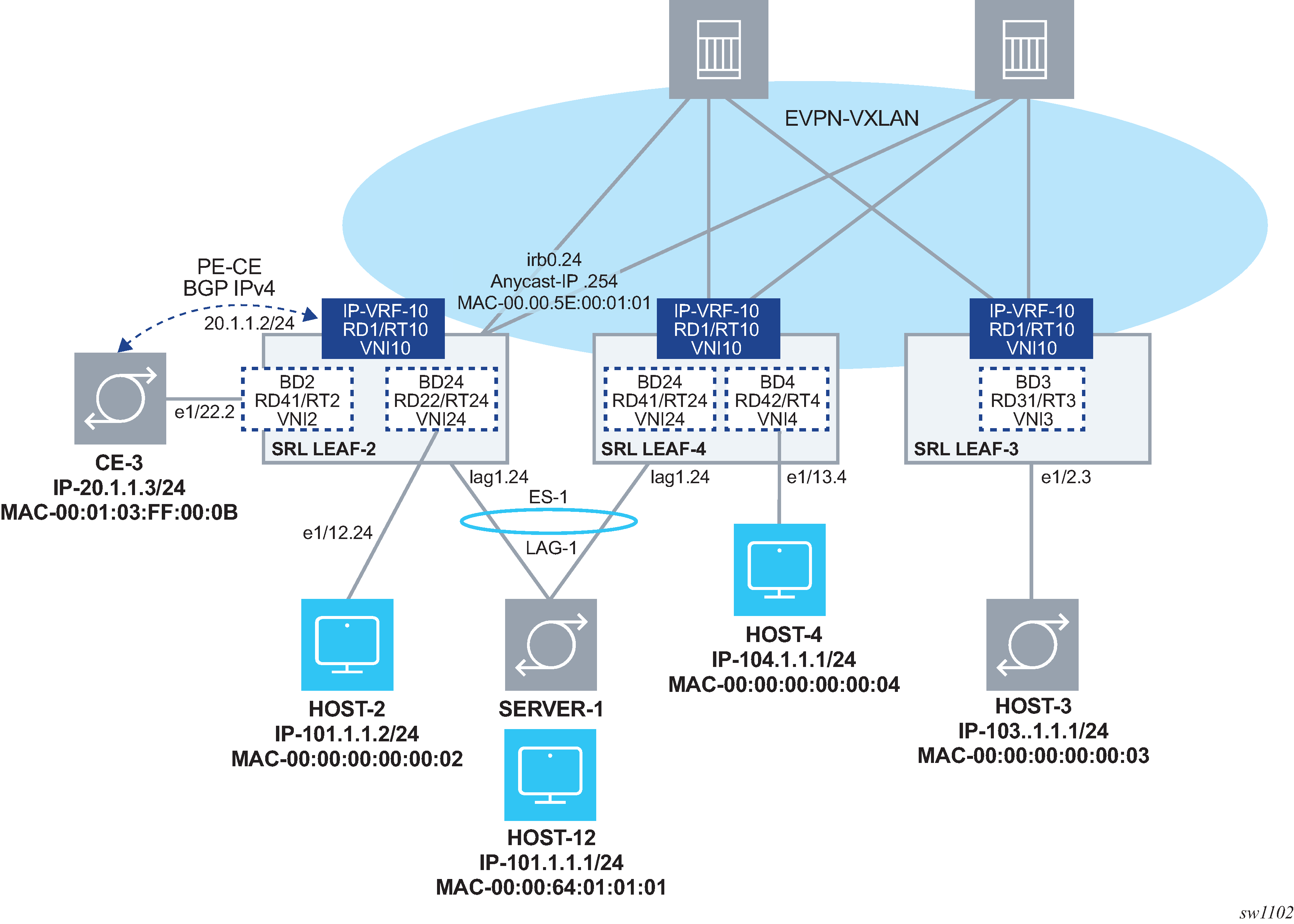 // MAC-VRFs in Leaf-2 --{ [FACTORY] + candidate shared default }--[ network-instance BD* ]-- # info network-instance BD2 { type mac-vrf interface ethernet-1/22.2 { } interface irb0.2 { } vxlan-interface vxlan1.2 { } protocols { bgp-evpn { bgp-instance 1 { admin-state enable vxlan-interface vxlan1.2 evi 2 ecmp 2 } } bgp-vpn { bgp-instance 1 { route-target { export-rt target:64500:2 import-rt target:64500:2 } } } } } network-instance BD24 { type mac-vrf interface ethernet-1/12.24 { } interface irb0.24 { } interface lag1.24 { } vxlan-interface vxlan1.24 { } protocols { bgp-evpn { bgp-instance 1 { admin-state enable vxlan-interface vxlan1.24 evi 24 ecmp 2 } } bgp-vpn { bgp-instance 1 { route-target { export-rt target:64500:24 import-rt target:64500:24 } } } } } // MAC-VRFs in Leaf-4 --{ [FACTORY] + candidate shared default }--[ network-instance BD* ]-- # info network-instance BD24 { type mac-vrf interface irb0.24 { } interface lag1.24 { } vxlan-interface vxlan1.24 { } protocols { bgp-evpn { bgp-instance 1 { admin-state enable vxlan-interface vxlan1.24 evi 24 ecmp 2 } } bgp-vpn { bgp-instance 1 { route-target { export-rt target:64500:24 import-rt target:64500:24 } } } } } network-instance BD4 { type mac-vrf interface ethernet-1/13.4 { } interface irb0.4 { } vxlan-interface vxlan1.4 { } protocols { bgp-evpn { bgp-instance 1 { admin-state enable vxlan-interface vxlan1.4 evi 4 ecmp 2 } } bgp-vpn { bgp-instance 1 { route-target { export-rt target:64500:4 import-rt target:64500:4 } } } } } -