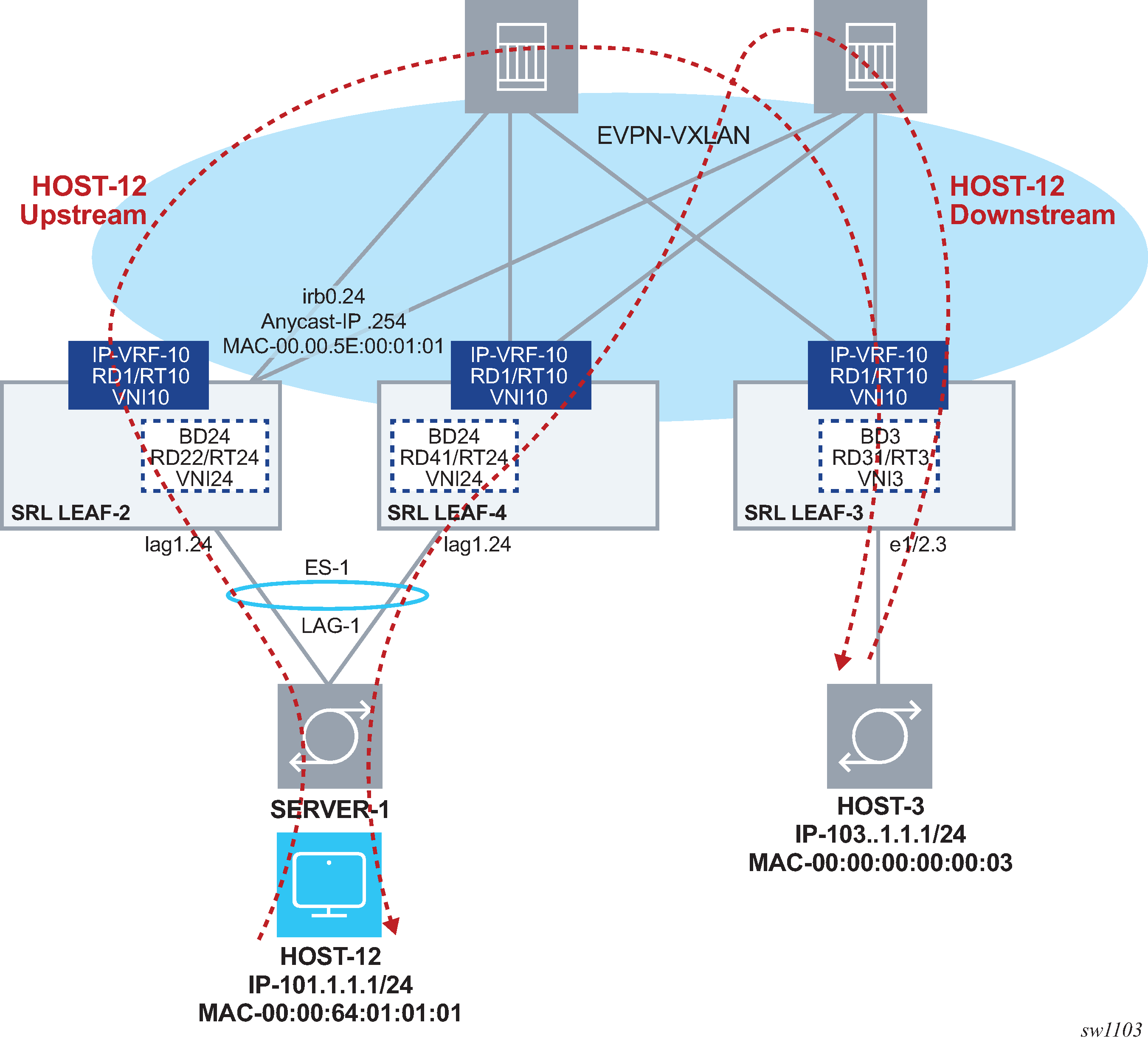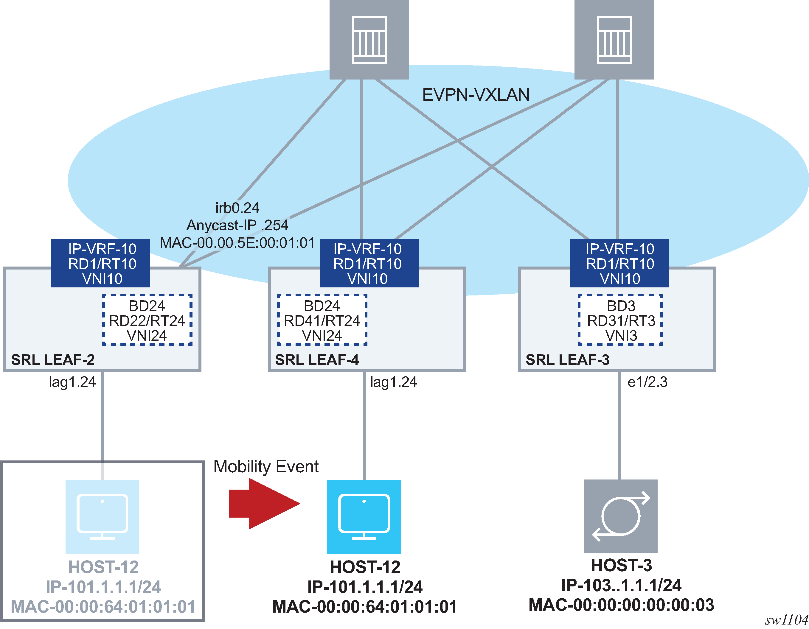 All the hosts attached to the same BD use the same default-gateway (that is, the anycast-gw IP) irrespective of the leaf they are connected to. For example, irb0 subinterfaces 24 are configured with the same anycast-gw IP on LEAF-2 and LEAF-4 (101.1.1.254) in the configuration example.